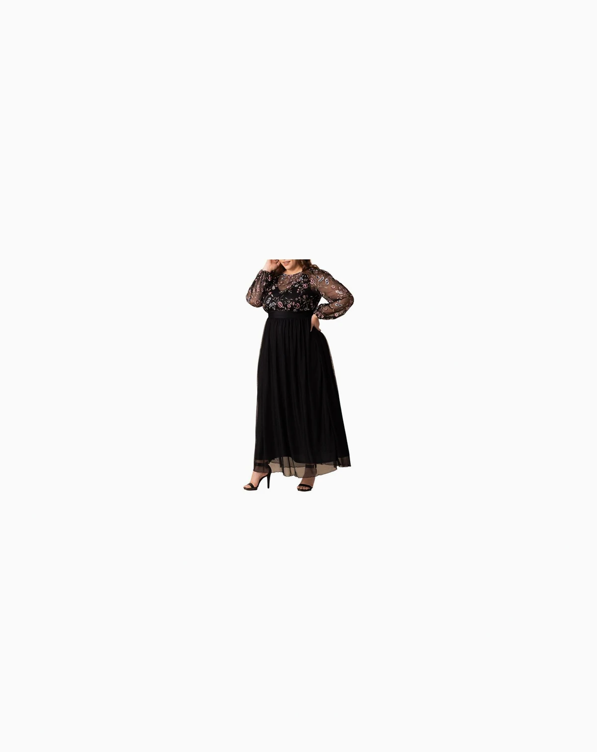 Elevate your evening look with the Plus Size Eternal Mixed Media Evening Gown, a breathtaking choice for any special occasion. This long, formal maxi dress features an embroidered mesh bodice with a classic boat neckline and sheer long sleeves with elastic cuffs. A ruched mesh waistband defines your curves, while the flowing mesh skirt adds elegance with every step.
