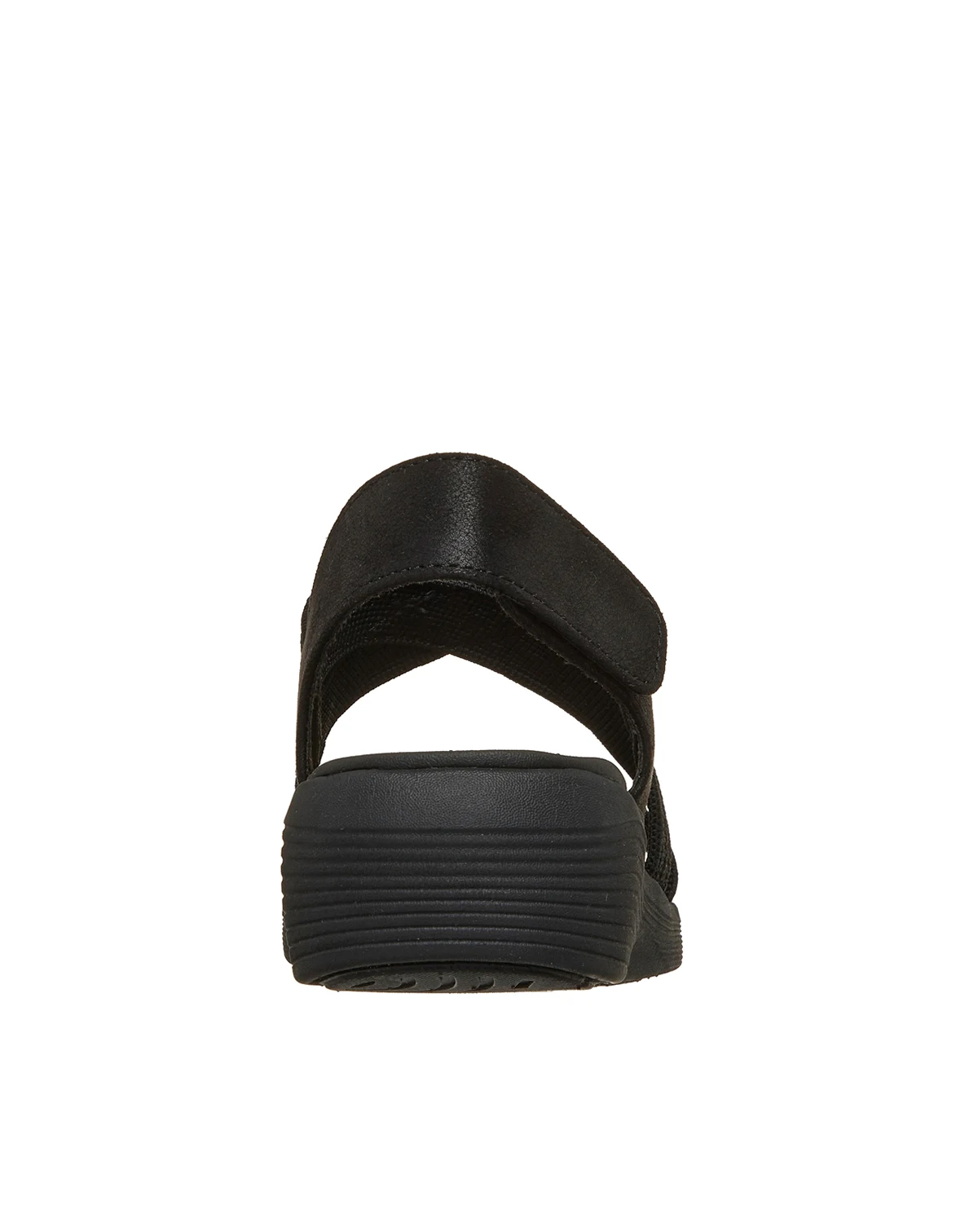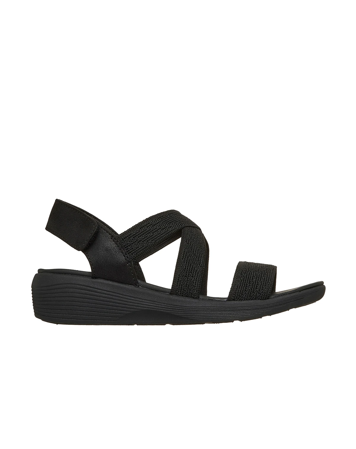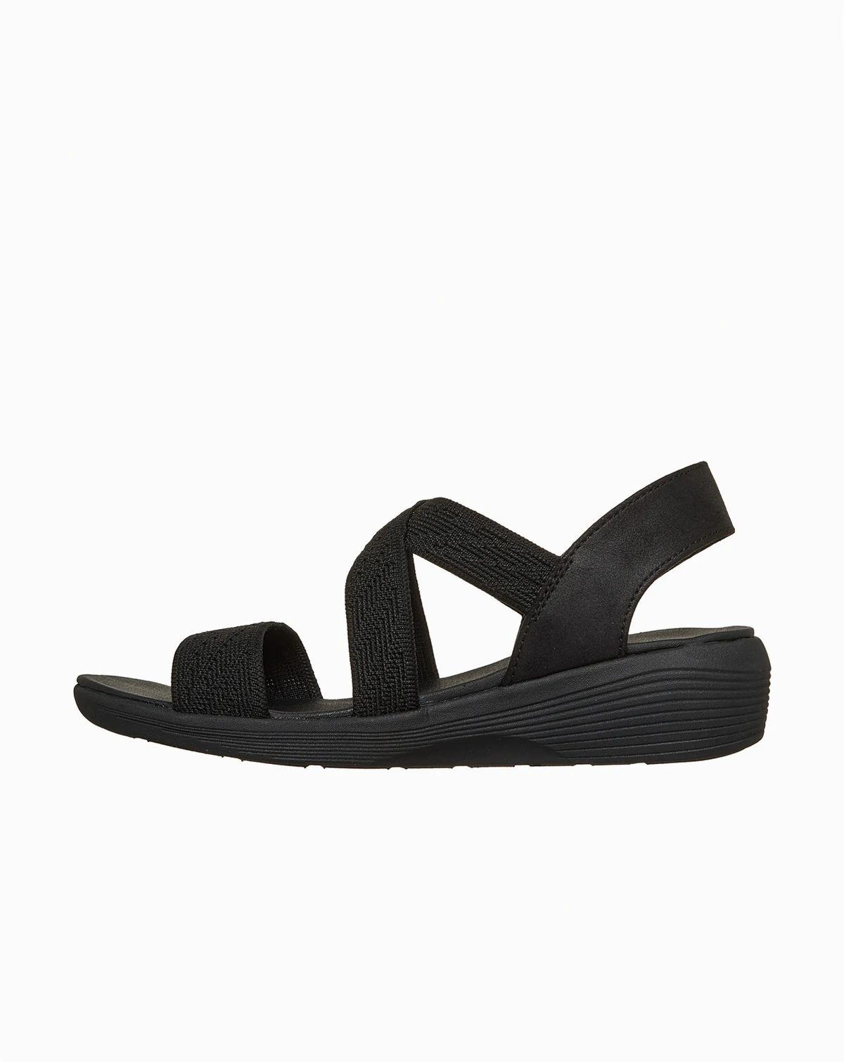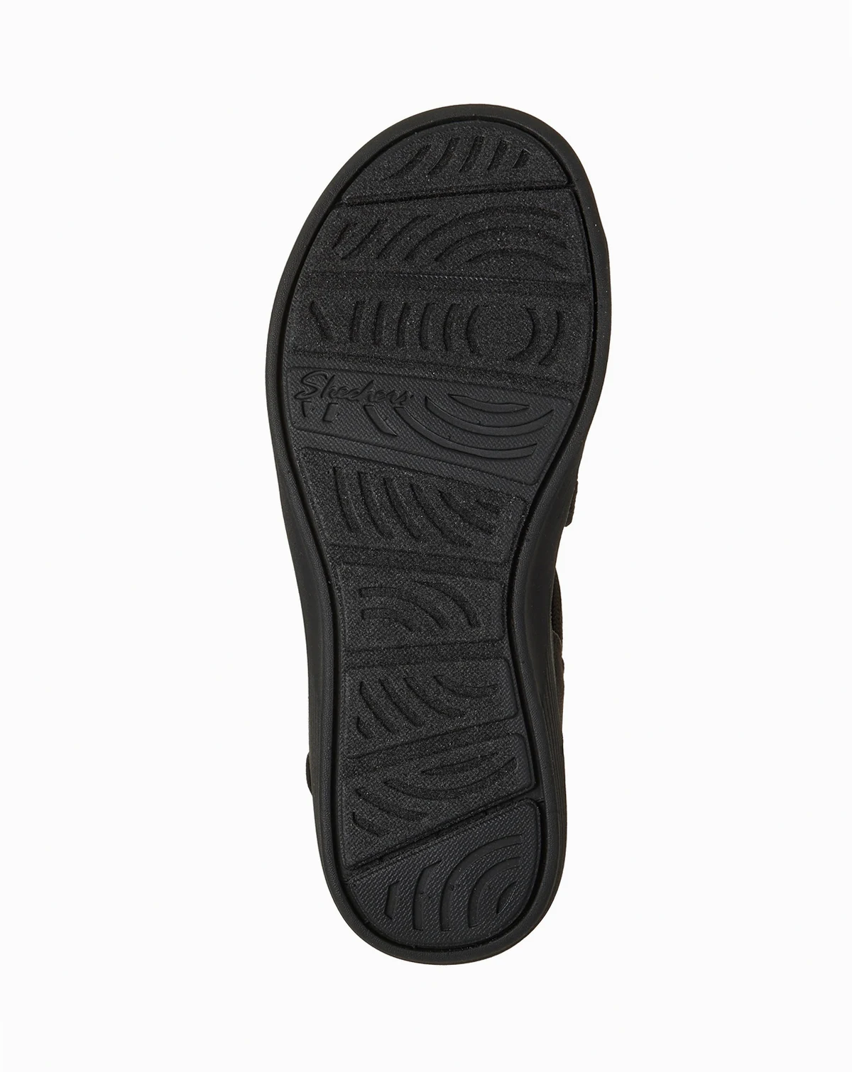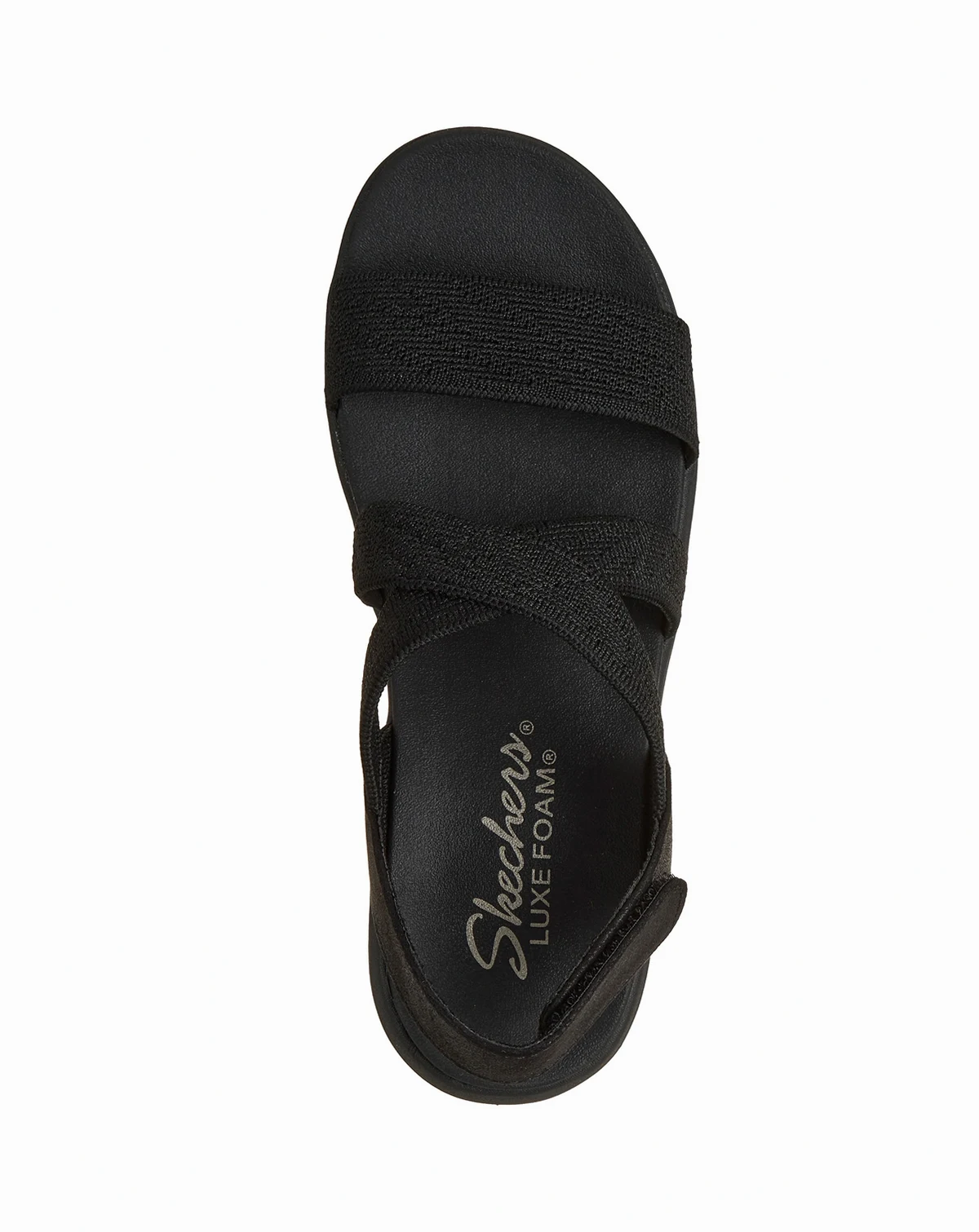 Parade around in the plush comfort of these Skechers Women's Arya - Very Mindful Slingback Sandals. This strappy silhouette is crafted with a high-shine knit upper and is equipped with cushy Luxe Foam footbeds and an adjustable heel strap for a lofty, laid-back look.