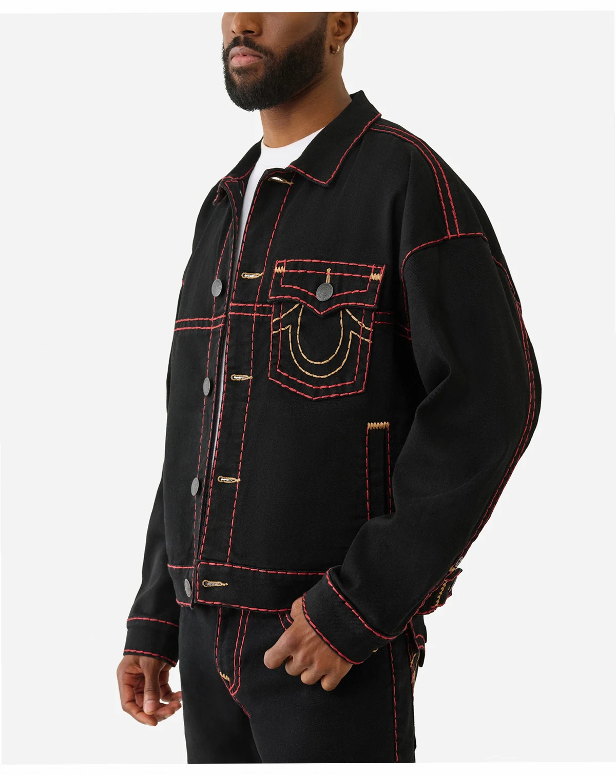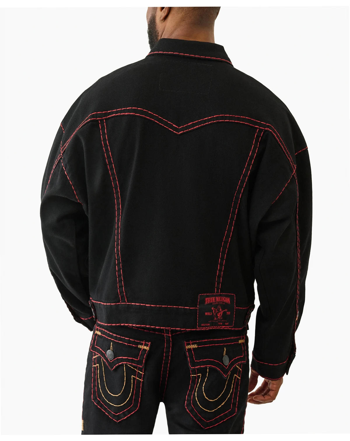Boxy and bold, this cropped denim jacket from True Religion is a streetwear essential. Super T stitching and horseshoe detailing bring signature flair to the look. Slanted front pockets add a cool edge while keeping essentials close.