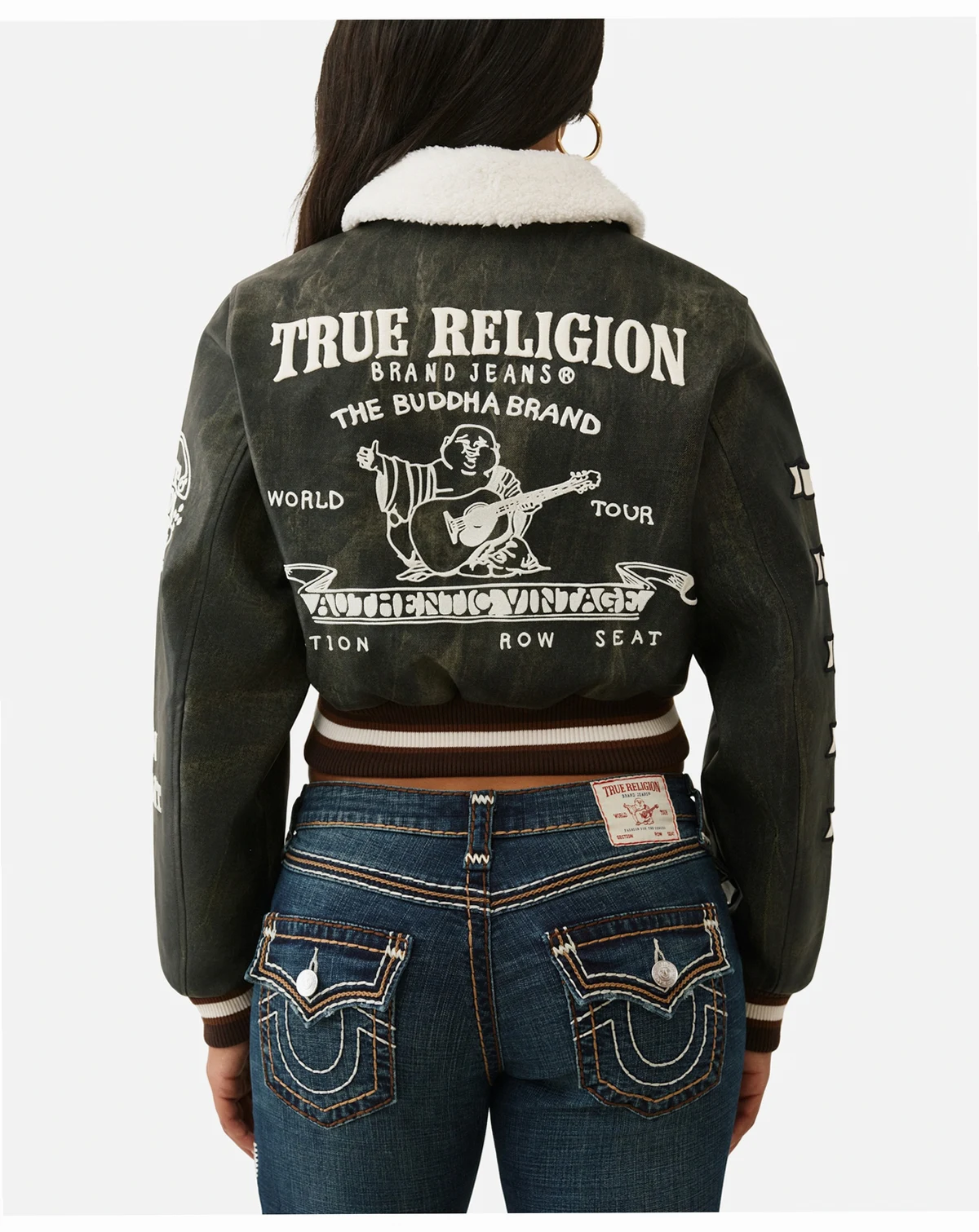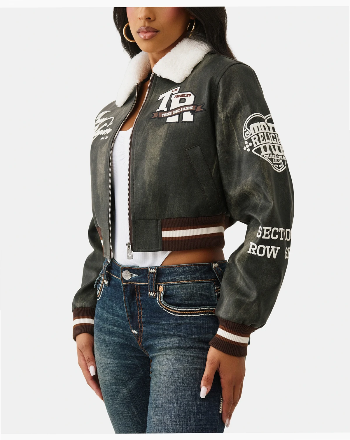 Take your fit to new heights in the Sherpa Aviator Jacket. Designed in a cropped fit, it features a sherpa-lined collar, washed leather exterior, striped trim, and branded patches on the chest, sleeves, and back.