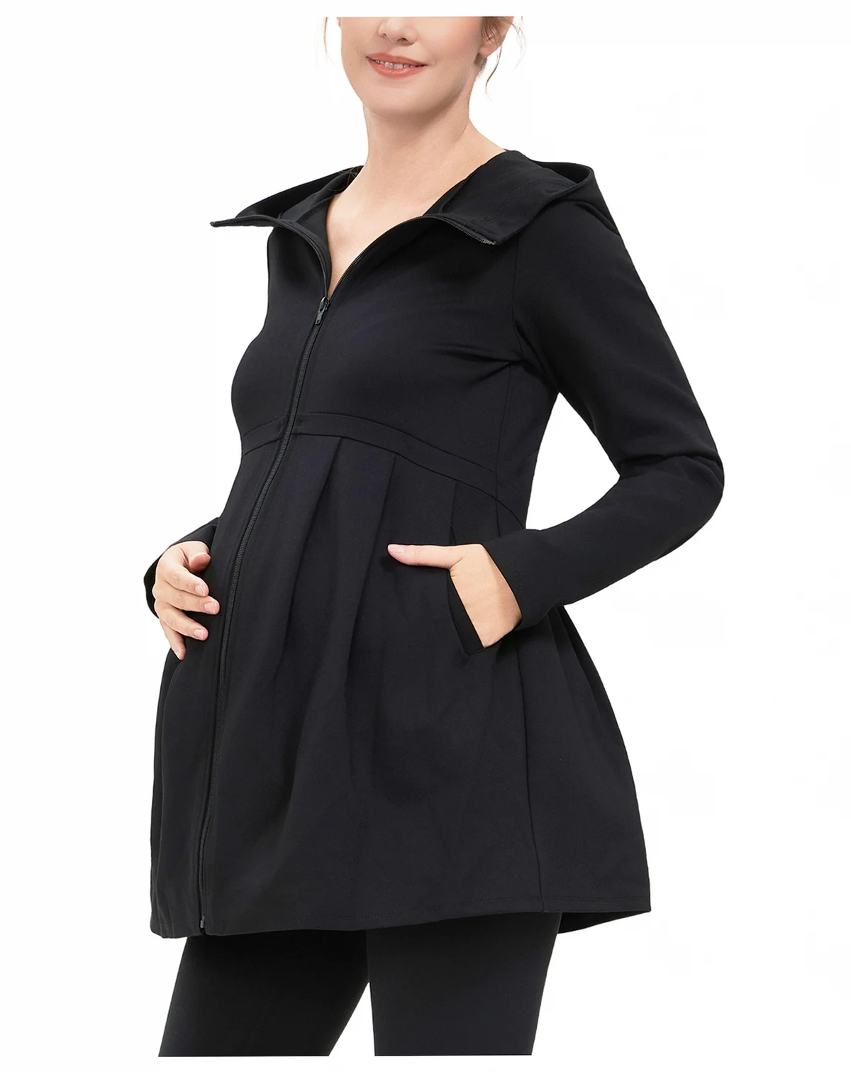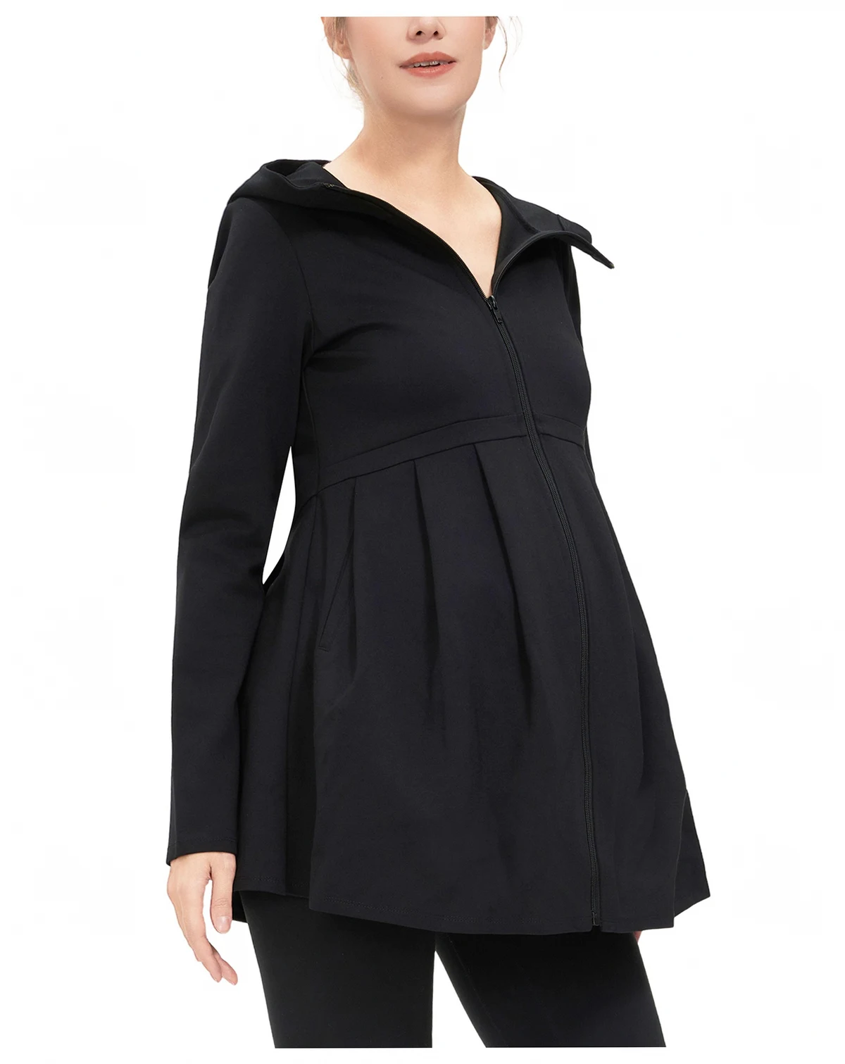 Wrap yourself in cozy comfort and stay on-trend with this maternity hoodie. Its zip-front closure and a pleated waist offer a flattering, feminine silhouette, while the tunic length provides ample coverage throughout your pregnancy. Designed to fit comfortably from your pre-pregnancy size, this hoodie is a must-have for your maternity wardrobe.