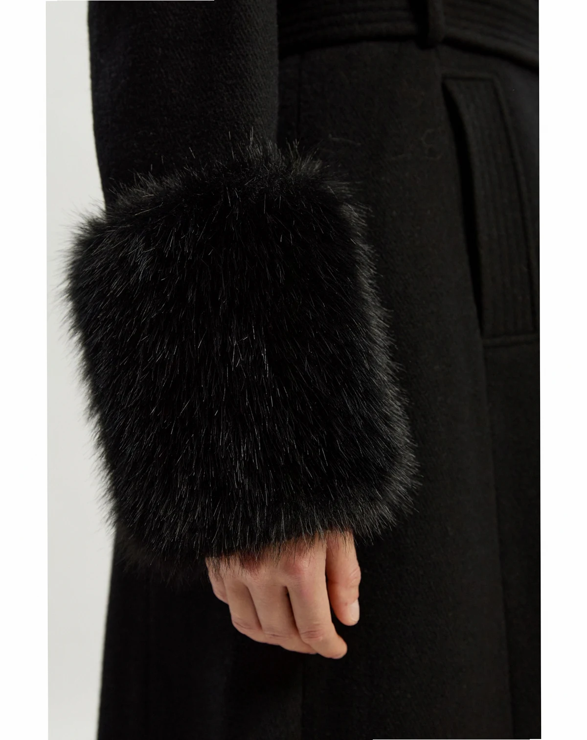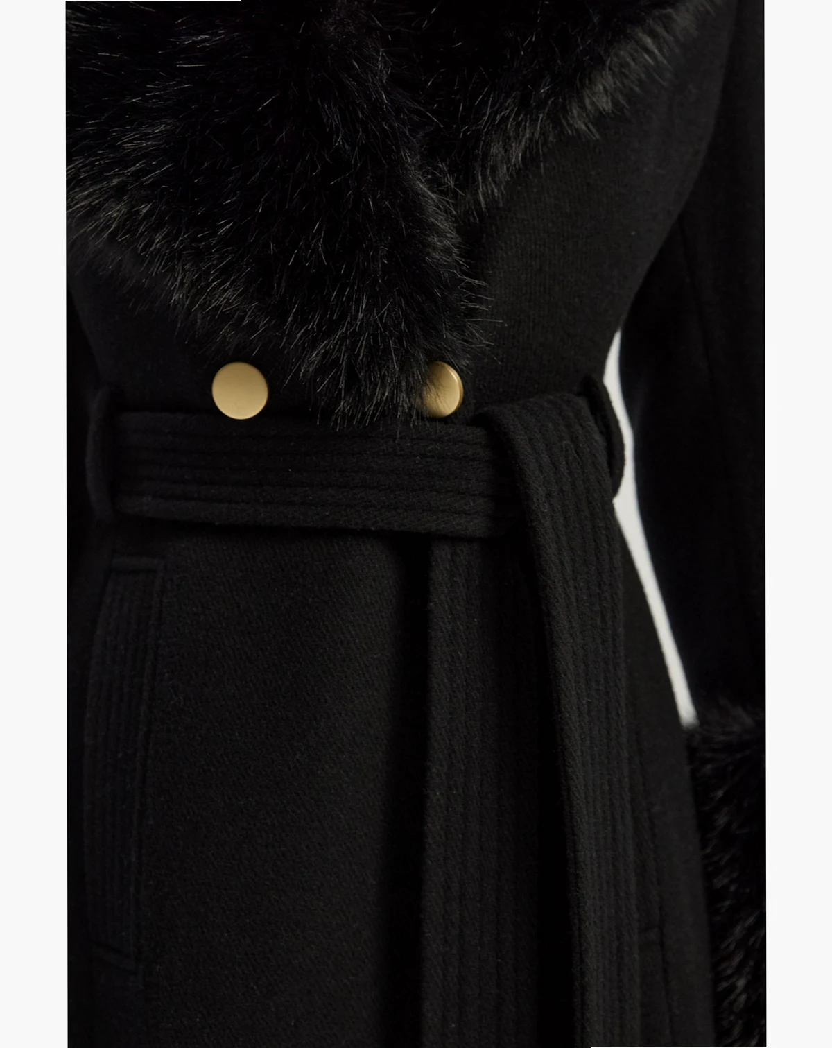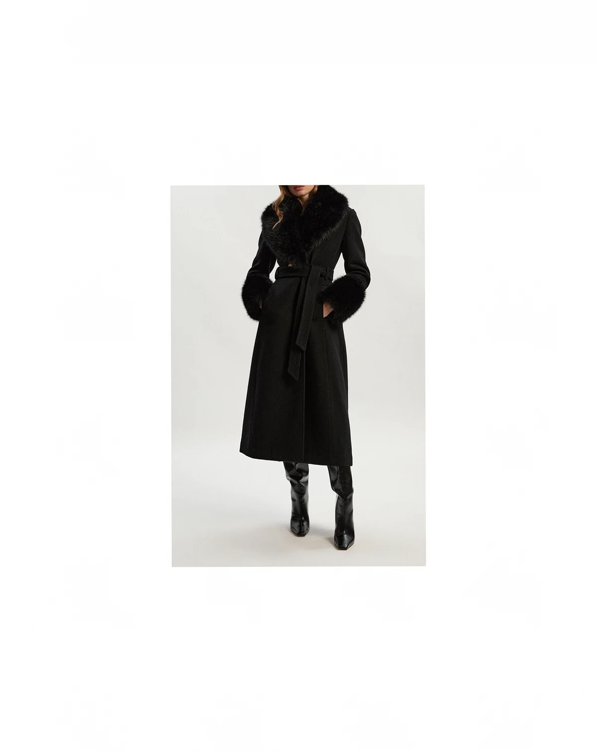 This striking belted coat from Karen Millen embodies sophisticated glamour with its sumptuous wool blend fabric and dramatic faux fur detailing. The tailored fit creates a feminine silhouette, while the detachable fur elements allow you to customise your look according to the occasion or weather. Style with knee-high boots as shown for an effortlessly chic daytime ensemble, or pair with slim-fit trousers and ankle boots for family gatherings.