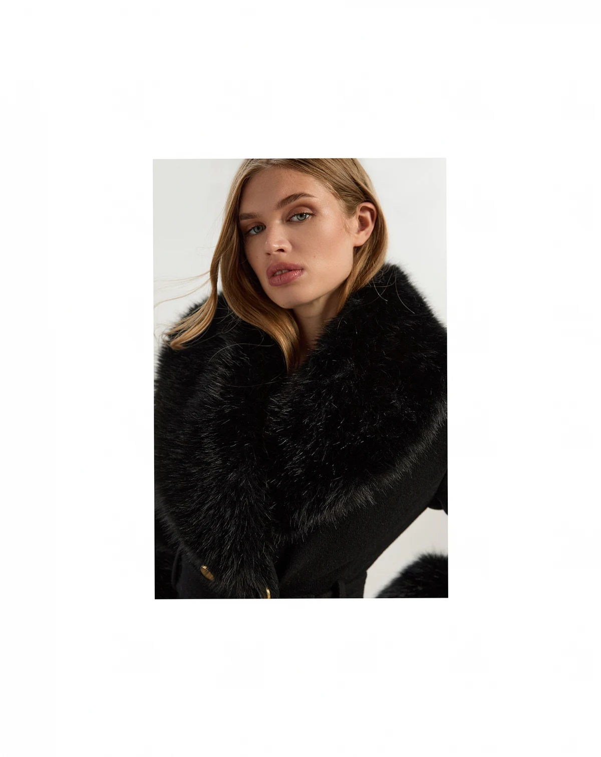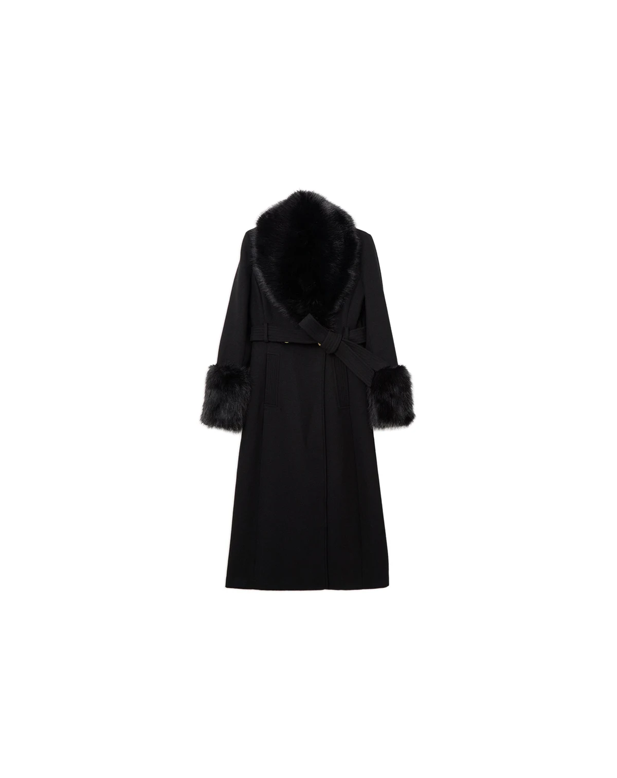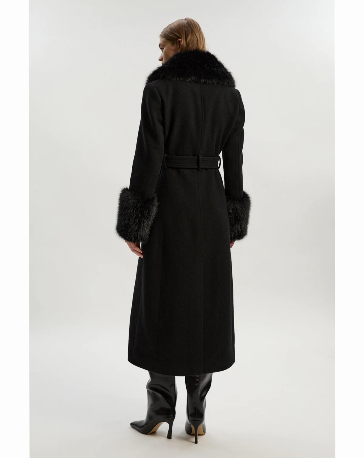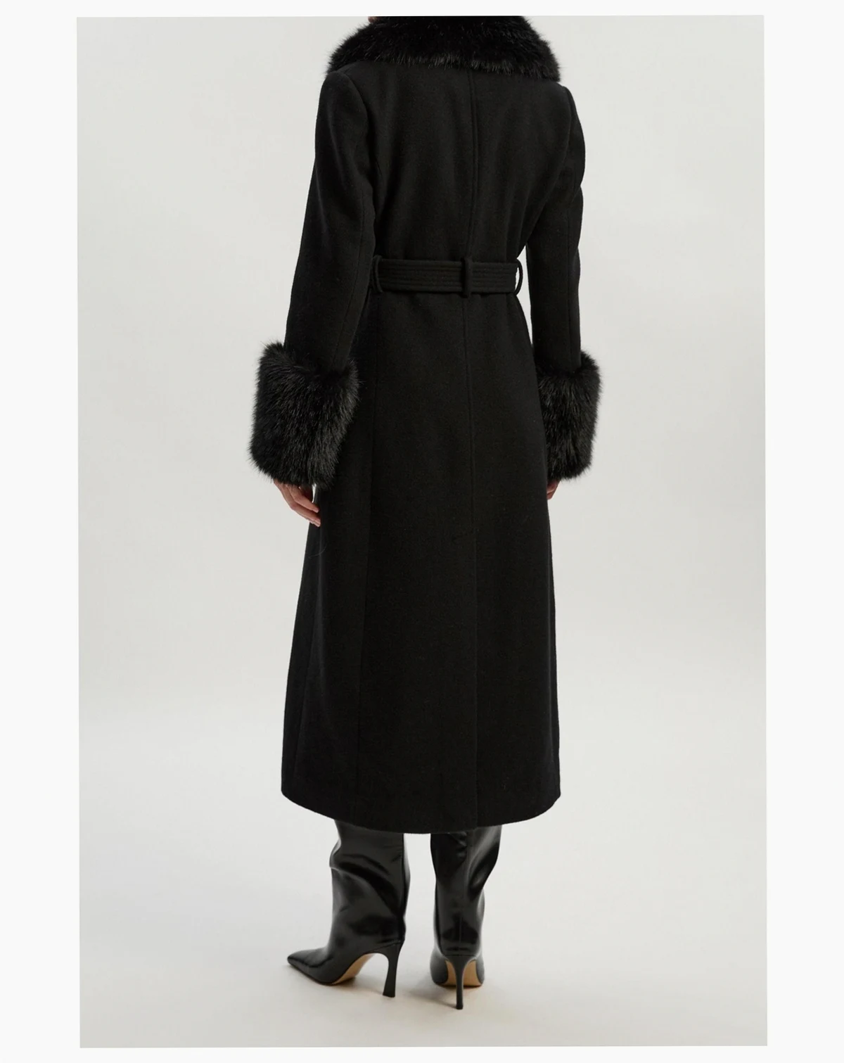 This striking belted coat from Karen Millen embodies sophisticated glamour with its sumptuous wool blend fabric and dramatic faux fur detailing. The tailored fit creates a feminine silhouette, while the detachable fur elements allow you to customise your look according to the occasion or weather. Style with knee-high boots as shown for an effortlessly chic daytime ensemble, or pair with slim-fit trousers and ankle boots for family gatherings.