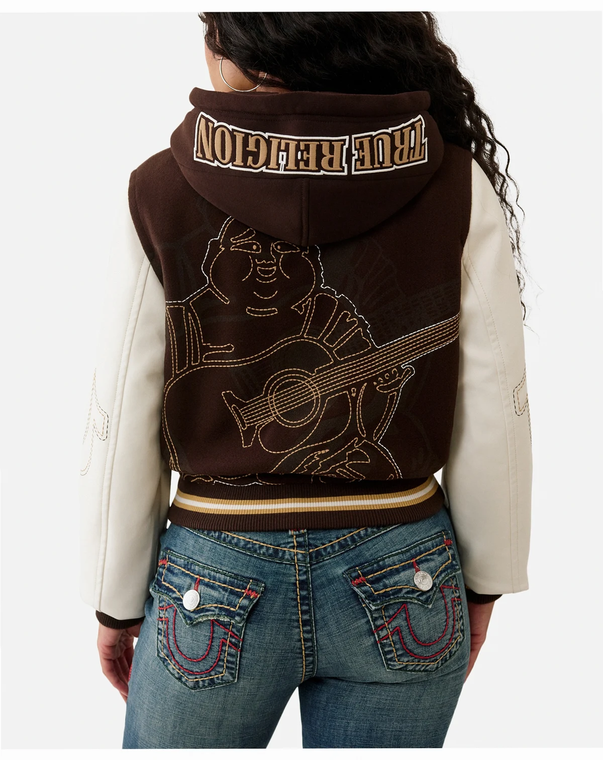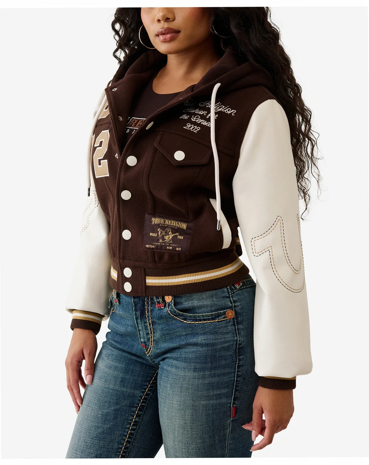 This women's jacket features a drawstring hood, fleece lining, snap-button closures, dropped long sleeves, slanted front pockets, and varsity-striped trim. Finished with a logo patches and embroiderey.