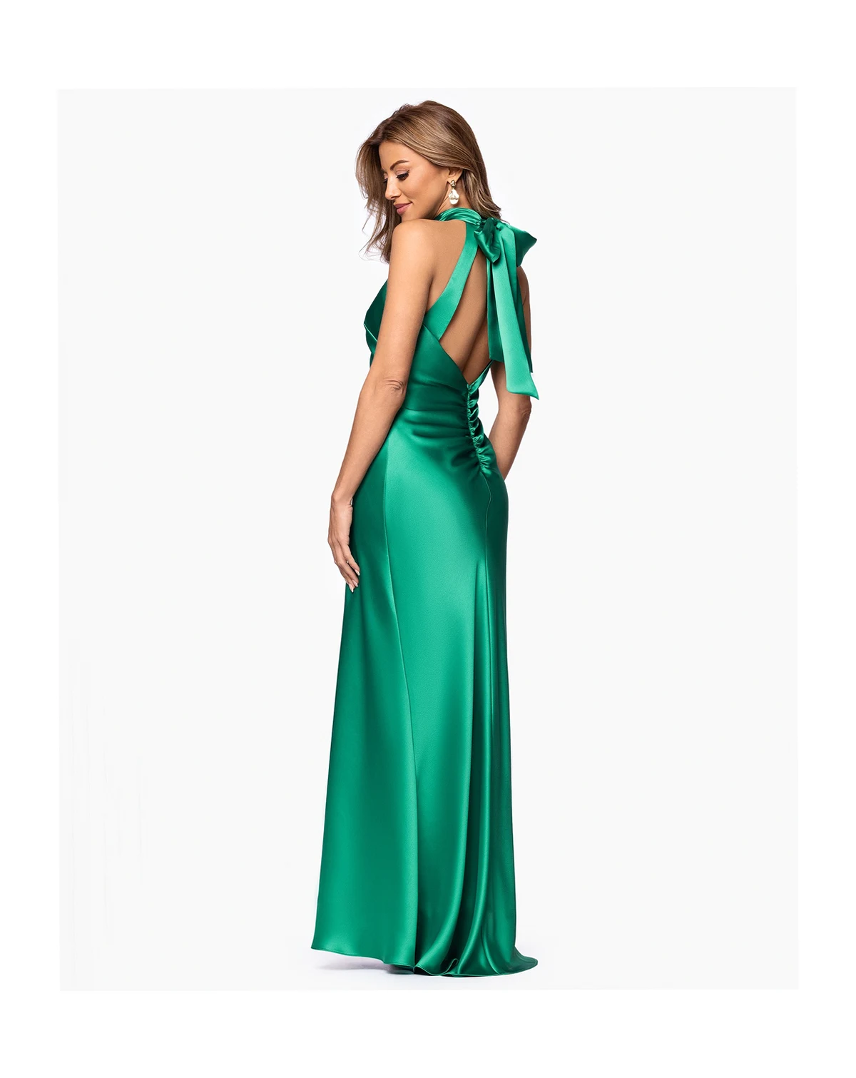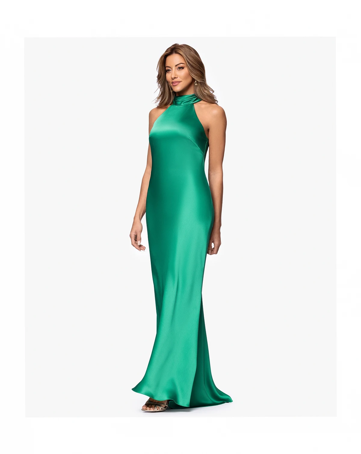 Turn heads in this sleeveless XSCAPE long dress, styled with a halter neckline and a luxe satin tie-neck detail. Finished with a back zipper closure, it's an elegant choice for formal events, weddings, or evening celebrations.