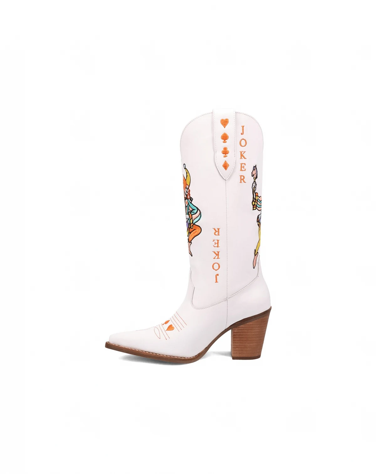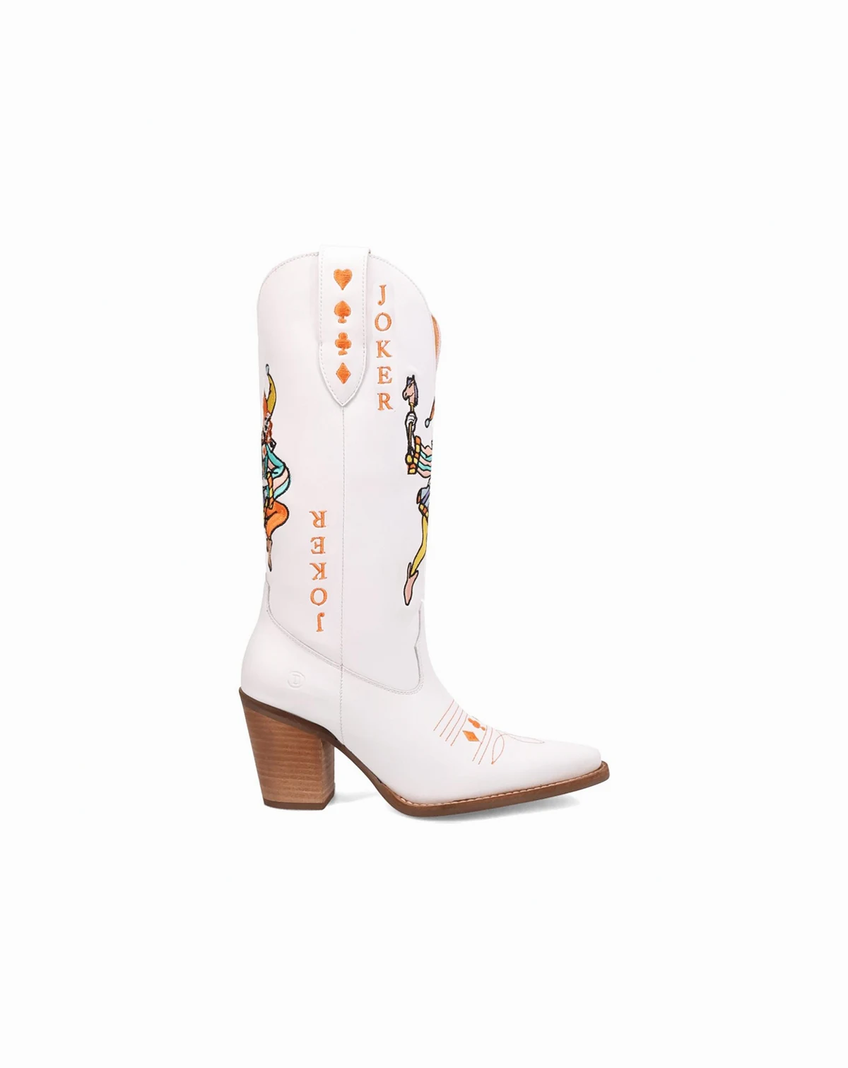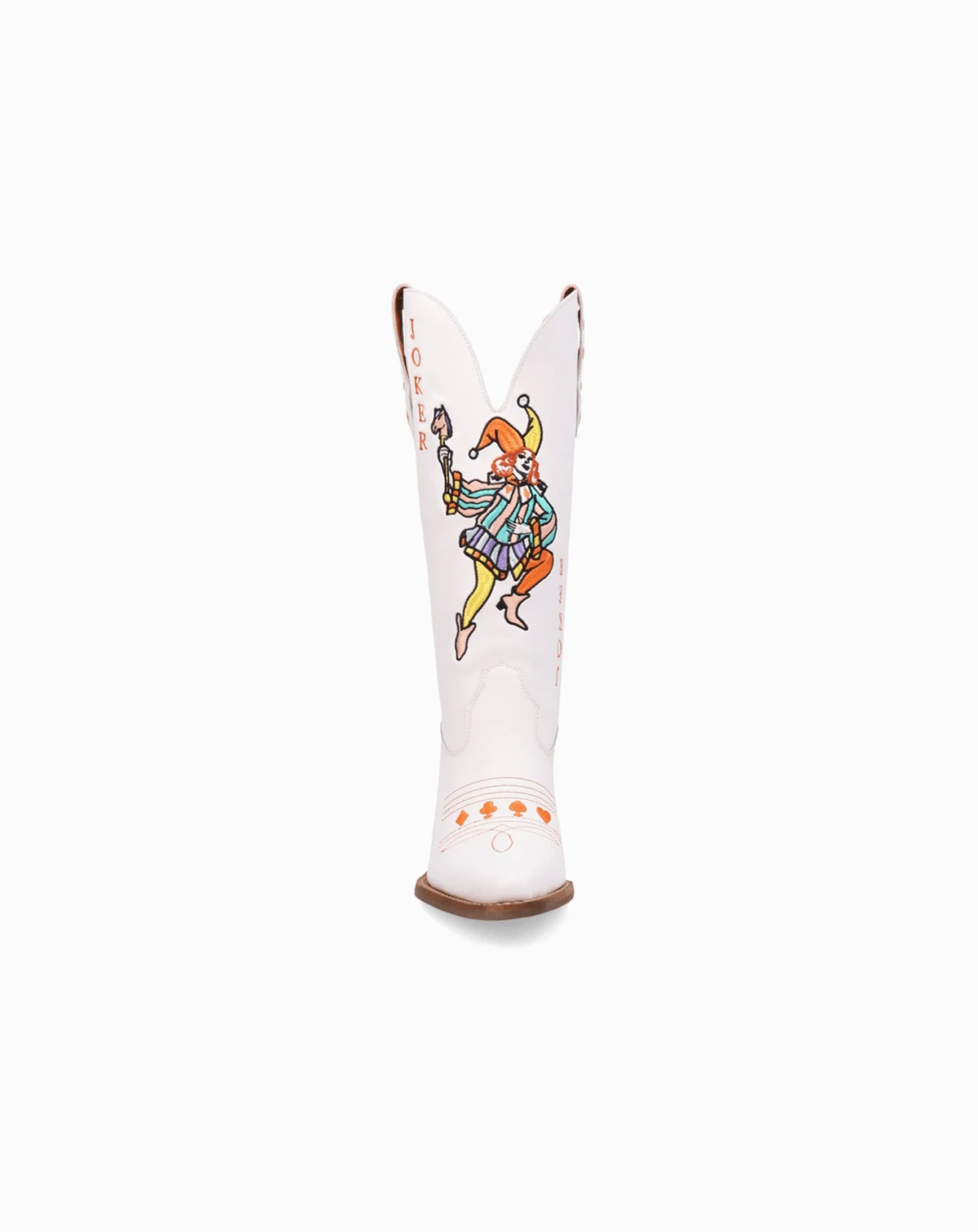 The Joker's wild boot is the ultimate wildcard in our deck-inspired collection. Unlike the bold, classic styles of the other boots in this collection, this boot embraces the unexpected with vibrant colors, playful patterns, and a touch of mischief. Designed for those who don't follow the rules, its sleek silhouette and bold details make it a true standout—because fashion, like a good card game, is all about taking risks.