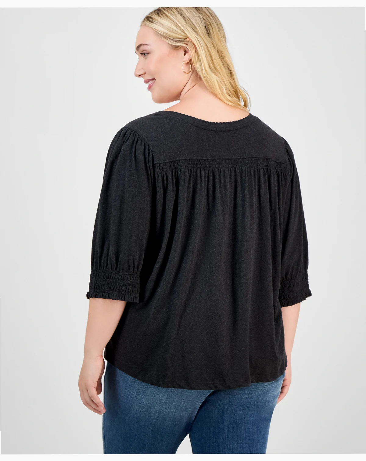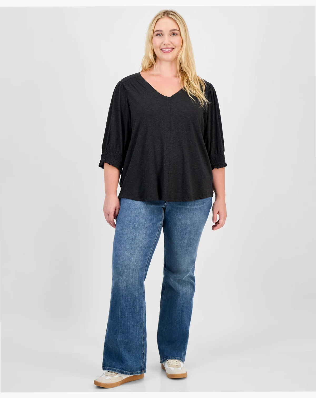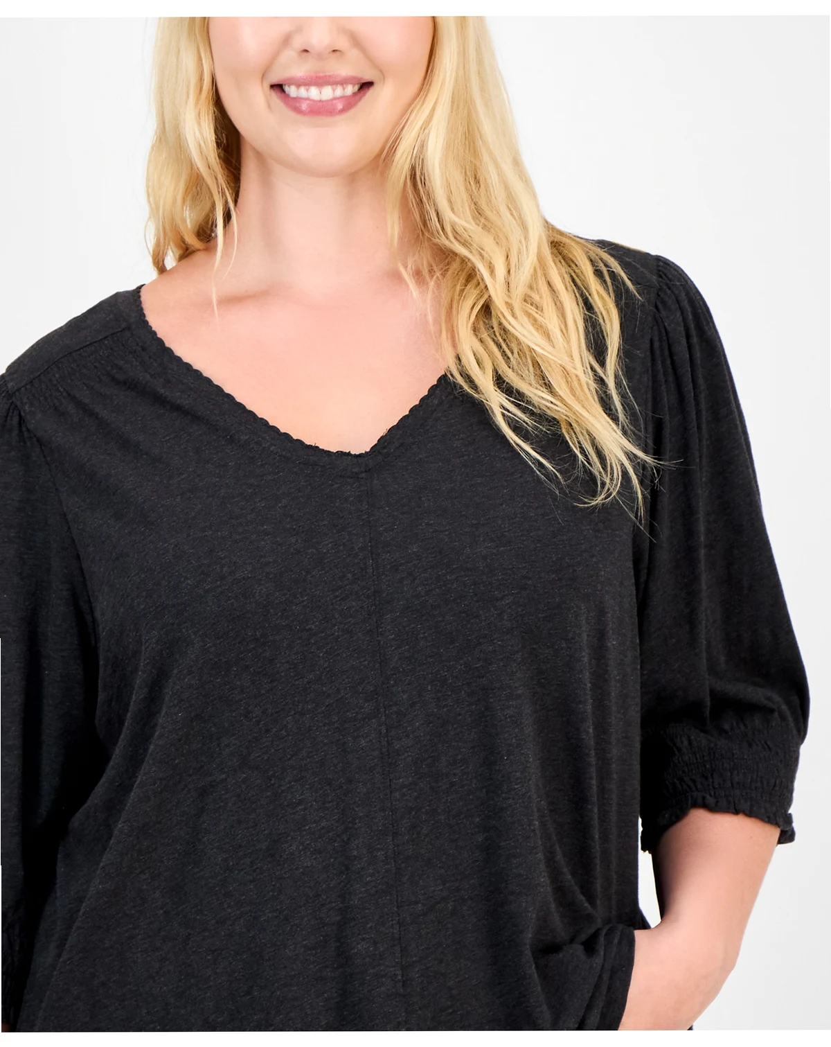 Smocked cuffs subtly elevate this classic V-neck style by Democracy, a simple yet sophisticated topper for endless ensembles, designed for the Trendy Plus range.