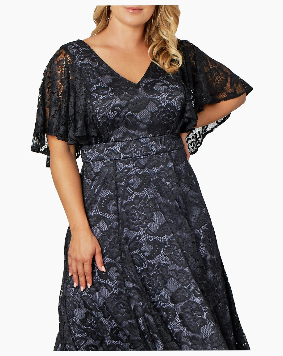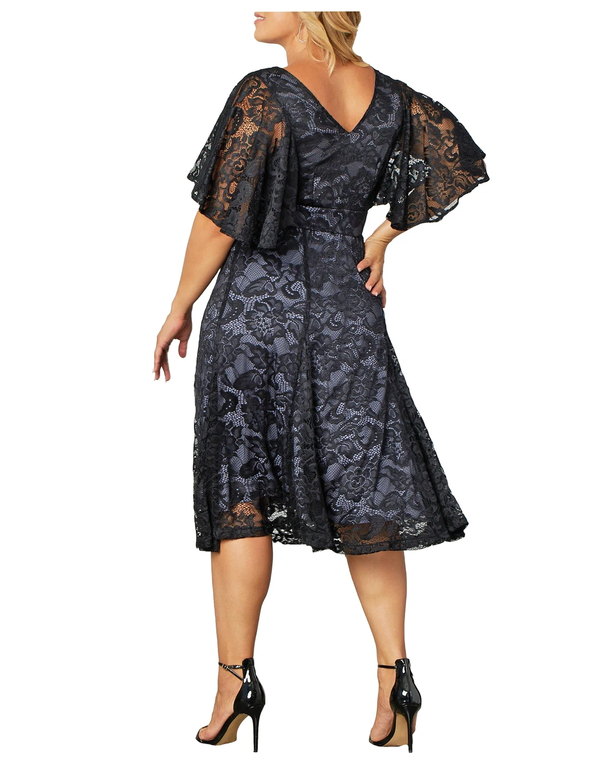 The Camille Lace Cocktail Dress features two-way stretch lace, slightly contrast lining, and princess seams for a flattering contouring effect. Godets in the skirt add a flirtatious touch and the statement-making draped sleeves add coverage and a bit of drama to this plus size formal lace dress.