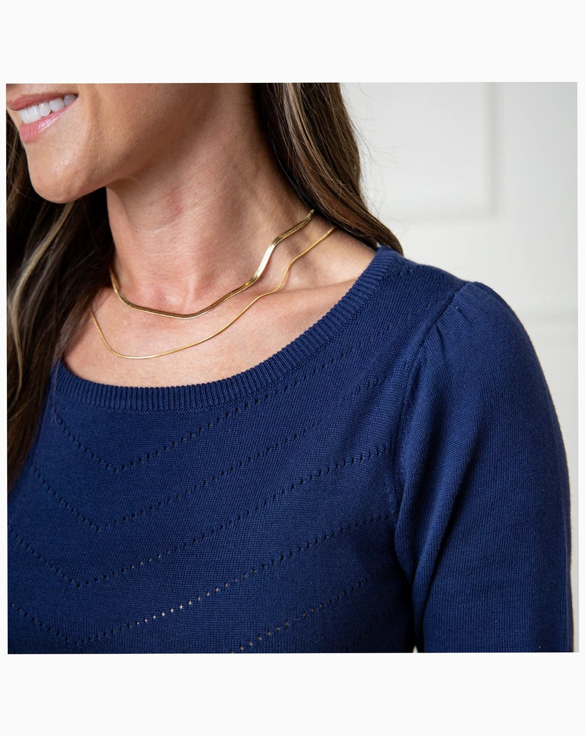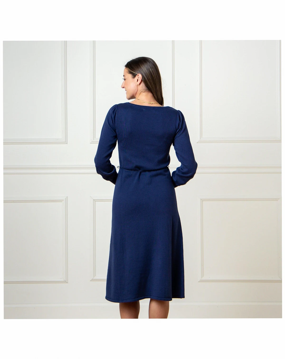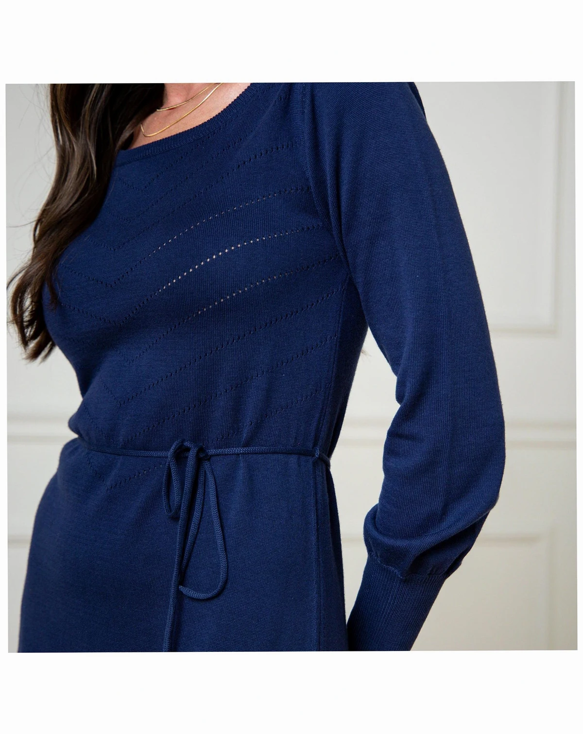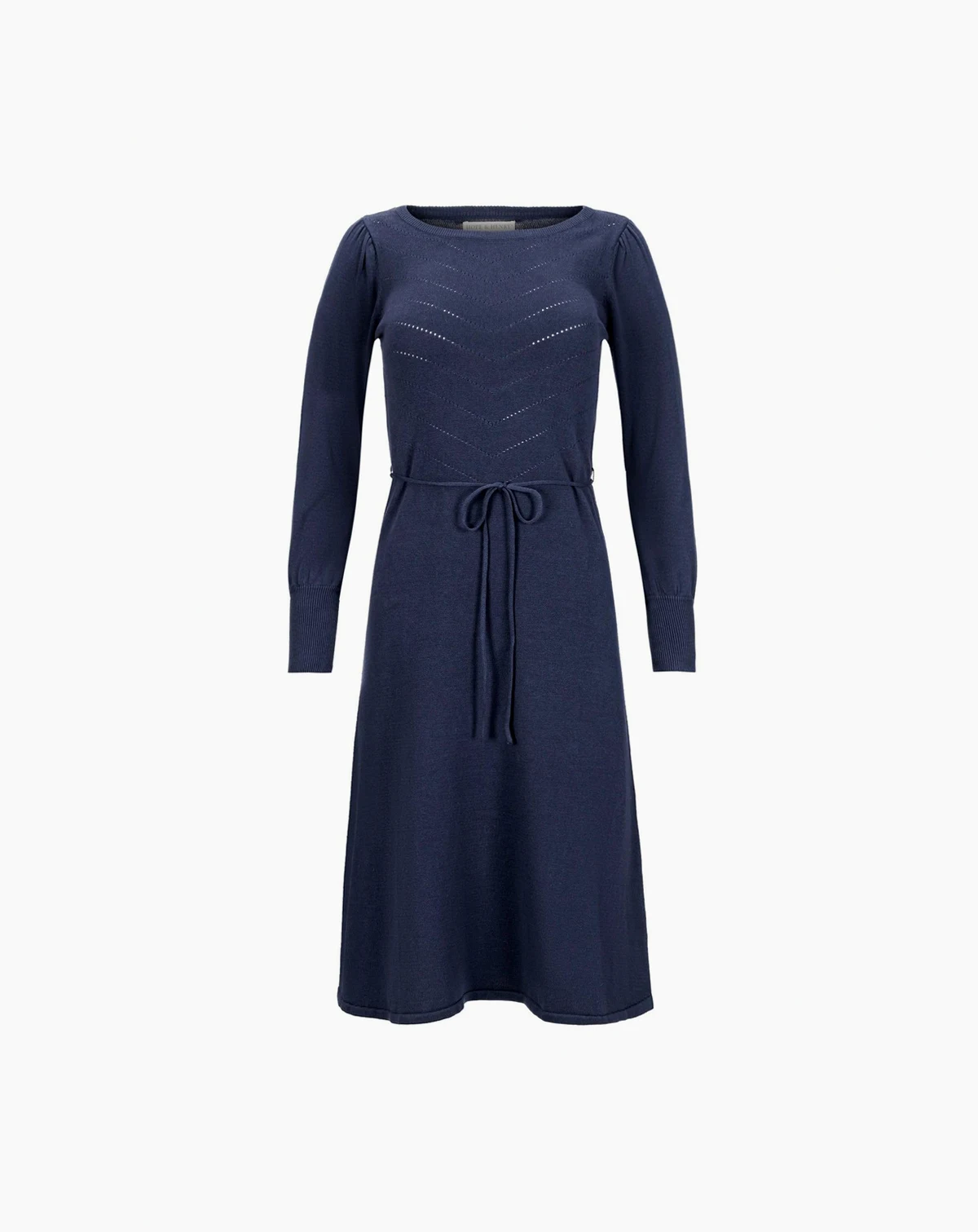 The epitome of effortless chic. Our sophisticated sweater dress in soft organic cotton exudes timeless charm. Features a flattering silhouette, romantic belled sleeves, and a removable waist tie. A chevron pointelle stitch adorns the front bodice for that extra touch.