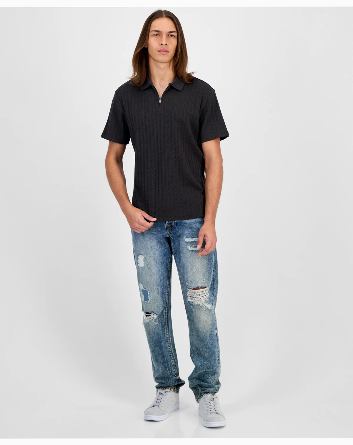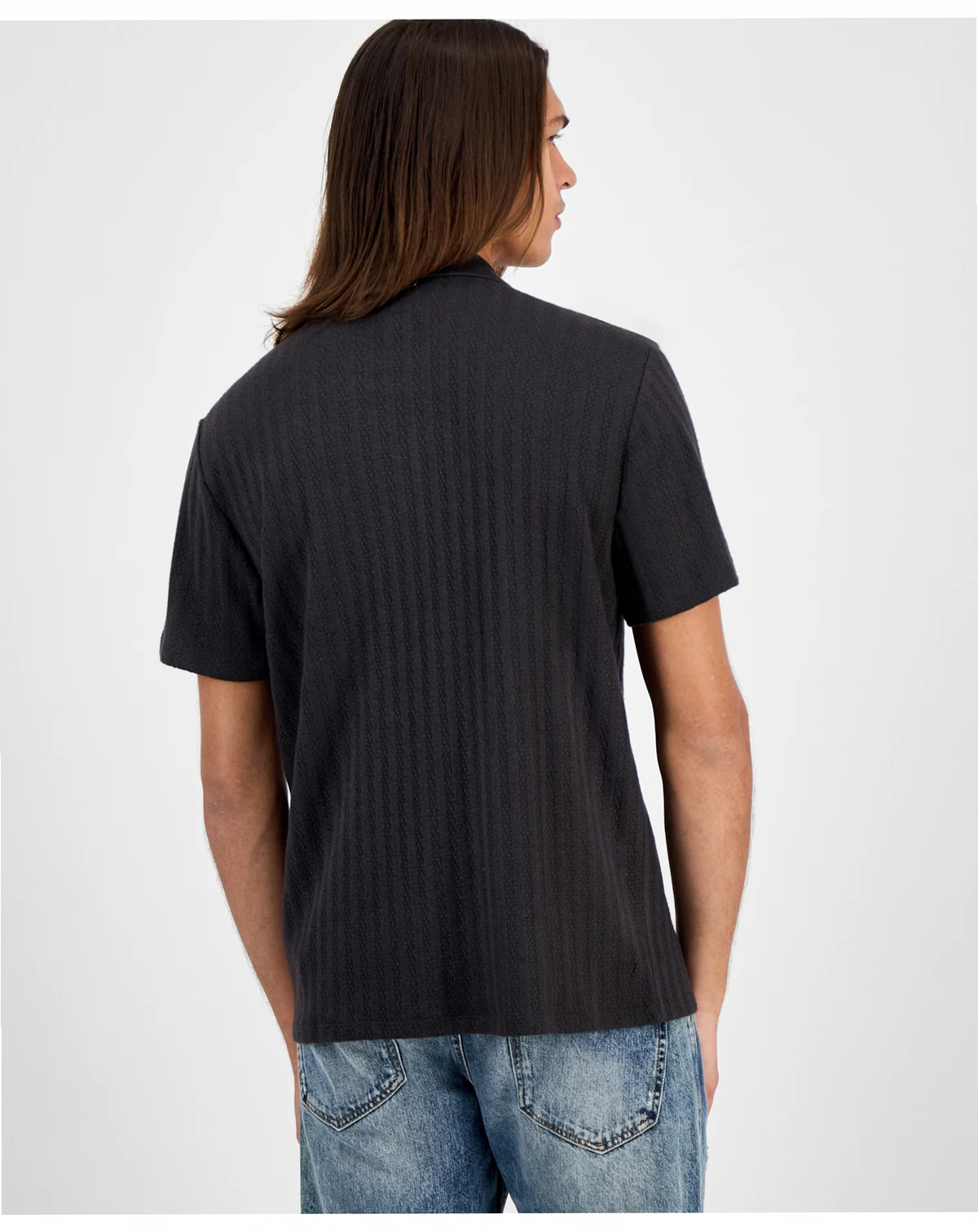 The Grady quarter-zip polo from GUESS features a ribbed polo collar and neckline, zipper placket, short sleeves, regular length and regular fit.