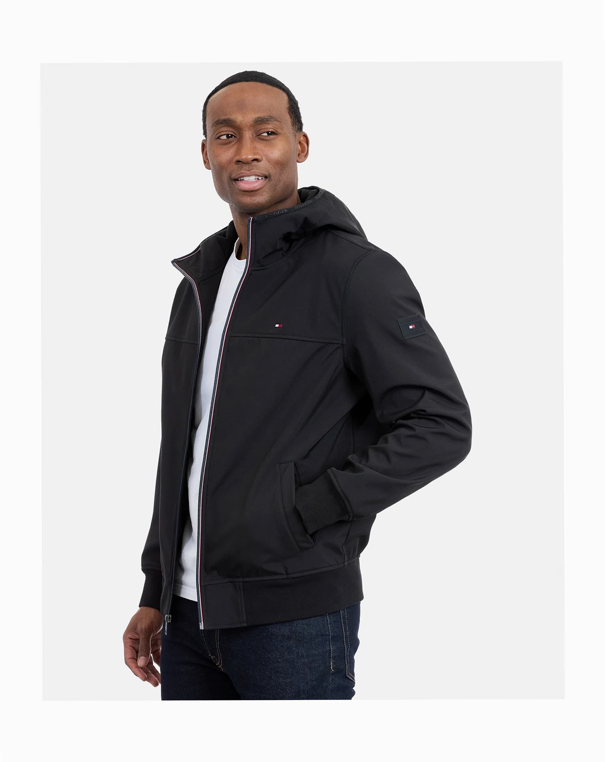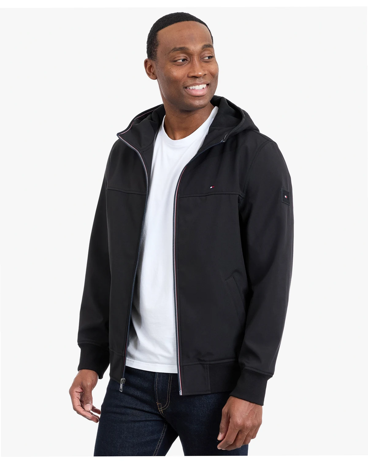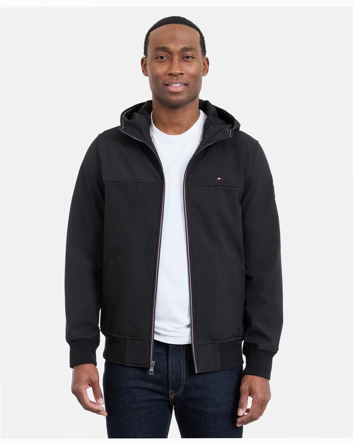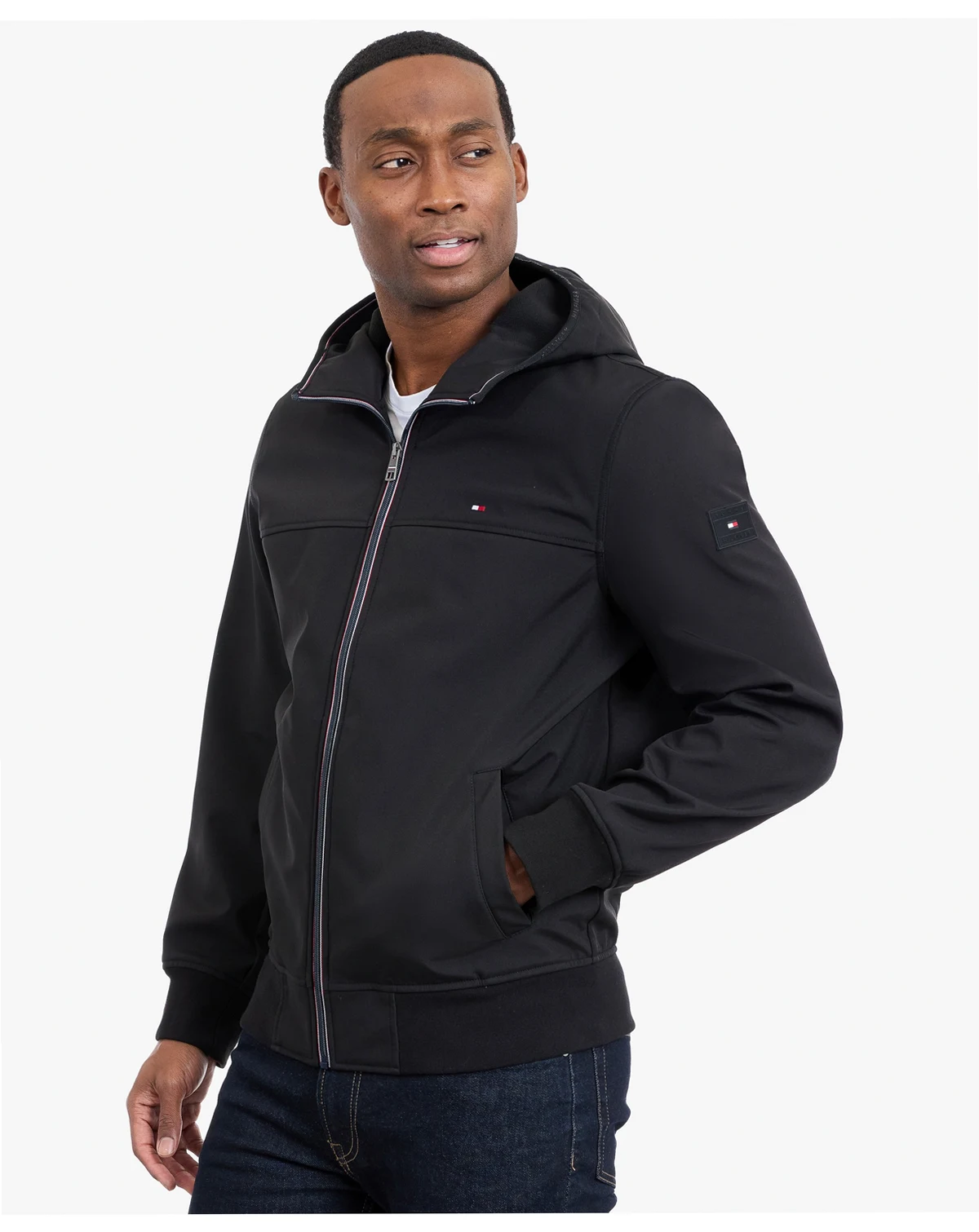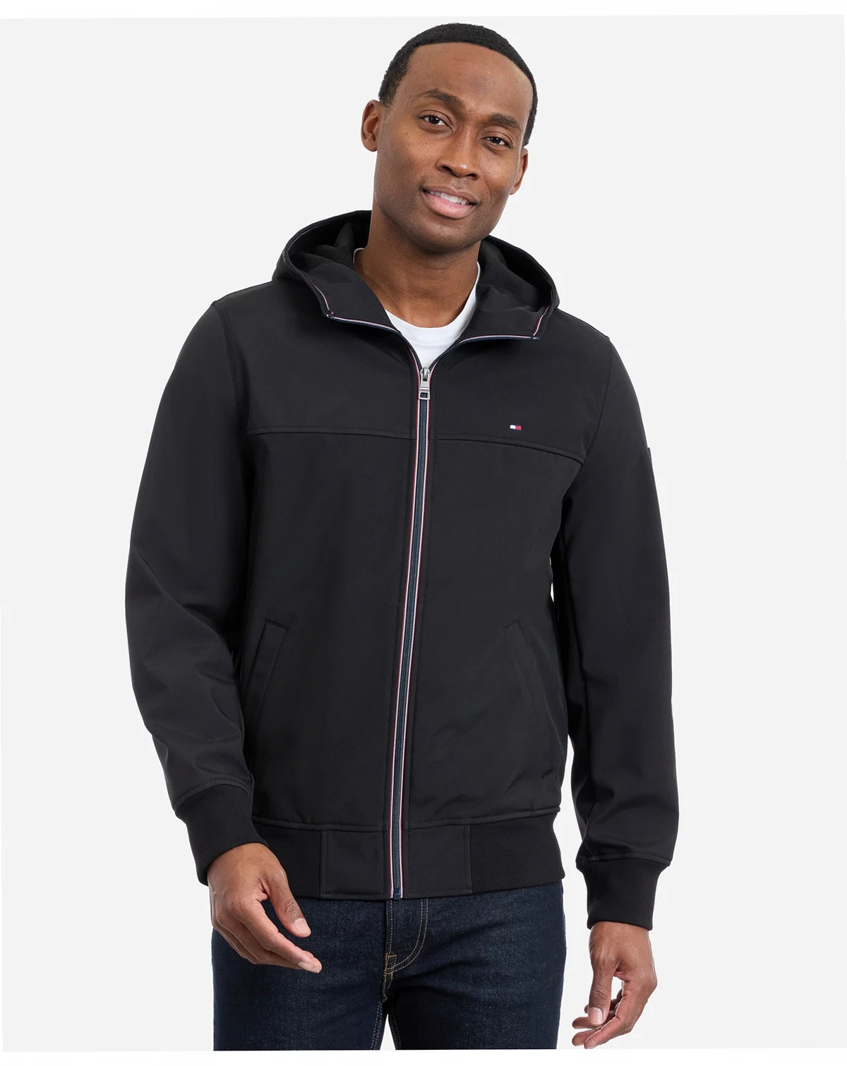 Weather-ready versatility defines this hooded softshell jacket by Tommy Hilfiger, crafted from water-resistant, breathable fabric that keeps you comfortable and protected. The adjustable hood and zip-front closure enhance fit and coverage, while the streamlined silhouette supports effortless layering and modern, functional styling.