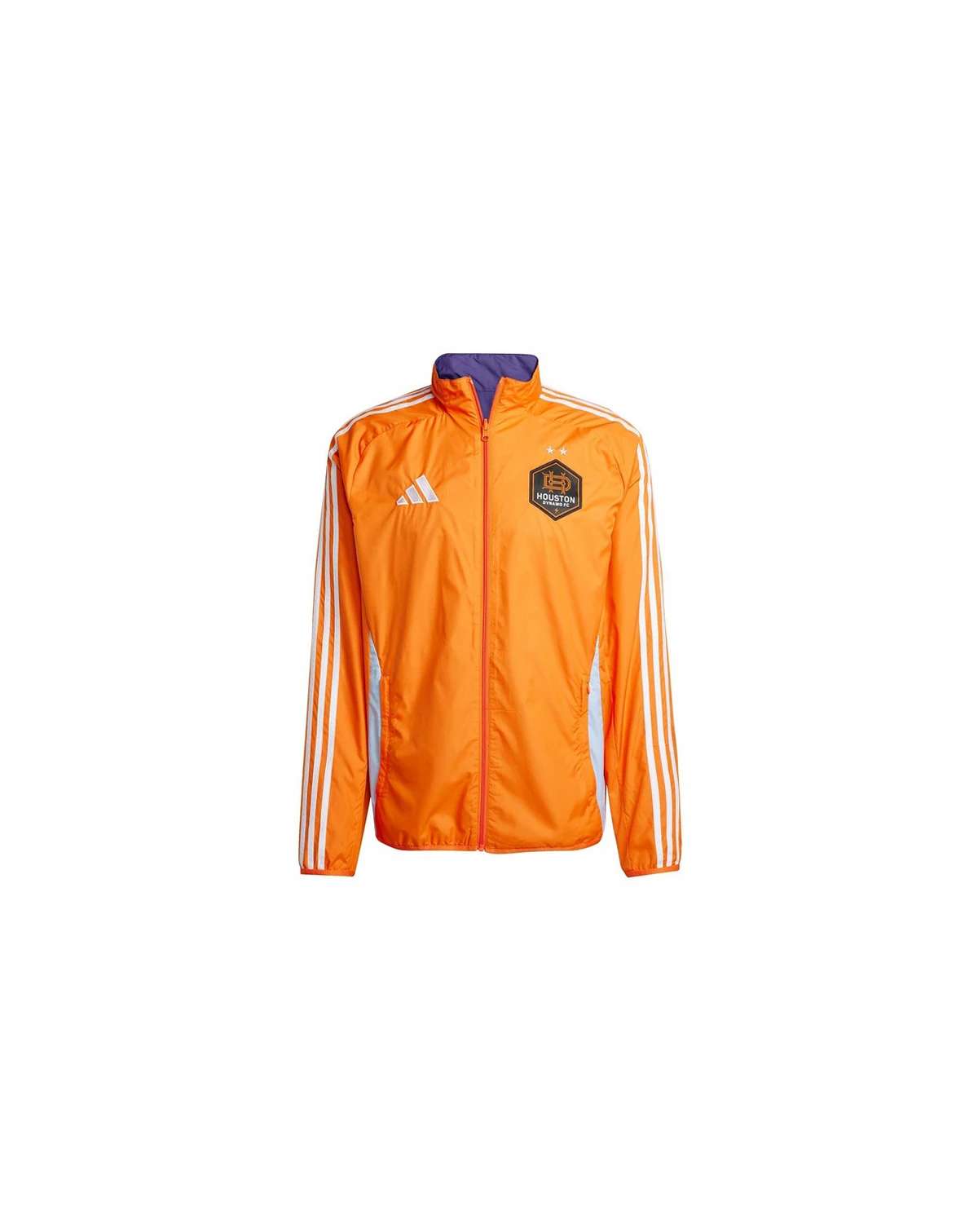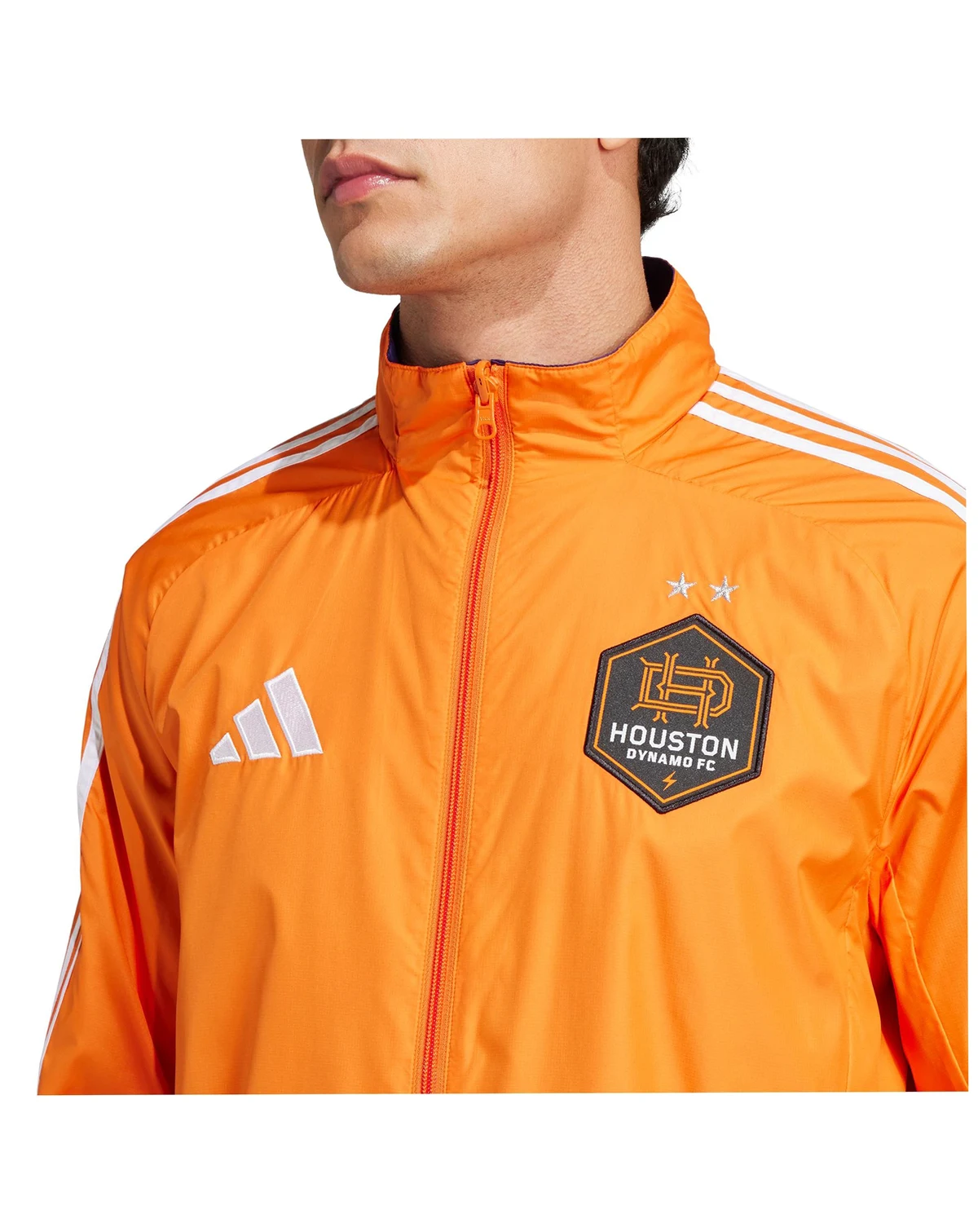 Embrace your Houston Dynamo FC pride with this 2025 Anthem Reversible Full zip Jacket from Adidas. This reversible jacket offers two distinct looks in one, featuring screen print graphics on one side and a sublimated design on the other. Made from materials, it boasts a comfortable midweight construction ideal for moderate temperatures, while elastic cuffs and a bottom hem offer a secure and personalized fit.