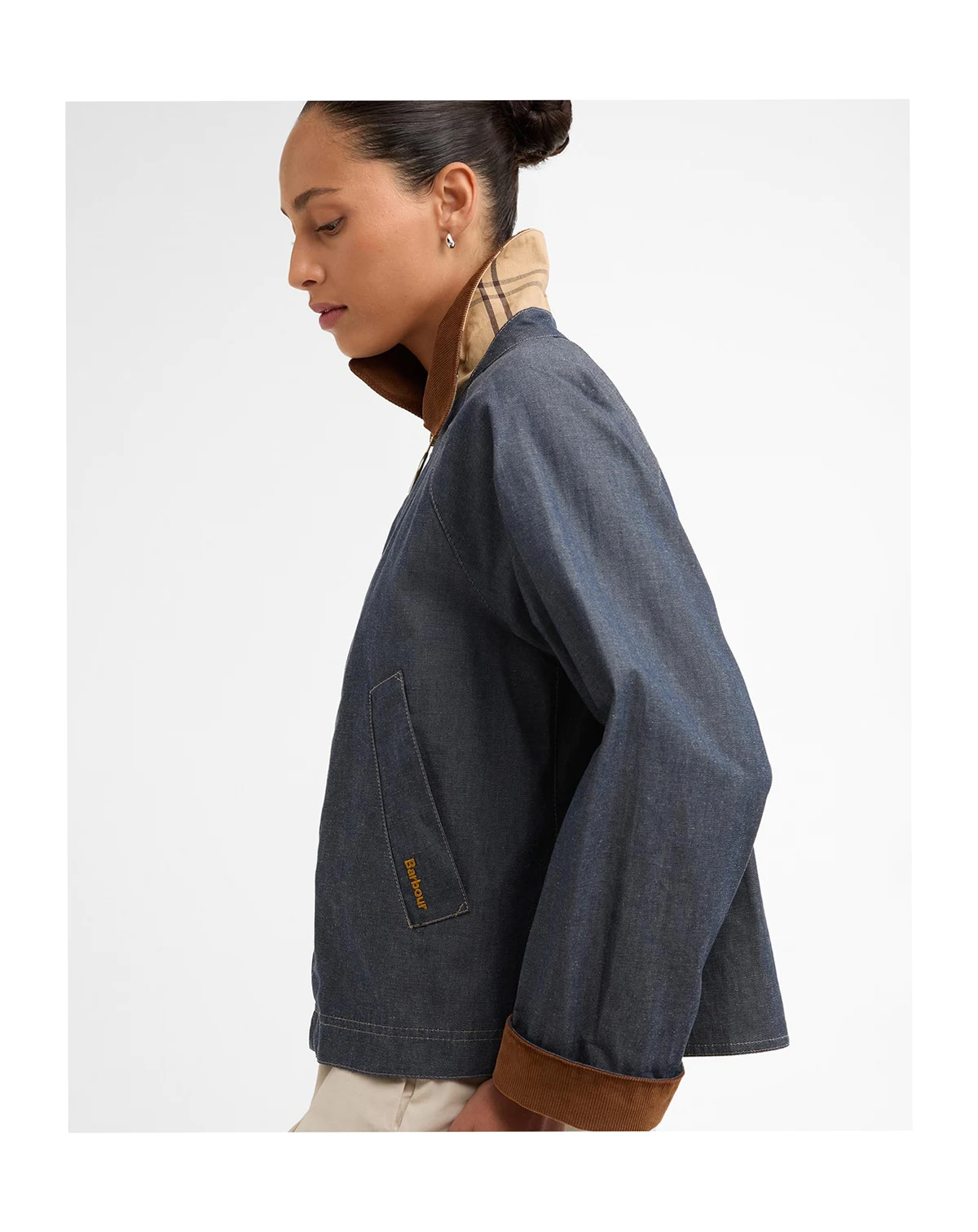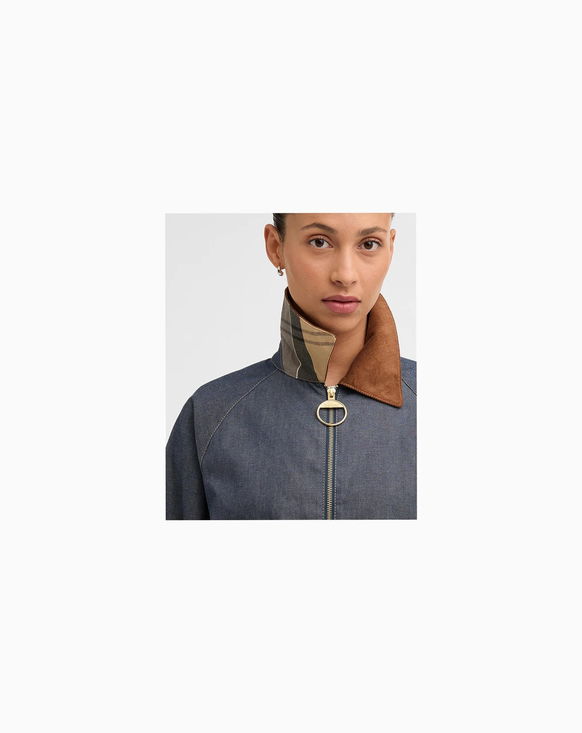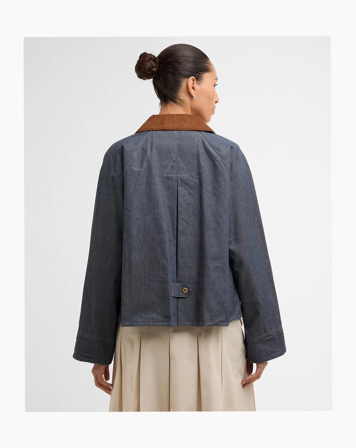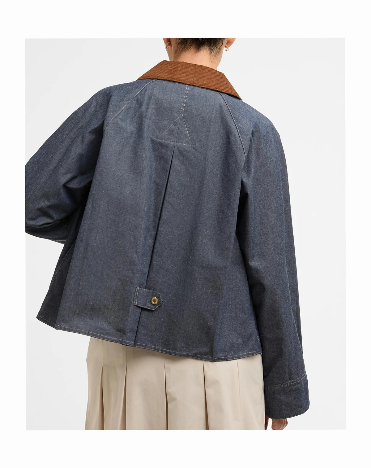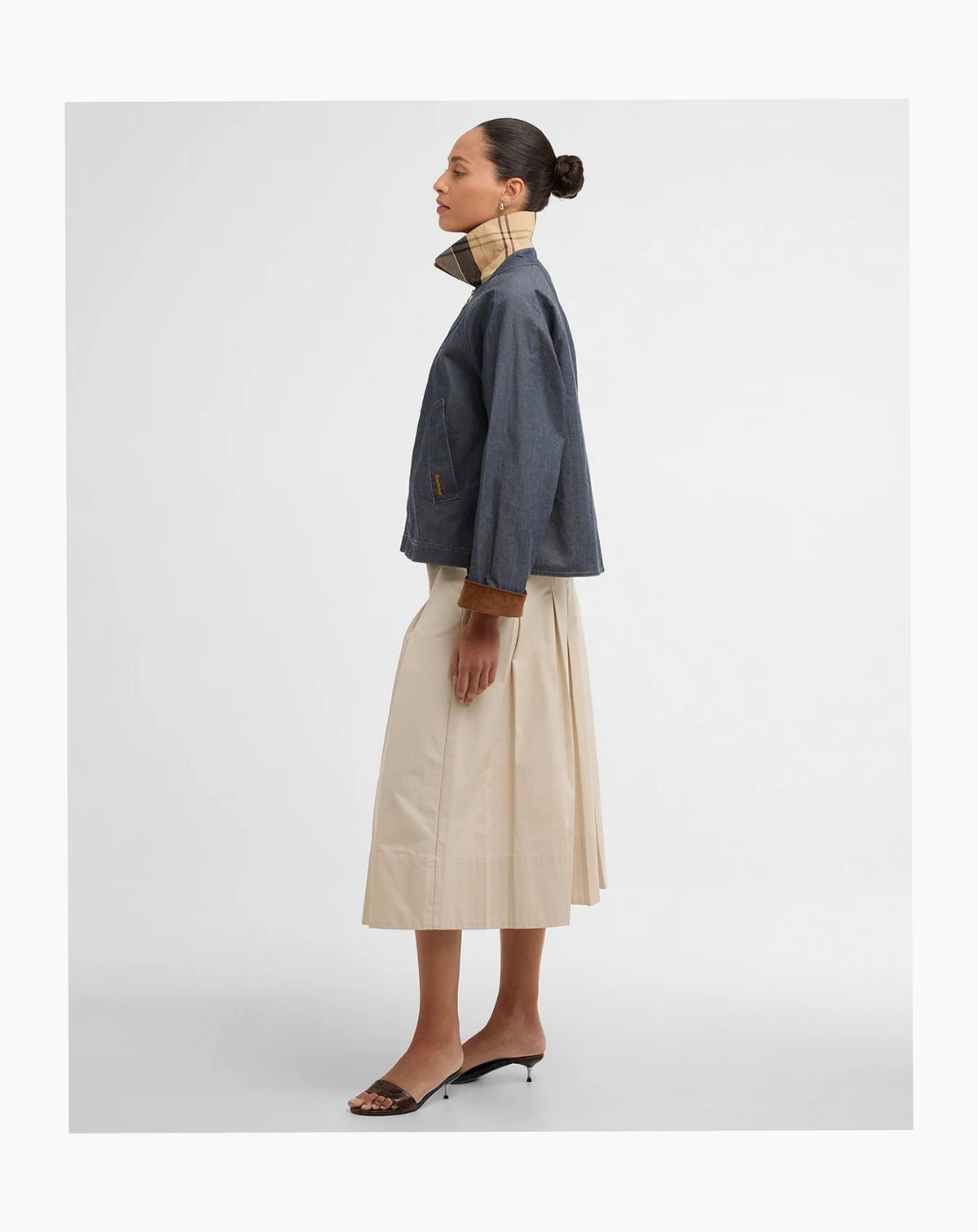 Short casual denim style with subtle A line silhouette. Featuring a deep inverted box pleat to C.B. Exposed C.F zip with ring puller and welt pockets. Cord under cuff.