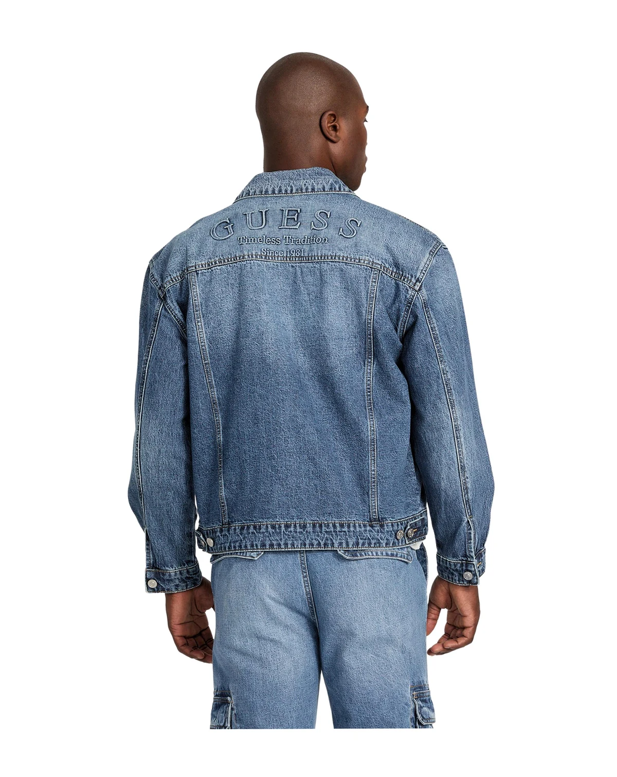 The Relaxed Trucker features a rigid denim, front button closure, GUESS logo across the back of the jacket, relaxed fit, regular length, two chest pockets and a triangle GUESS patch logo on the front bottom left side of the jacket.