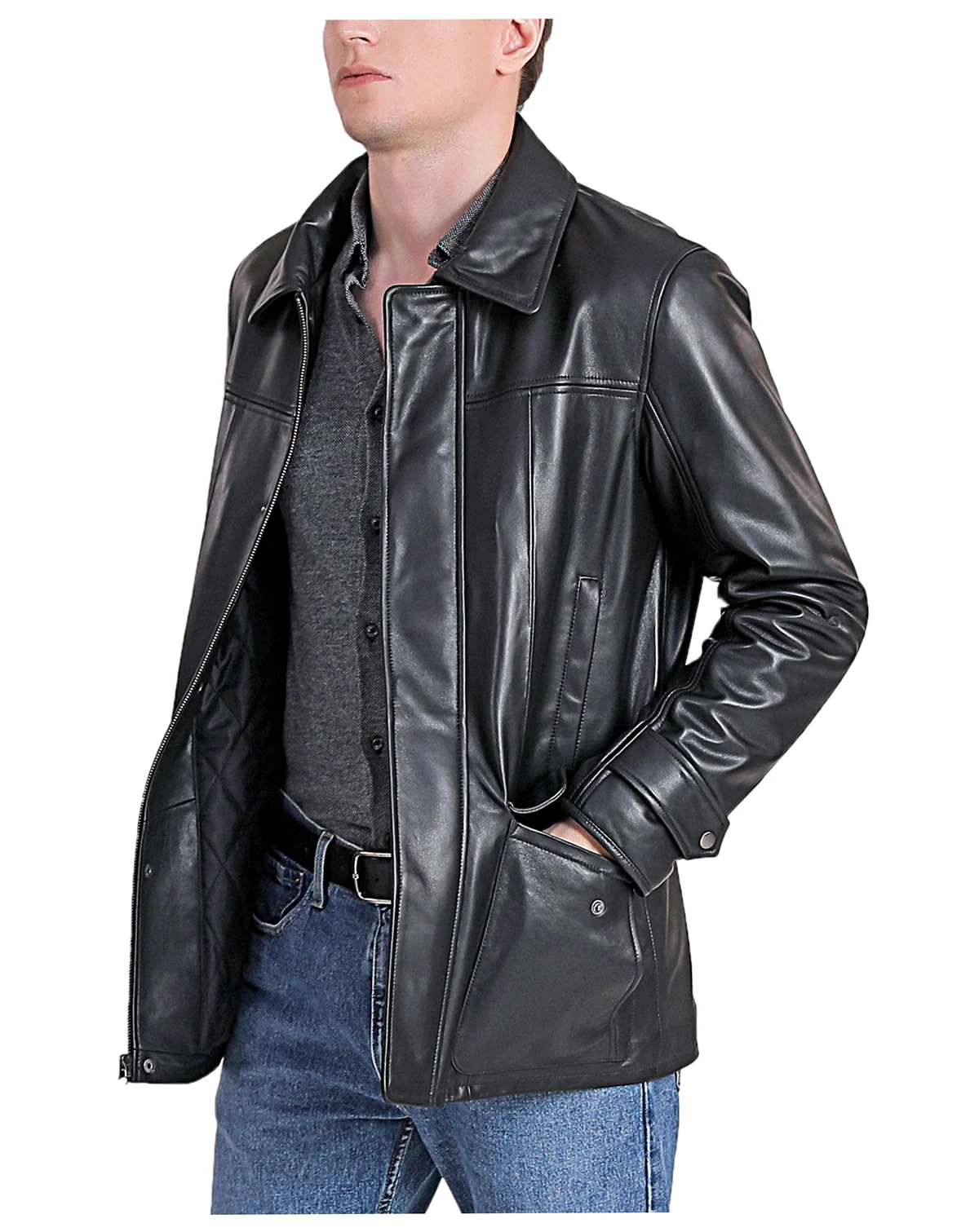Shield yourself from the elements in this handsomely crafted leather coat which is sure to become an everyday staple. Loads of features include: zip-closed security pocket and a cell phone pocket. Quilted polyester lining with polyester fill for extra warmth and comfort.