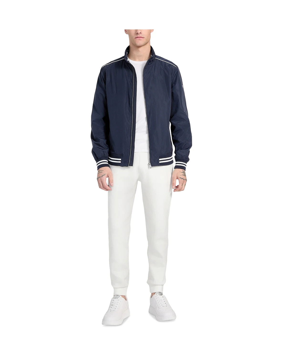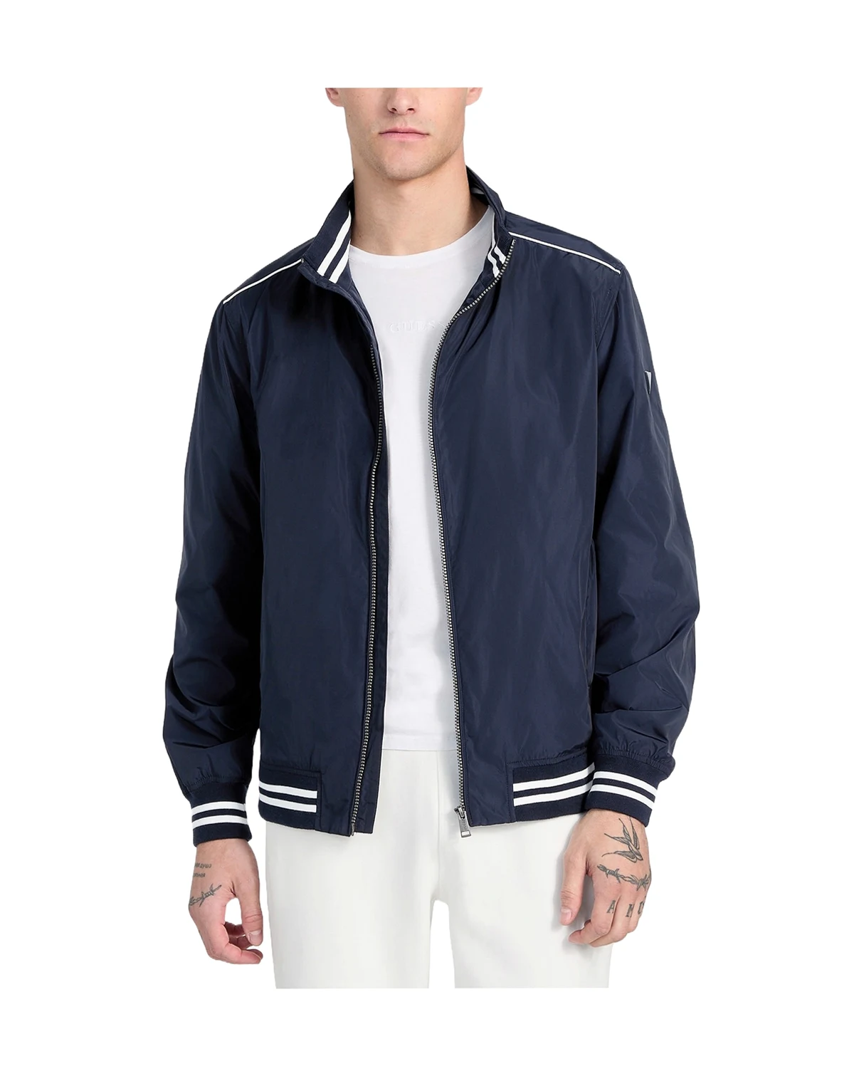 Sporty, toasty and outfitted with stripes, this stand-collar bomber jacket from GUESS gives you a crisp outerwear look that pairs effortlessly with all your casual-wear standbys.