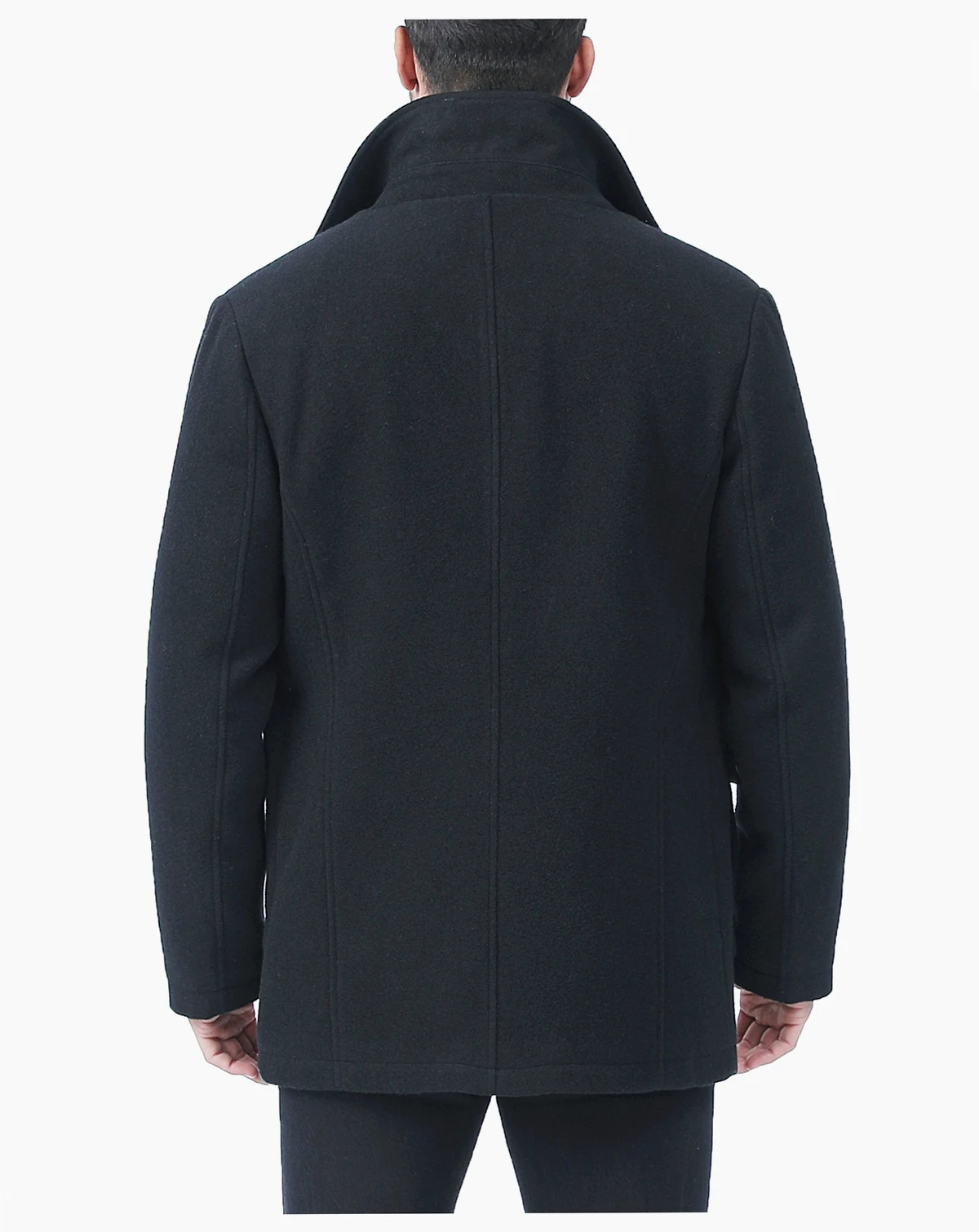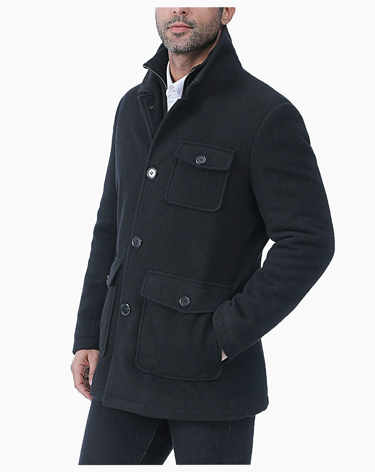 The perfect addition to your closet, this double collar men's wool coat with removal knitted bib can be worn buttons open for a casual look, and buttoned up for a professional look.