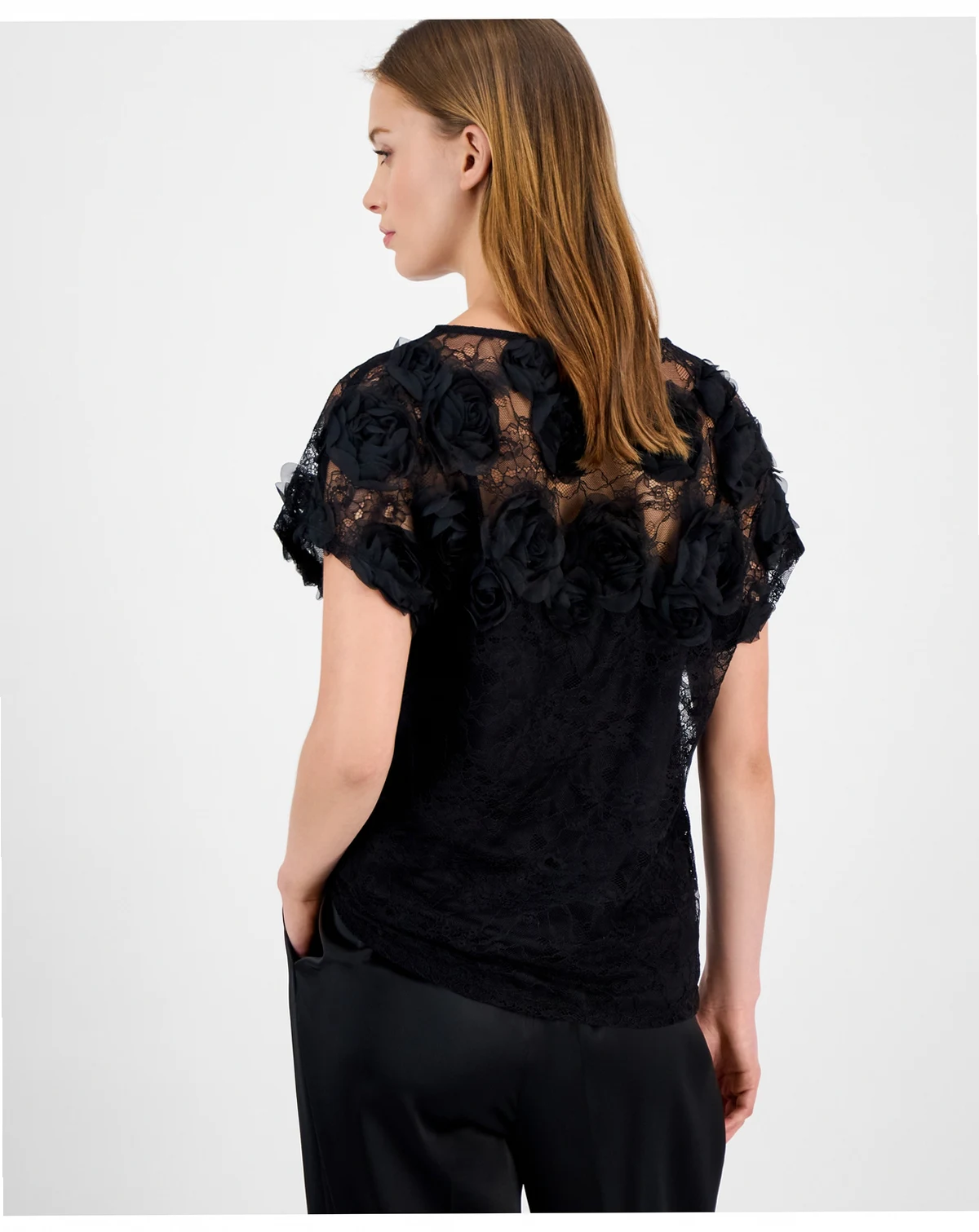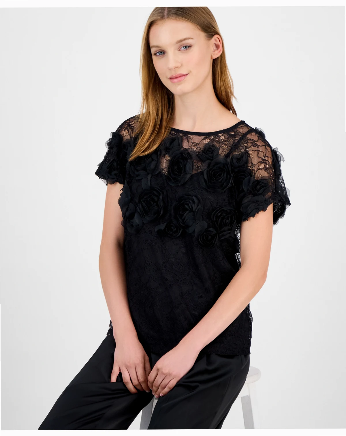 The epitome of pretty, this petite top from Anne Klein is designed in lace and finished with gorgeous rosette detail.