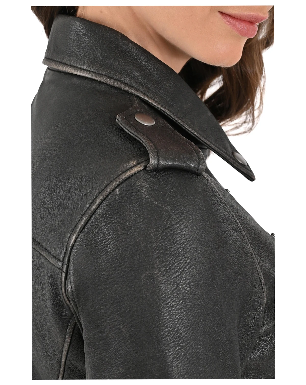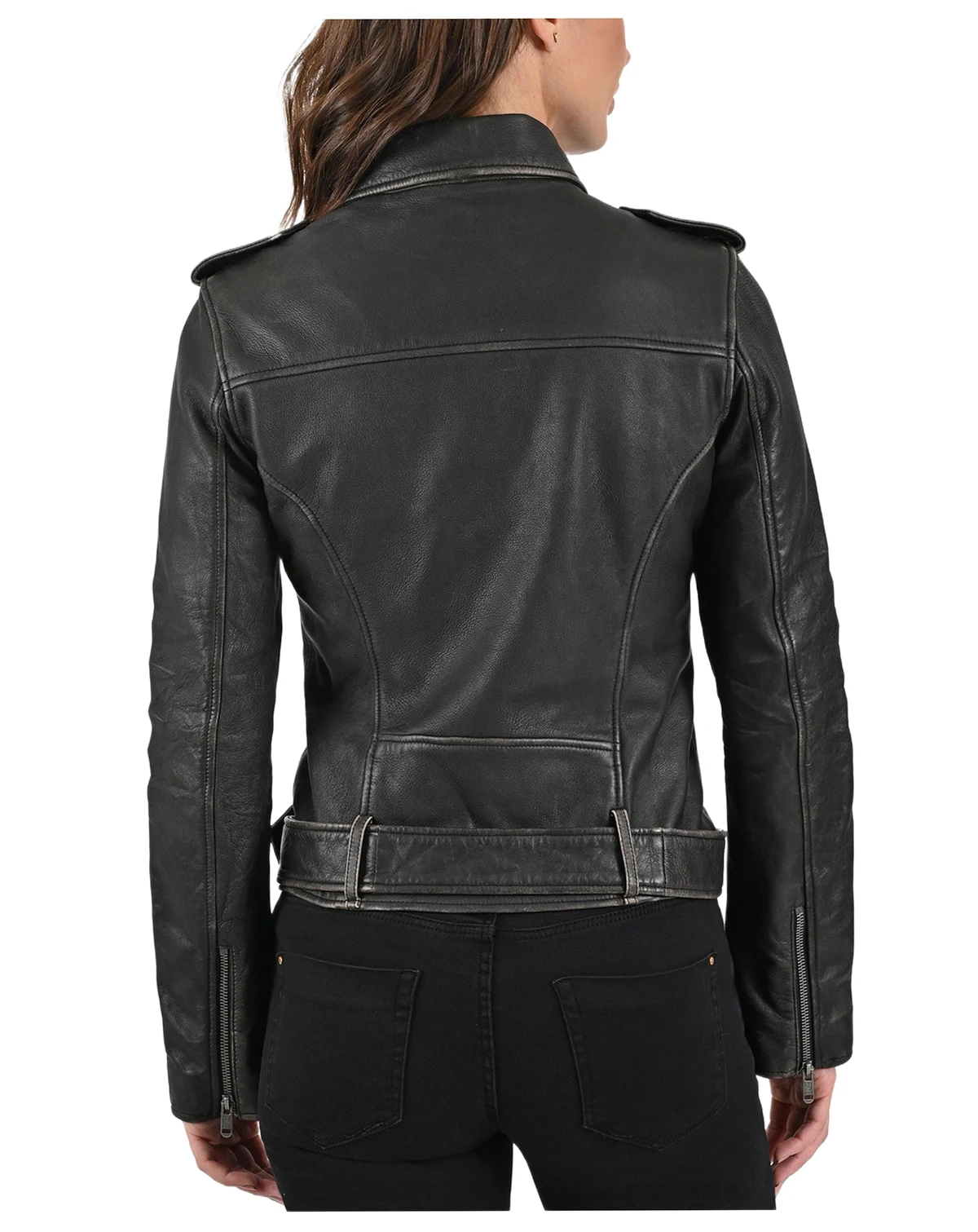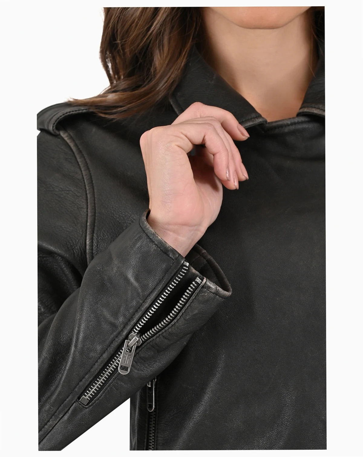 Made of sheepskin with a crackle finish in vintage style, it features adjustable cuffs with closure, epaulettes and a collar with custom snaps that enhance your biker style. Its soft interior and zippered rest pockets merge functionality and modernity, making it ideal for this season.