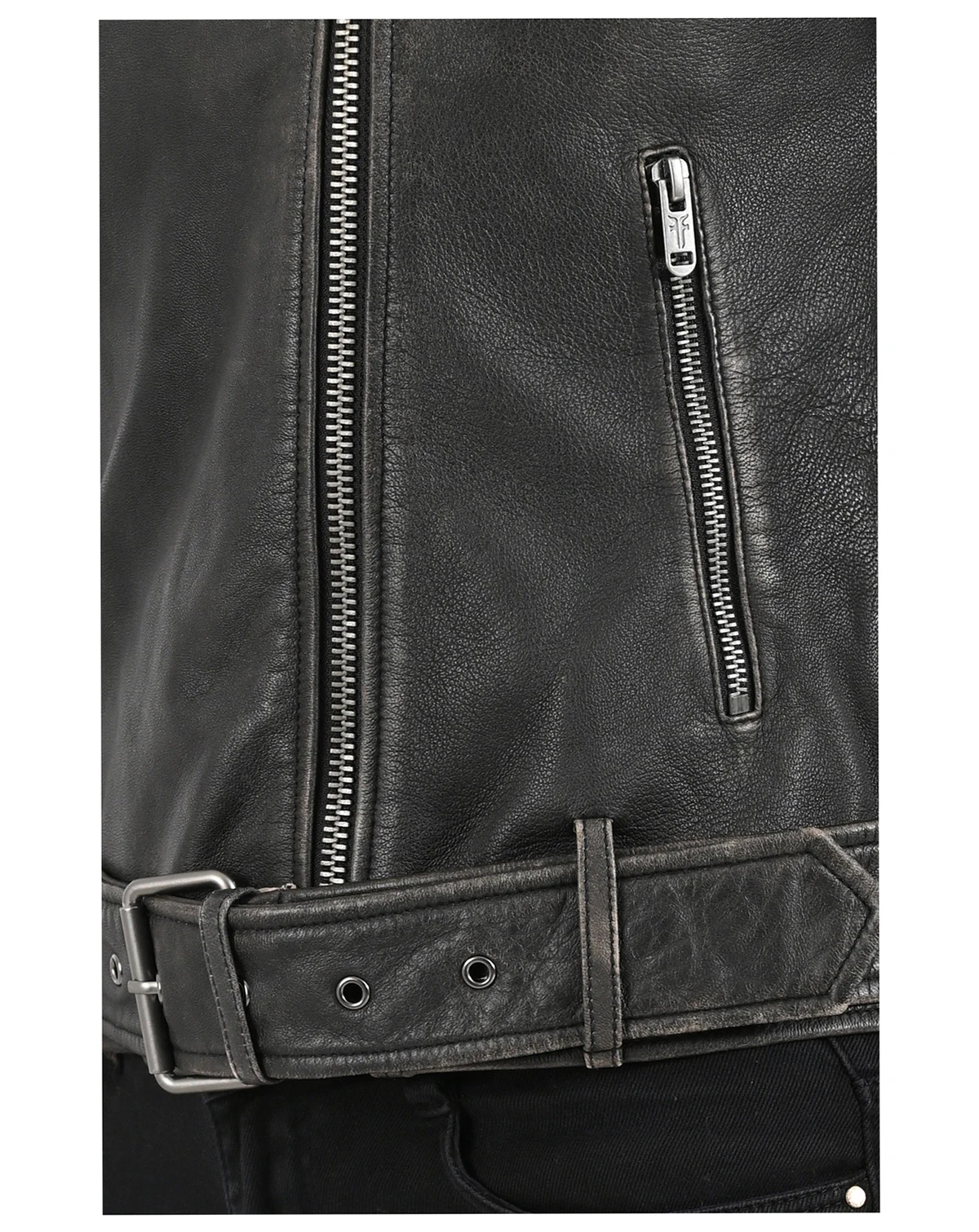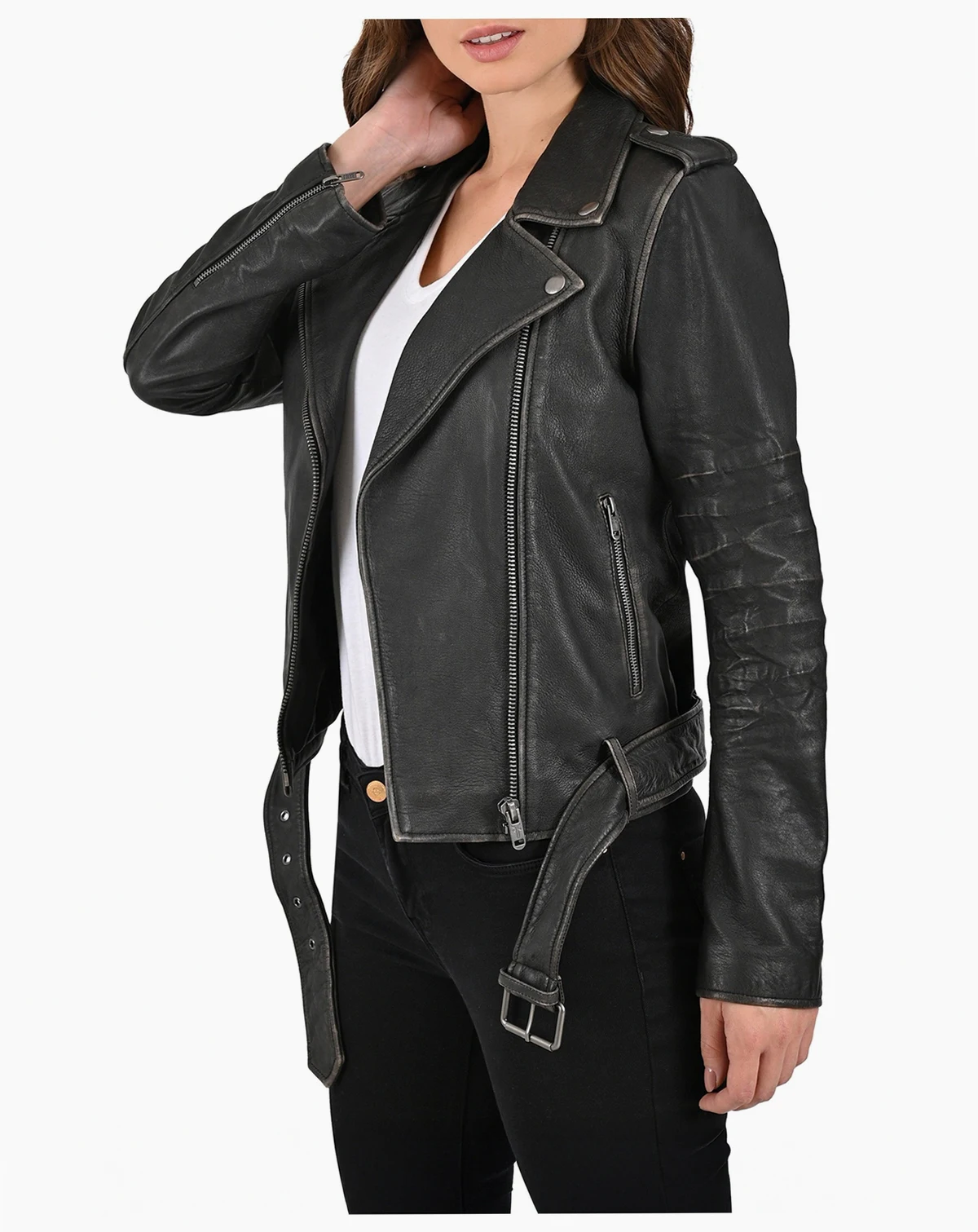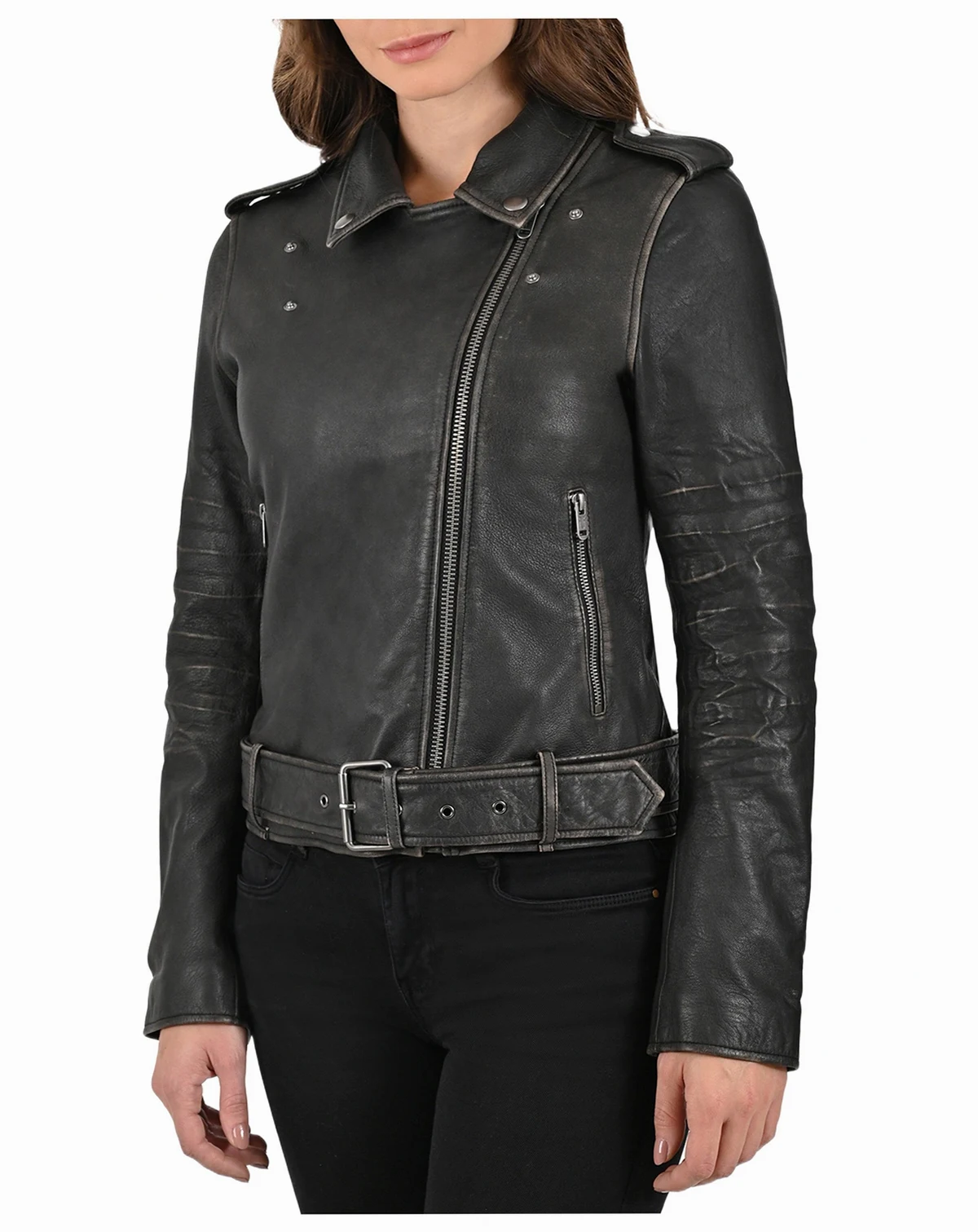 Made of sheepskin with a crackle finish in vintage style, it features adjustable cuffs with closure, epaulettes and a collar with custom snaps that enhance your biker style. Its soft interior and zippered rest pockets merge functionality and modernity, making it ideal for this season.