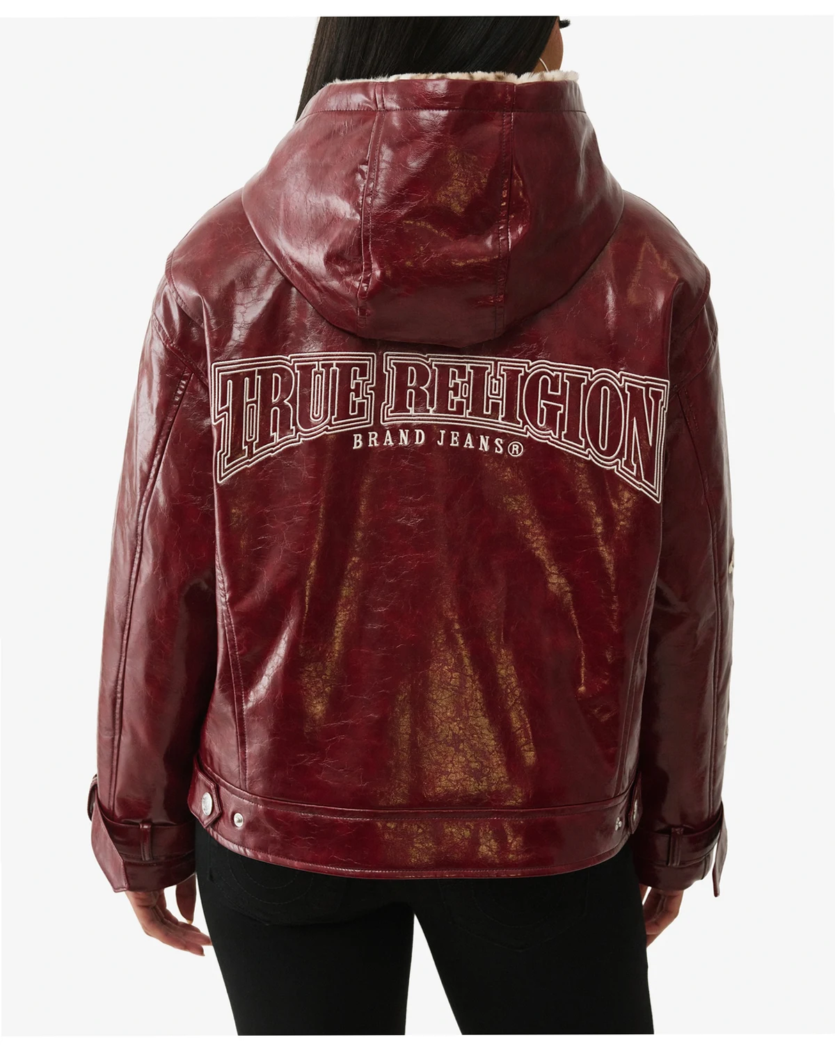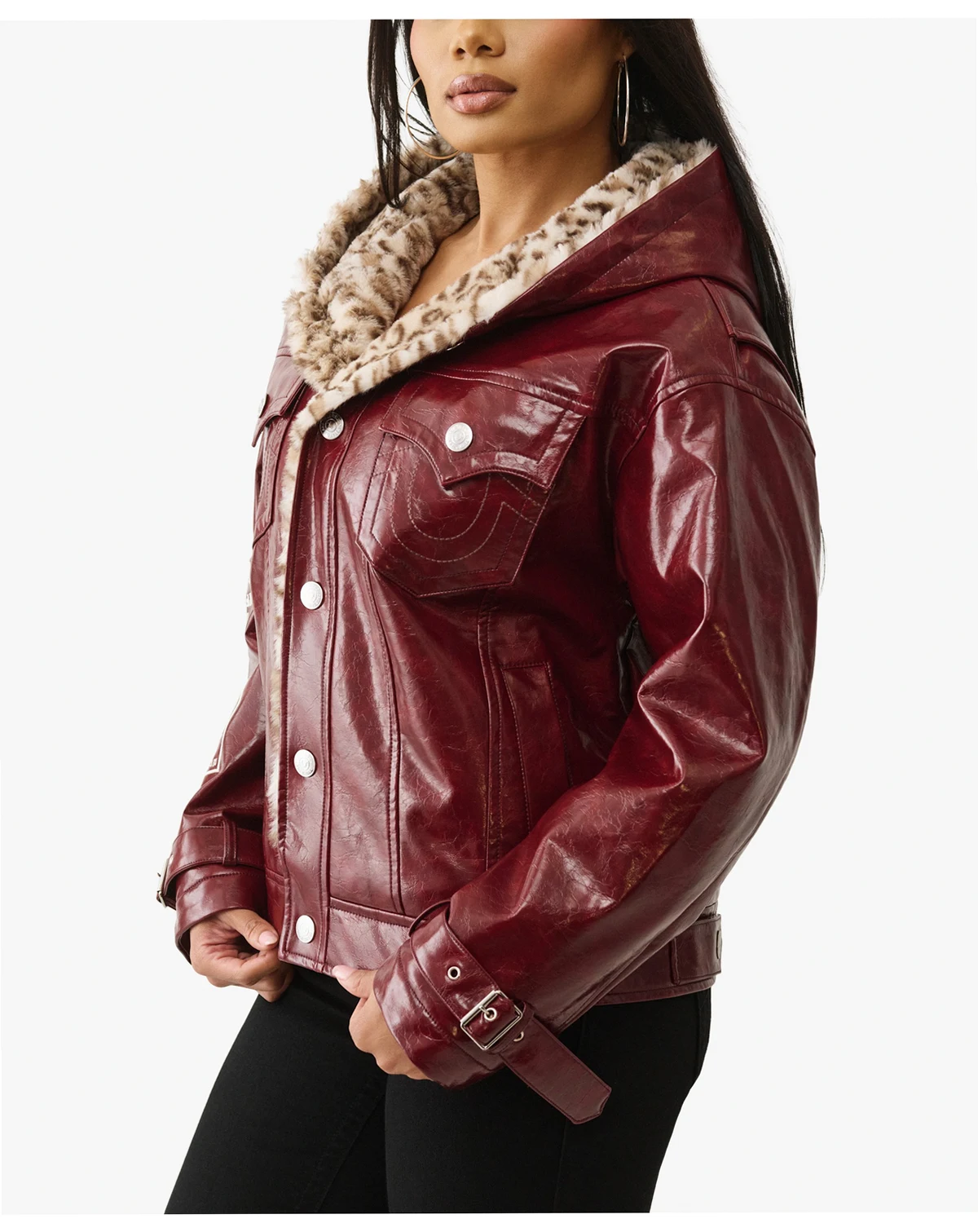 The Oversized Faux Patent Leather Jacket is a True Fall essential. This women's polyester lined jacket features a hood, and a snap-up and button closure. Finished with chest front pockets on the chest, side, slashed pockets and sleeve and back logo details.