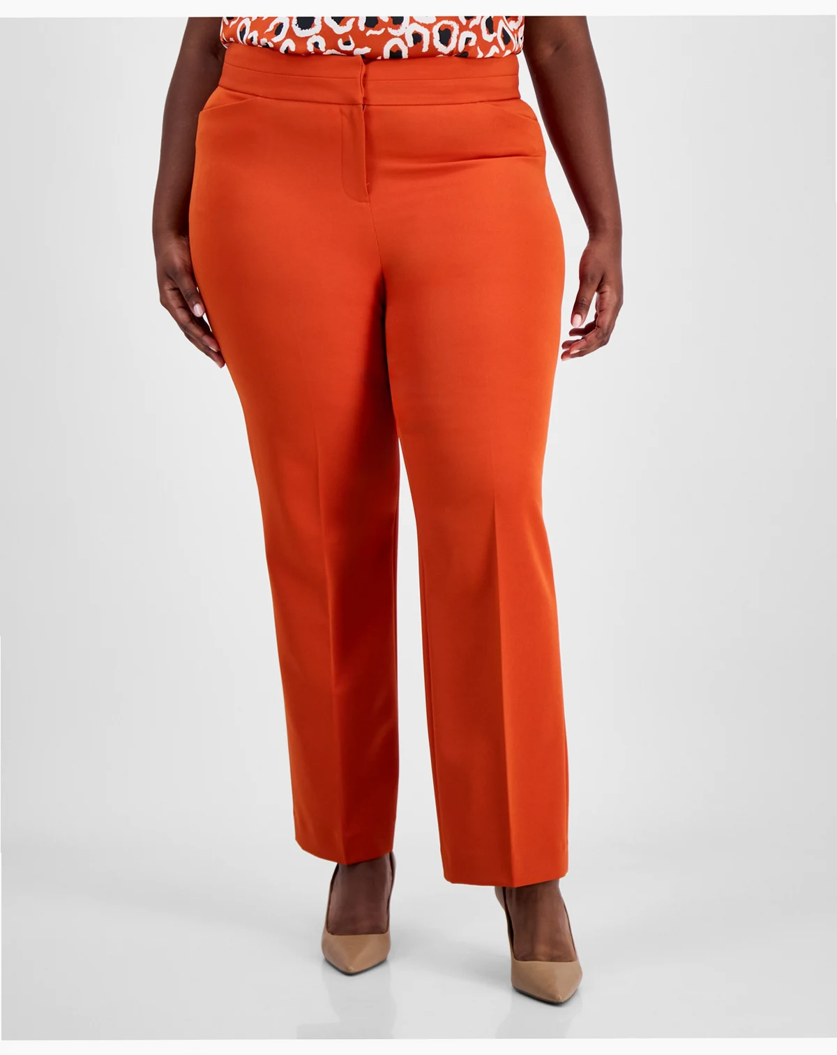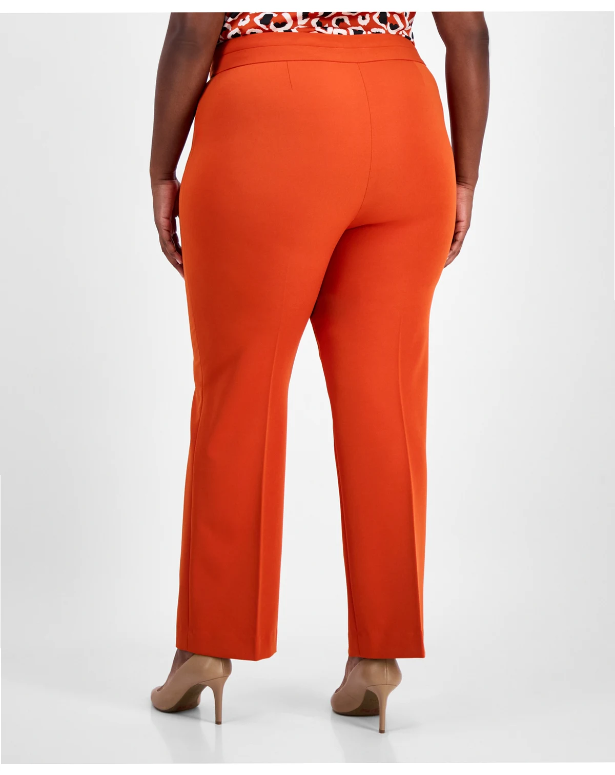 A classic mid-rise style is modernized with a chic and oh so sleek bell bottom style, with a confident color palette, make these plus size pants by Tahari ASL the main event of your career look.