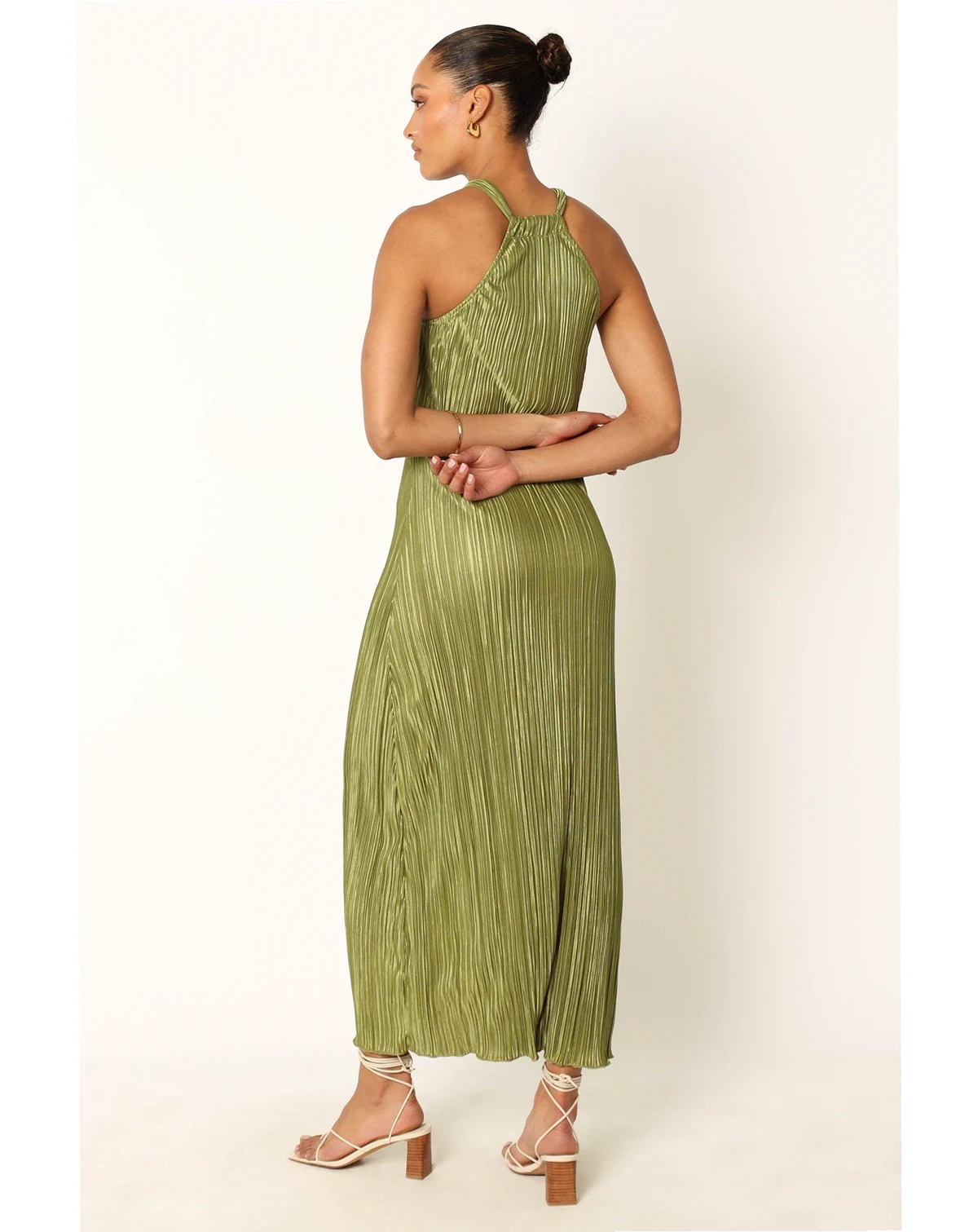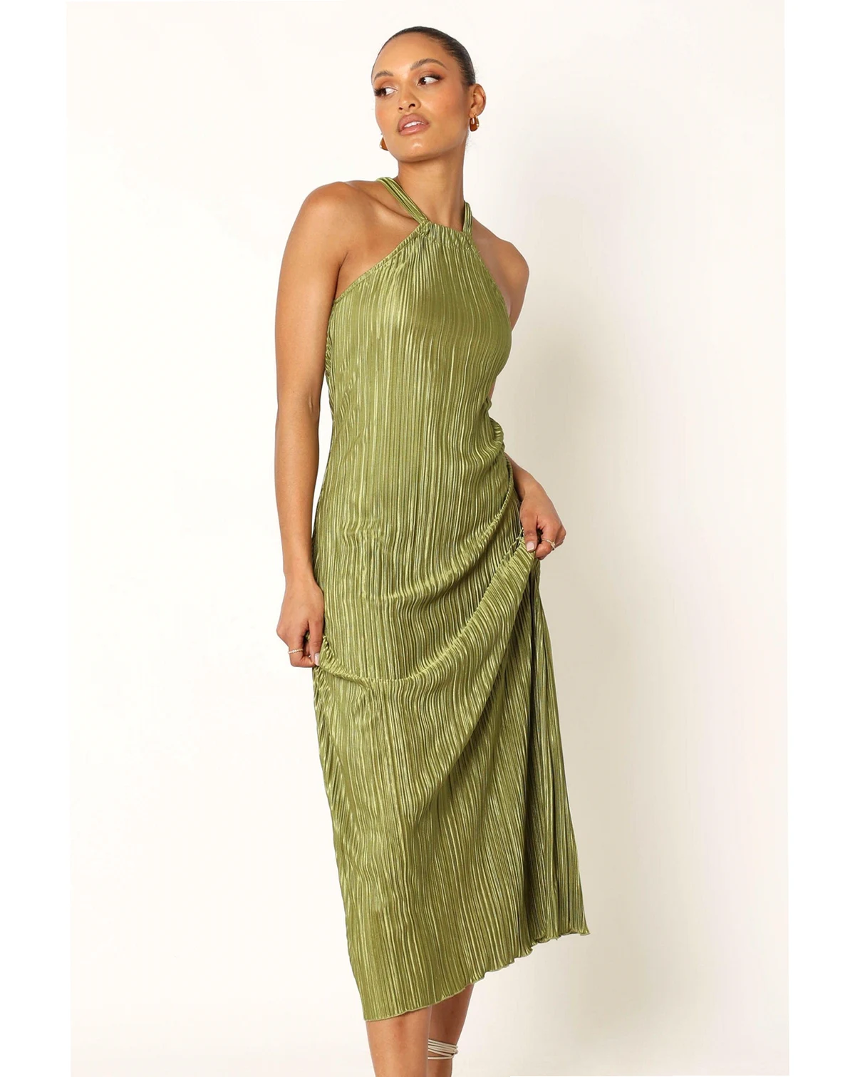 This season, update your wardrobe with this stunning midi dress that combines effortless style and feminine charm. Featuring a classic halterneck style neckline and sleeveless design, the dress is made from light plisse material for an elegant drape.