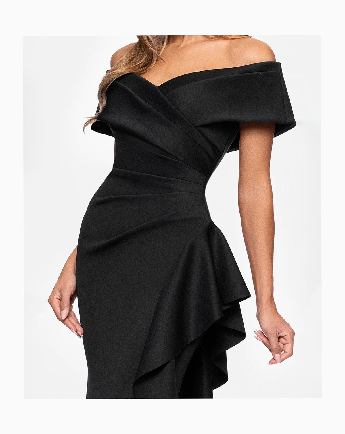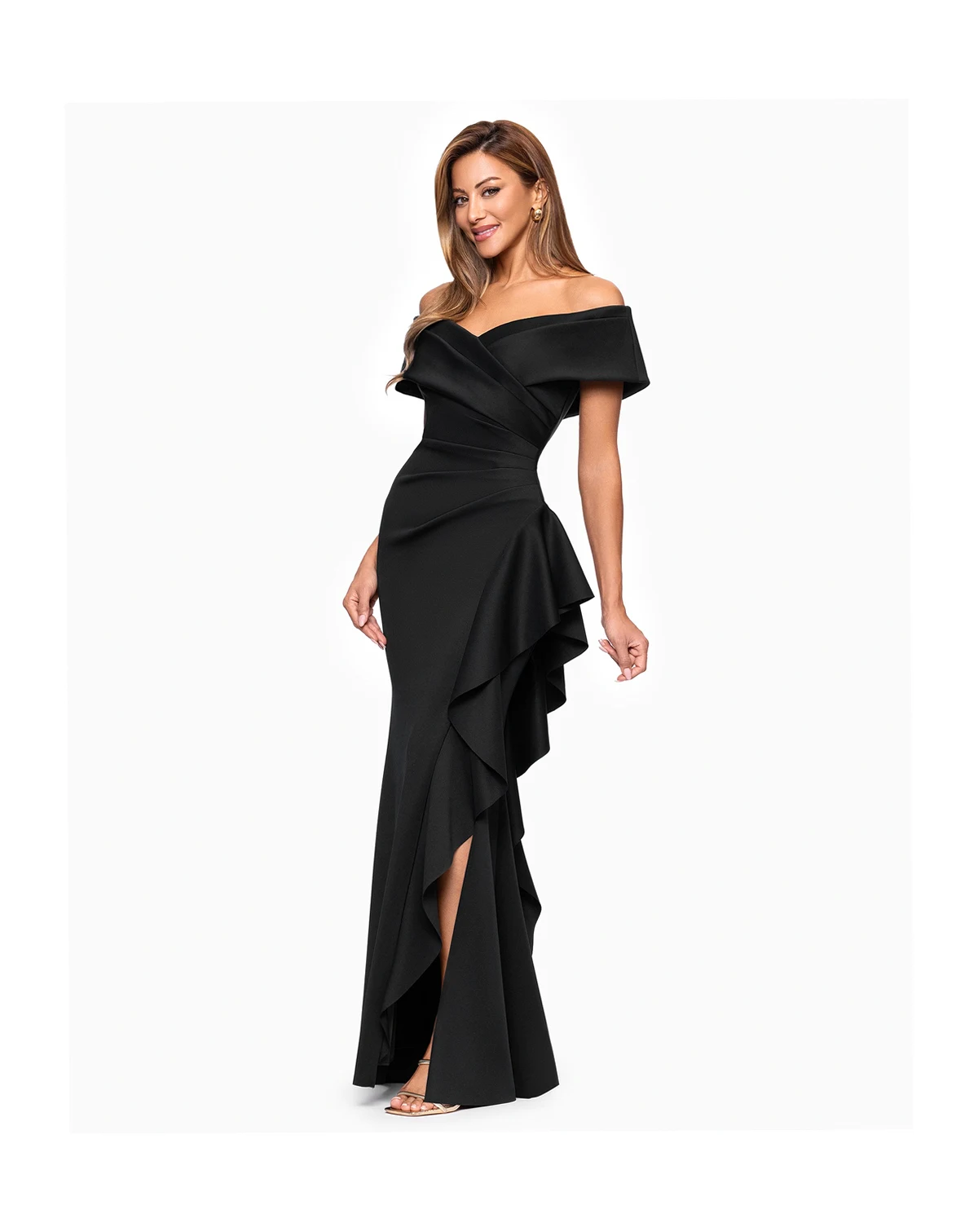Add dramatic flair with this off-the-shoulder long dress from XSCAPE, featuring a side ruffle detail. The sweetheart neckline creates a beautiful balance between structure and softness.