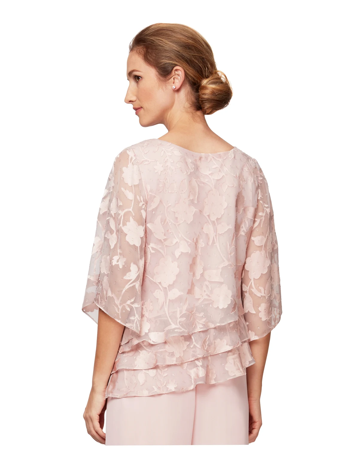 Elevate your wardrobe with this Alex Evenings burnout chiffon blouse, featuring a boat neckline for a refined touch. Its 3/4-length sleeves and easy slip-on style make it suitable for dressy occasions or elegant layering.