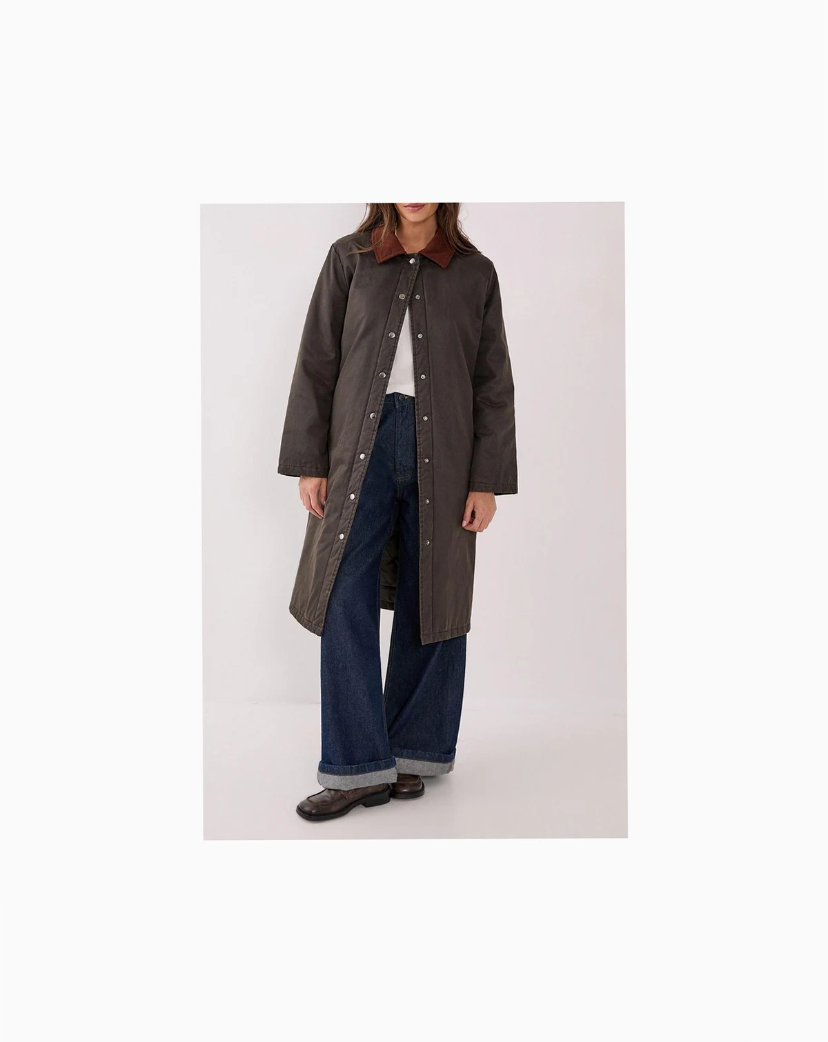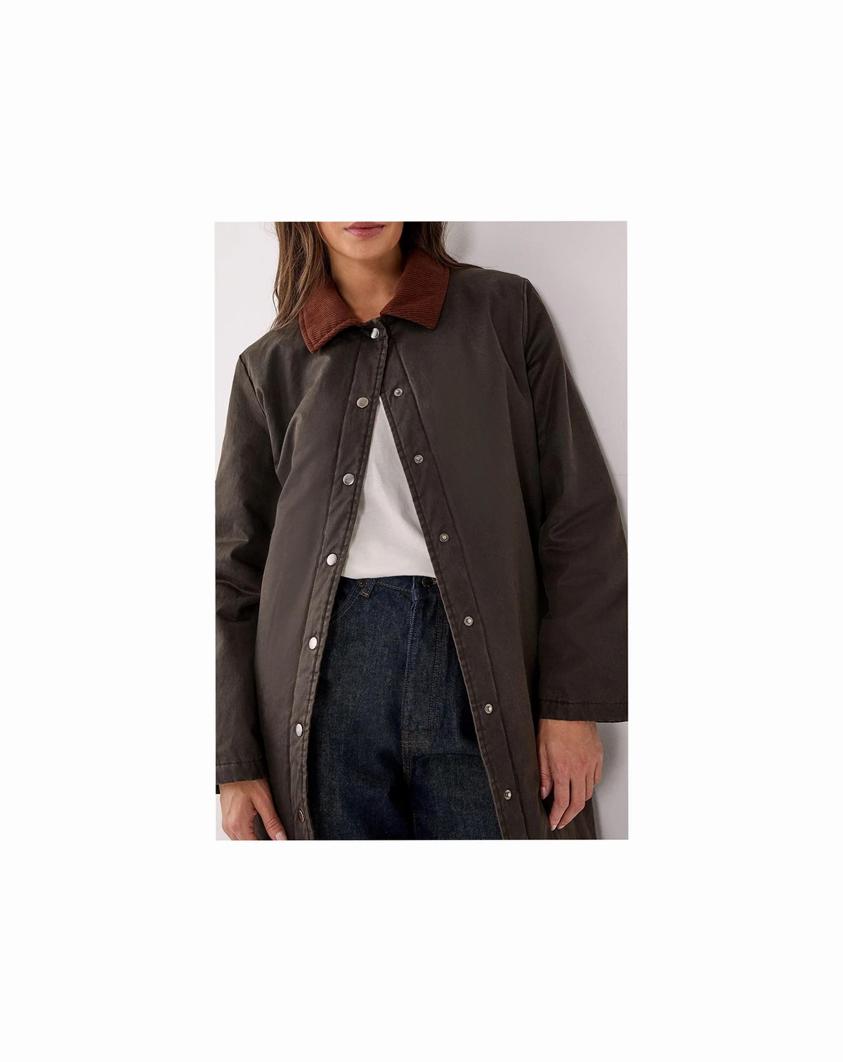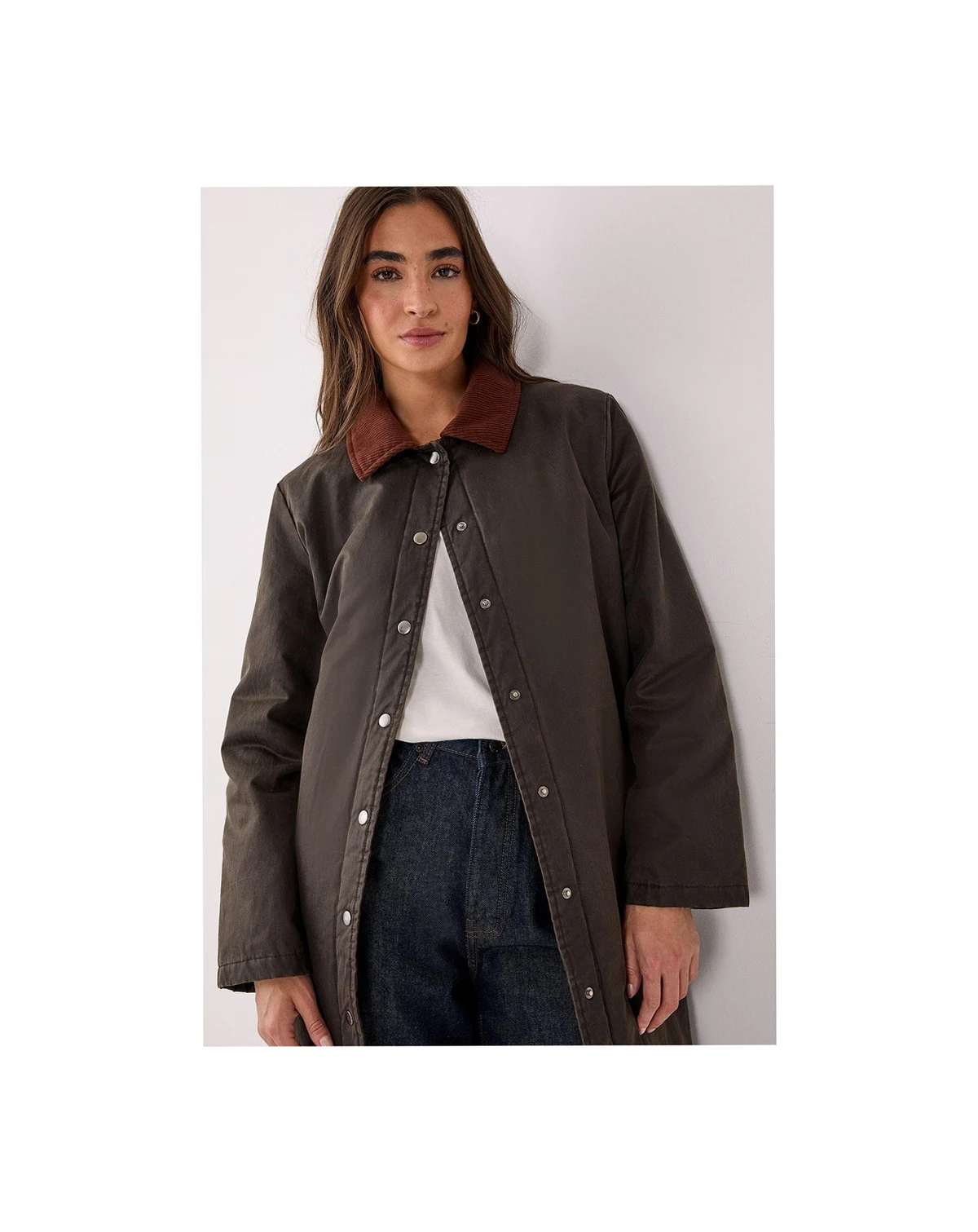 Make a statement in this distinctive longline coat featuring a wax effect finish that combines practicality with style. The contrasting cord collar adds a touch of countryside charm to this city essential. Perfect for unpredictable weather, this coat offers both protection and style in equal measure. Layer over wide-leg jeans and a simple white tee for an effortlessly cool weekend look, or pair with a jumper dress and chunky boots when temperatures drop.