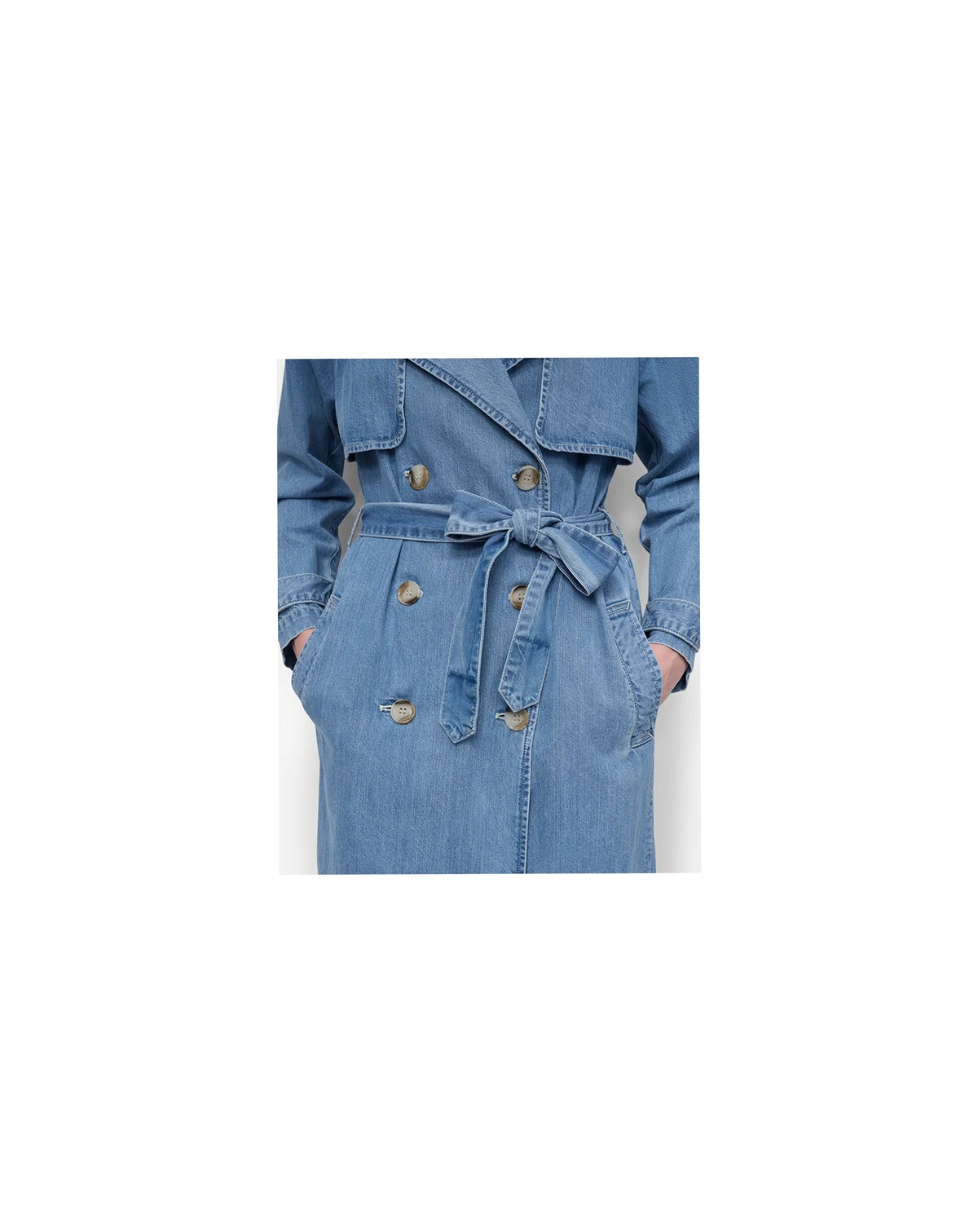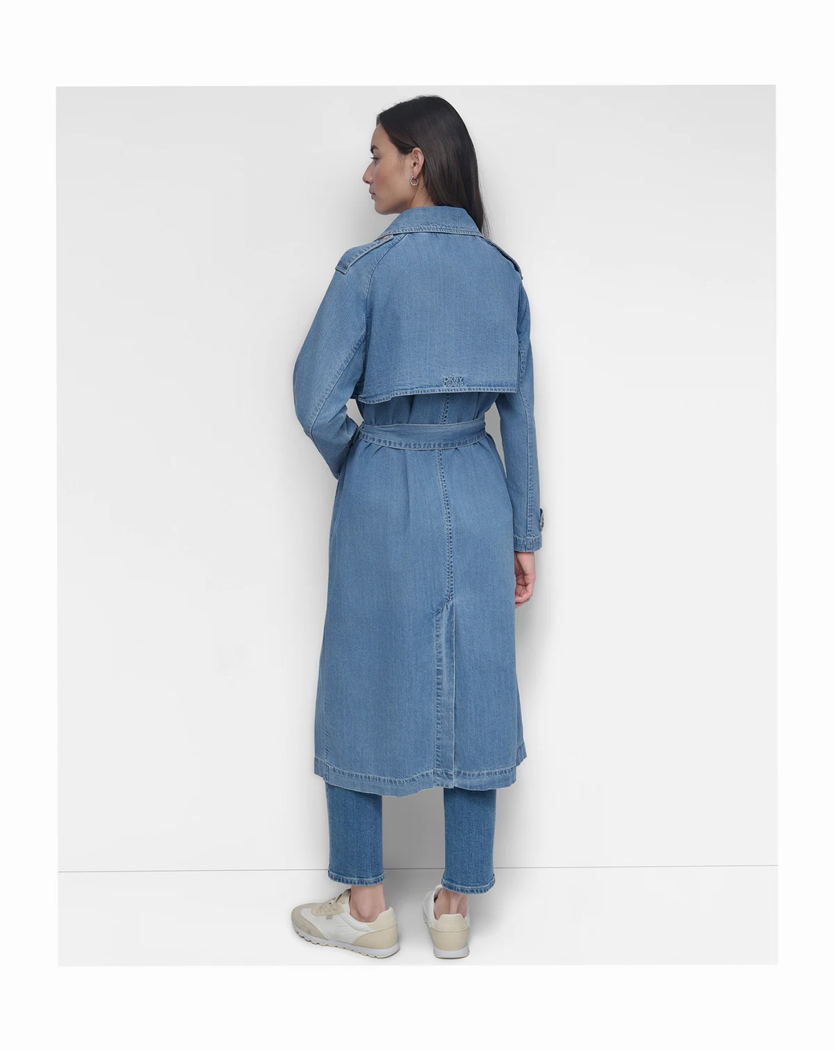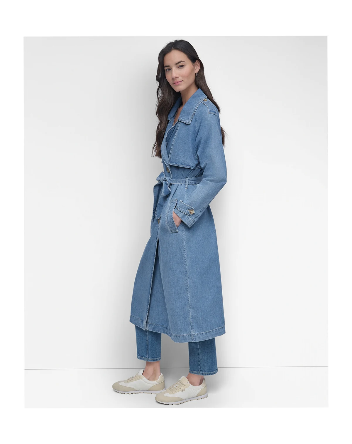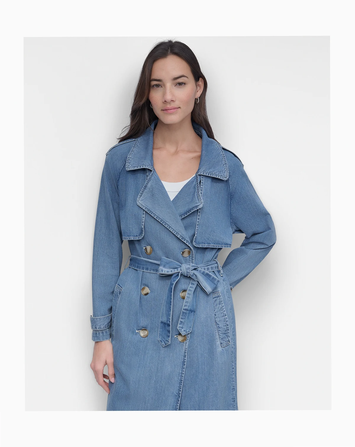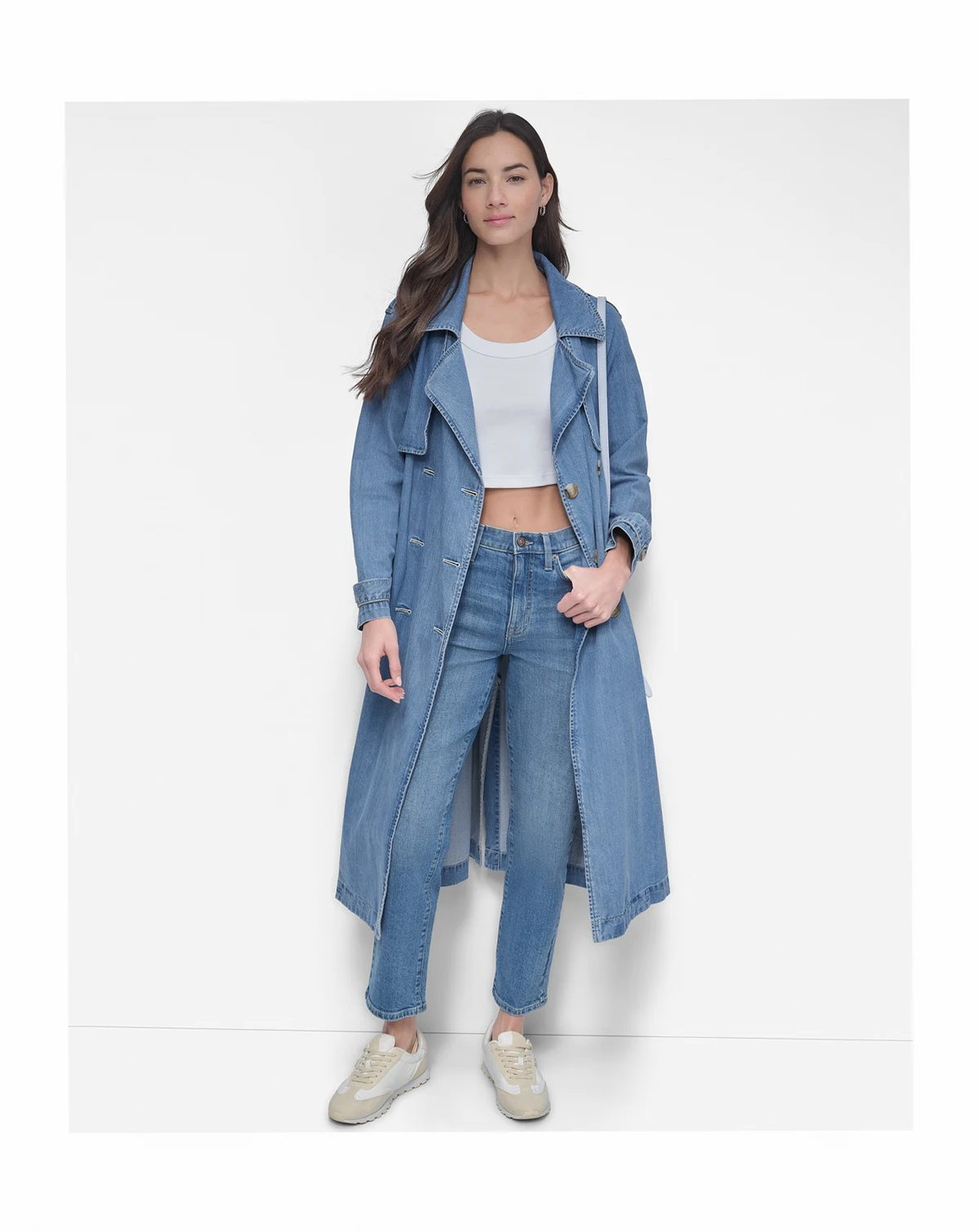 Timeless structure evolves in this DKNY Jeans trench coat crafted with a collared neckline for an elevated presence. A button-front closure complements a removable self-tie belt for adjustable definition, while two hand pockets offer everyday functionality.