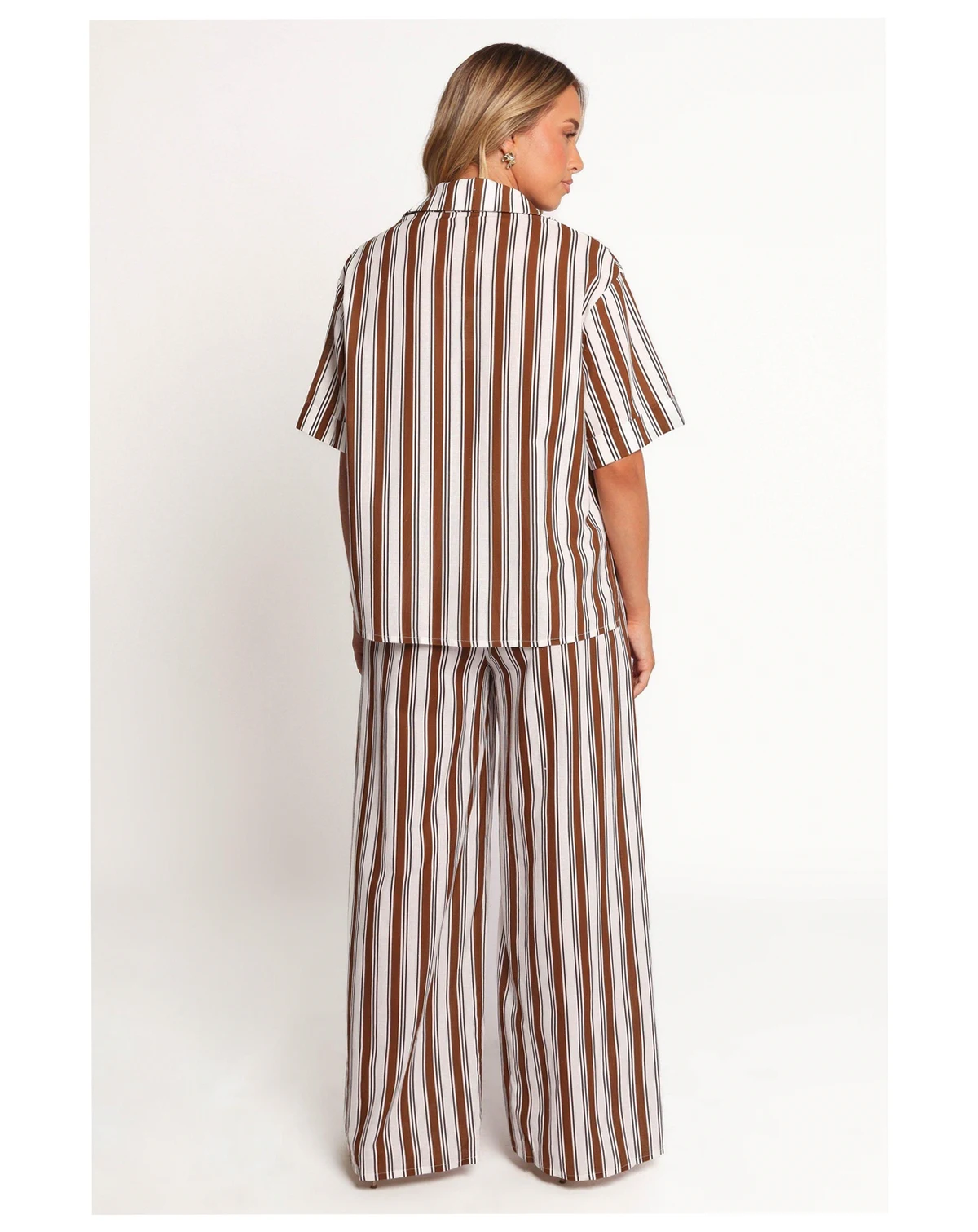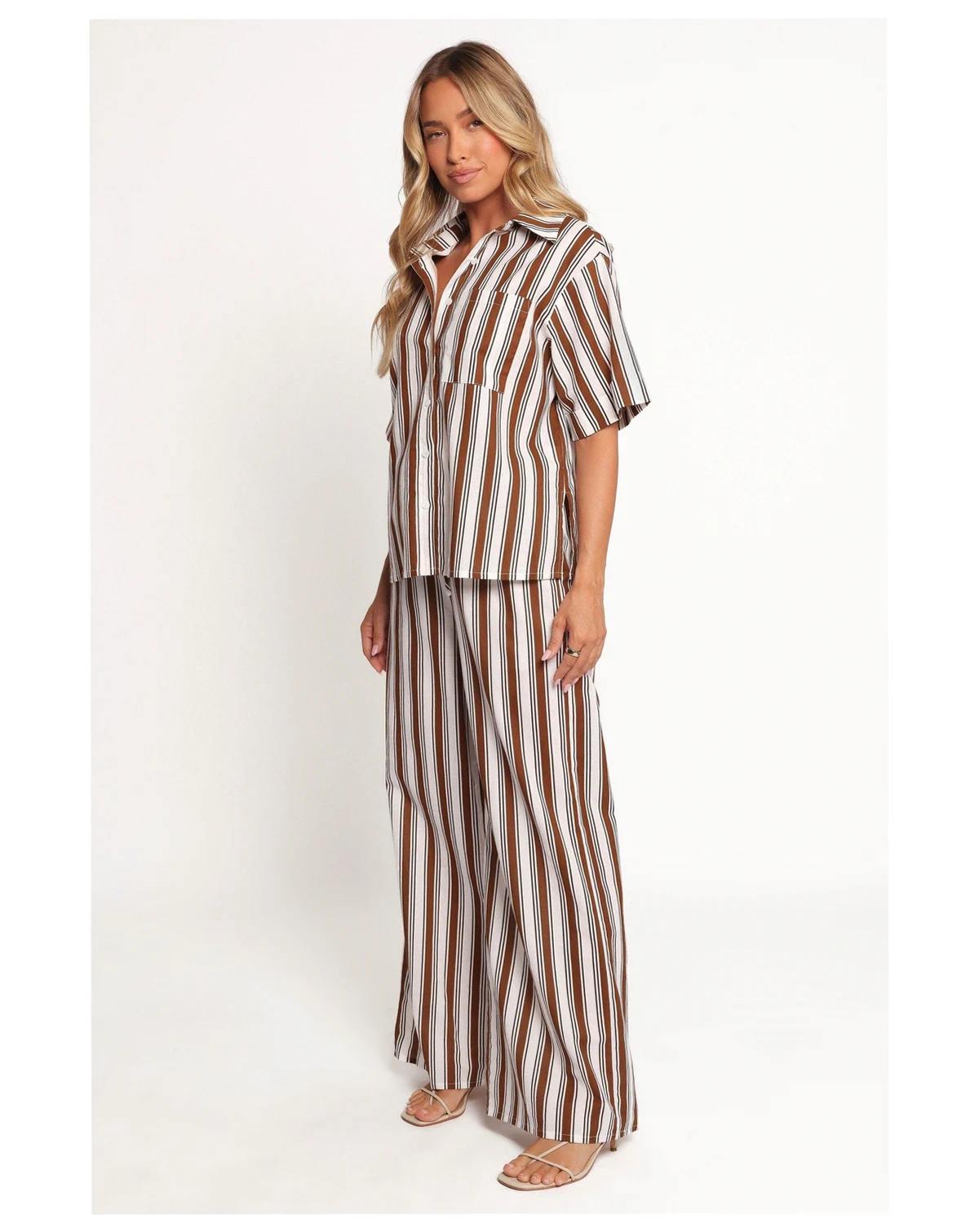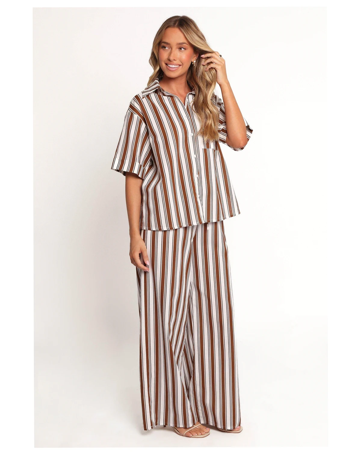 Elevate your everyday look with the effortlessly chic Thalia Wide Leg Pant in Chocolate Stripe. Designed with a flattering high-waisted silhouette and a comfortable elasticized drawstring waistband, these pants effortlessly combine style and ease.