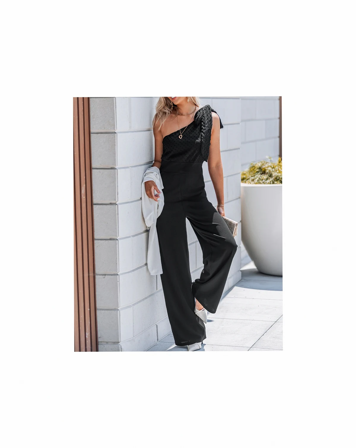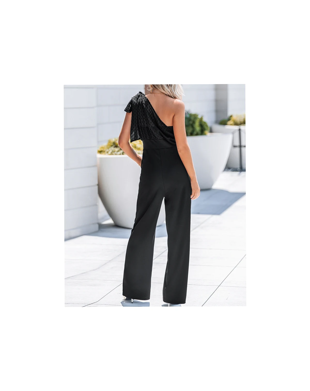 Turn heads with this chic one-shoulder jumpsuit, featuring a stylish bow tie detail that adds a touch of elegance. The high-waist fit and wide-leg pants create a flattering silhouette while ensuring comfort and ease of movement. Product Code: DAA13E5F011AA