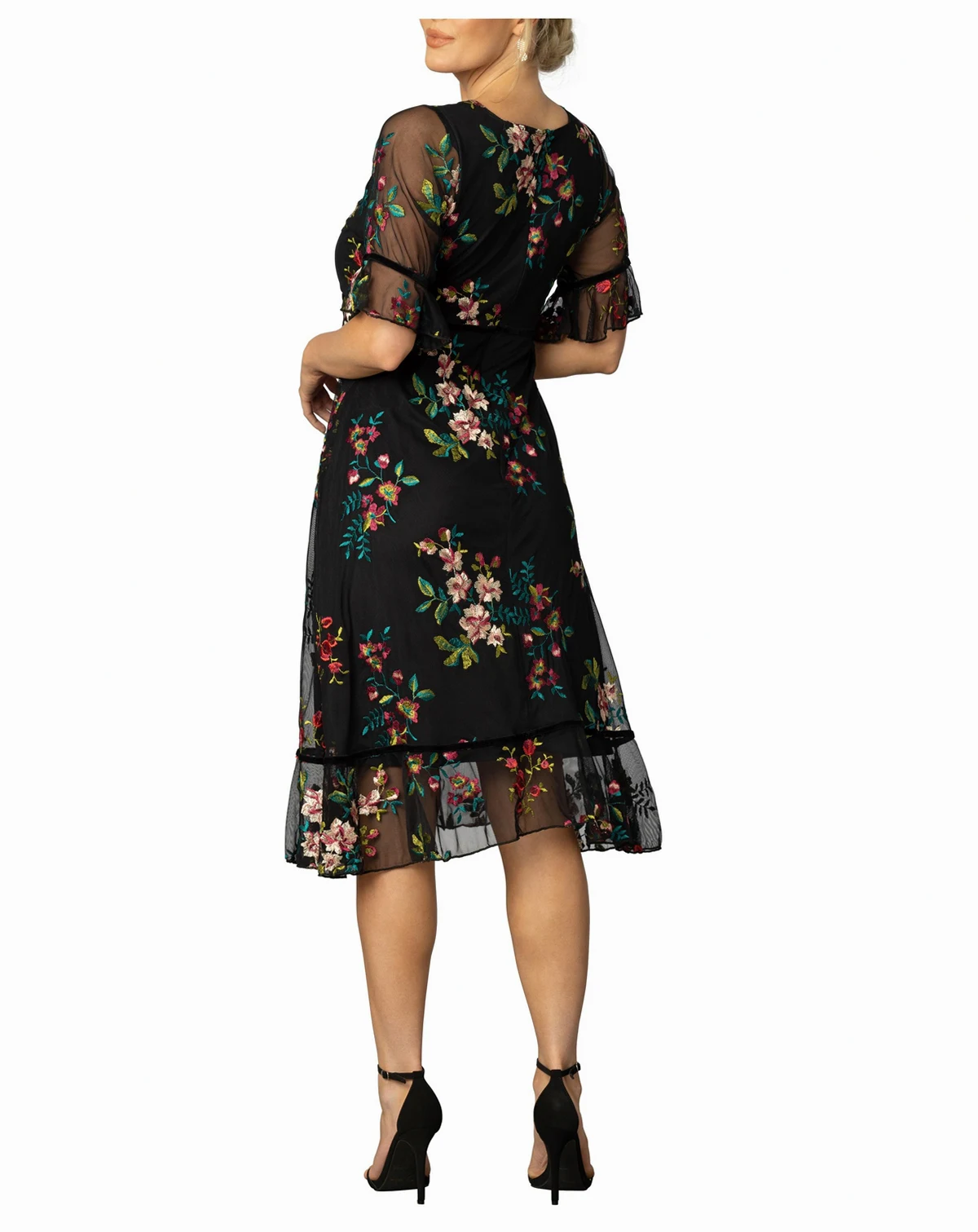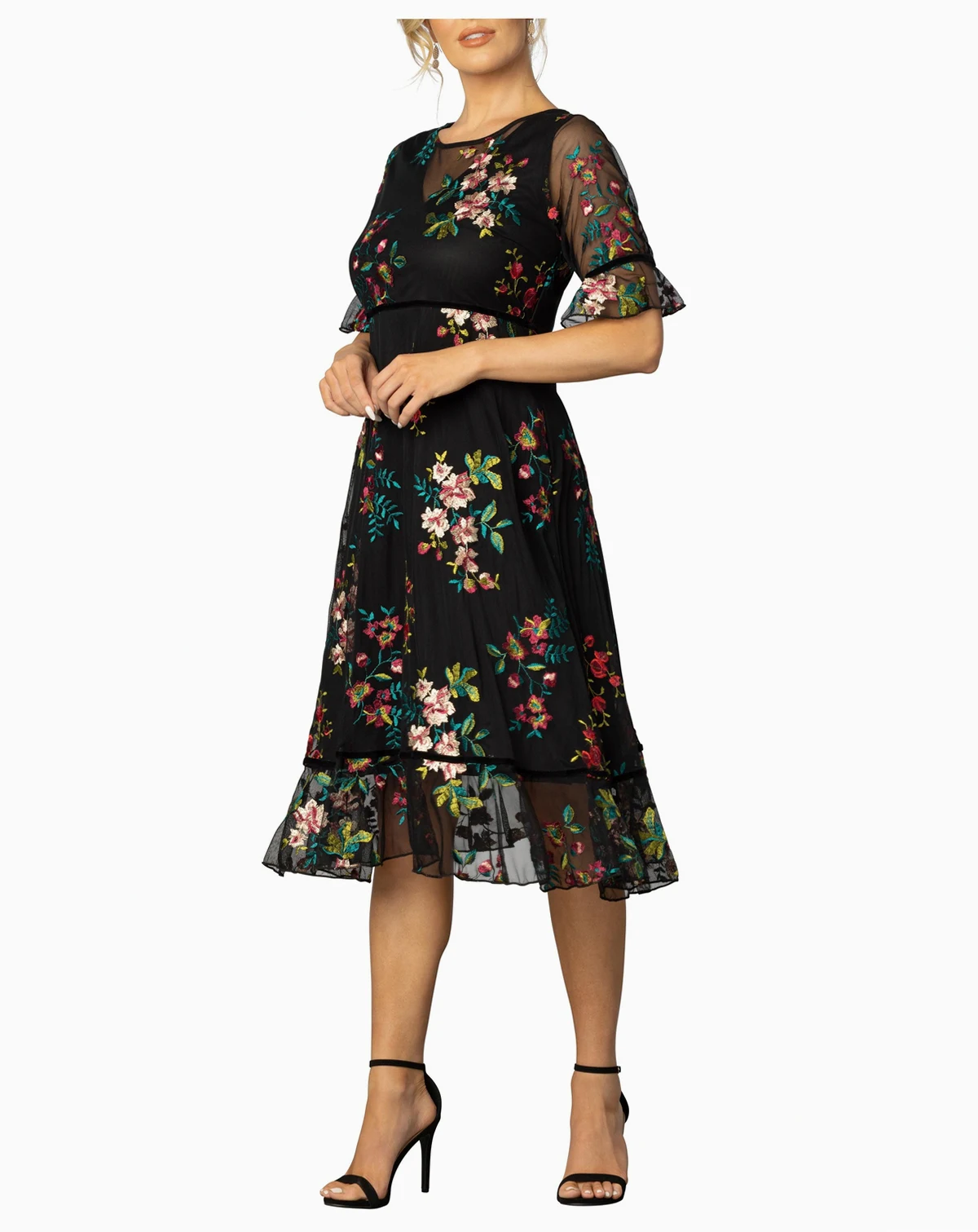 The Wildflower Embroidered Floral Mesh Dress is adorned with velvet trim touches, playful flounces, an A-line silhouette, and lined bodice and skirt. A perfect midi cocktail dress for any special occasion or formal party and a wedding guest favorite. Available in women s regular and plus sizes.