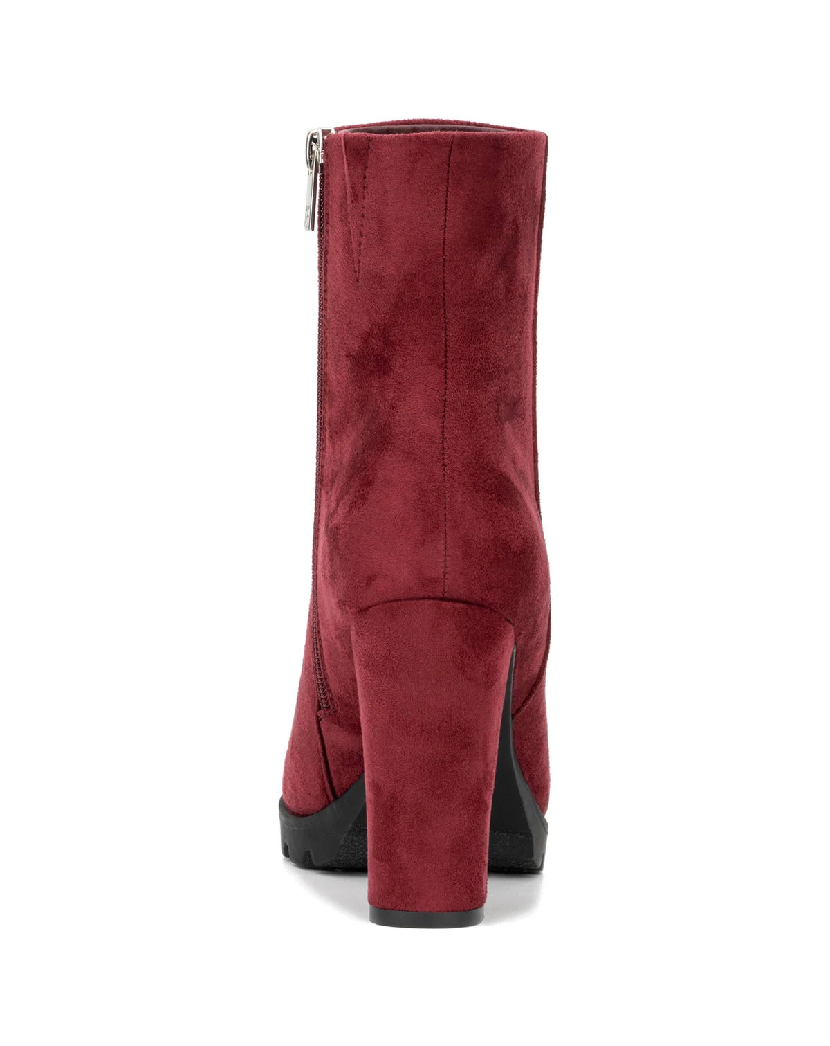 The Araceli bootie boasts a sharp design with a platform lugged sole, block heel, almond toe and side zip closure.