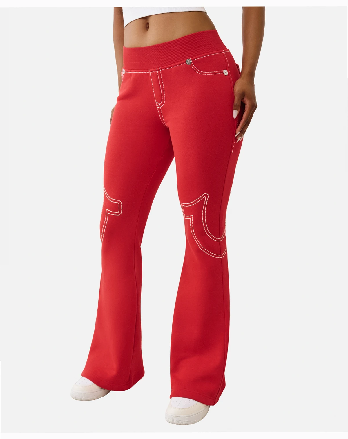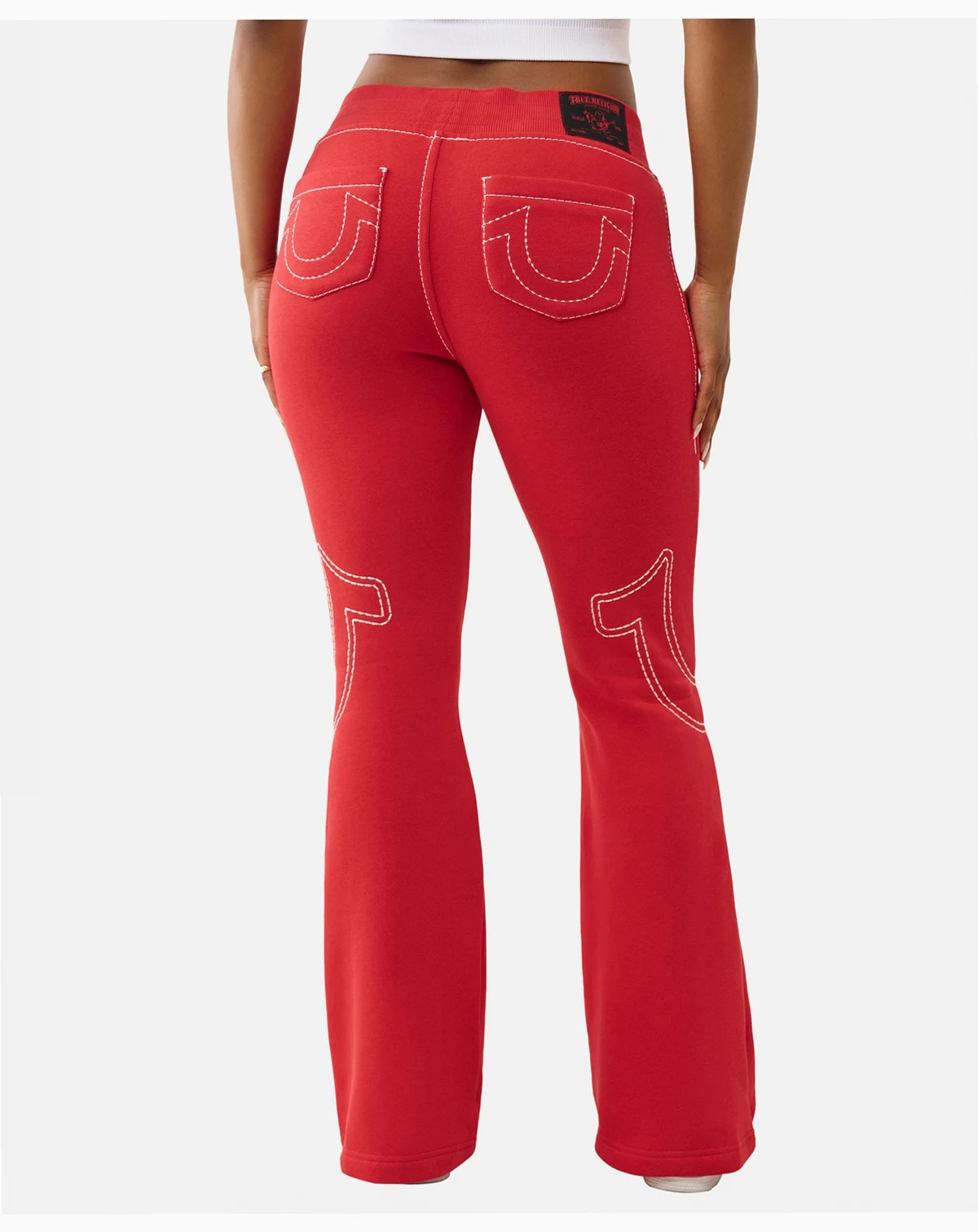 Fleece-lined and crafted from a cozy cotton blend, these women's anniversary pants feature a drawstring front, side pockets, mid-rise waist, and a flare hem. Finished with contrast Big T stitching and embroidered horseshoe detailing on the legs.