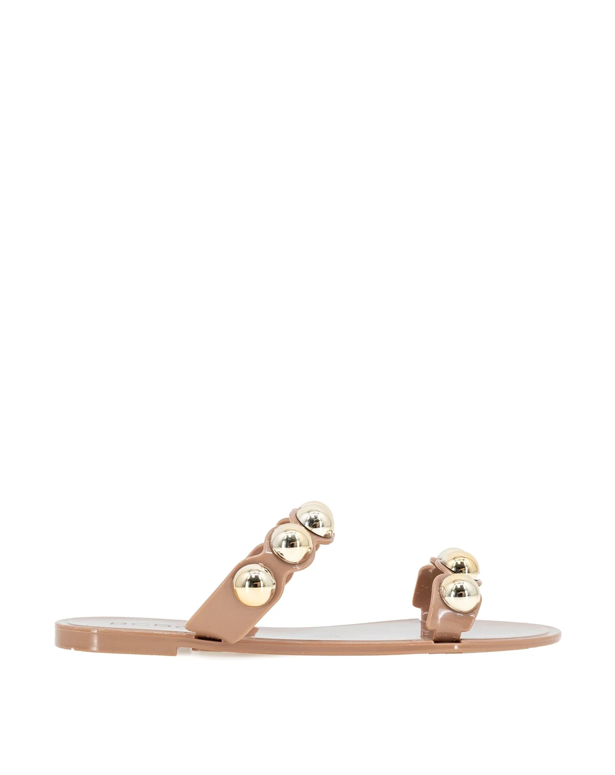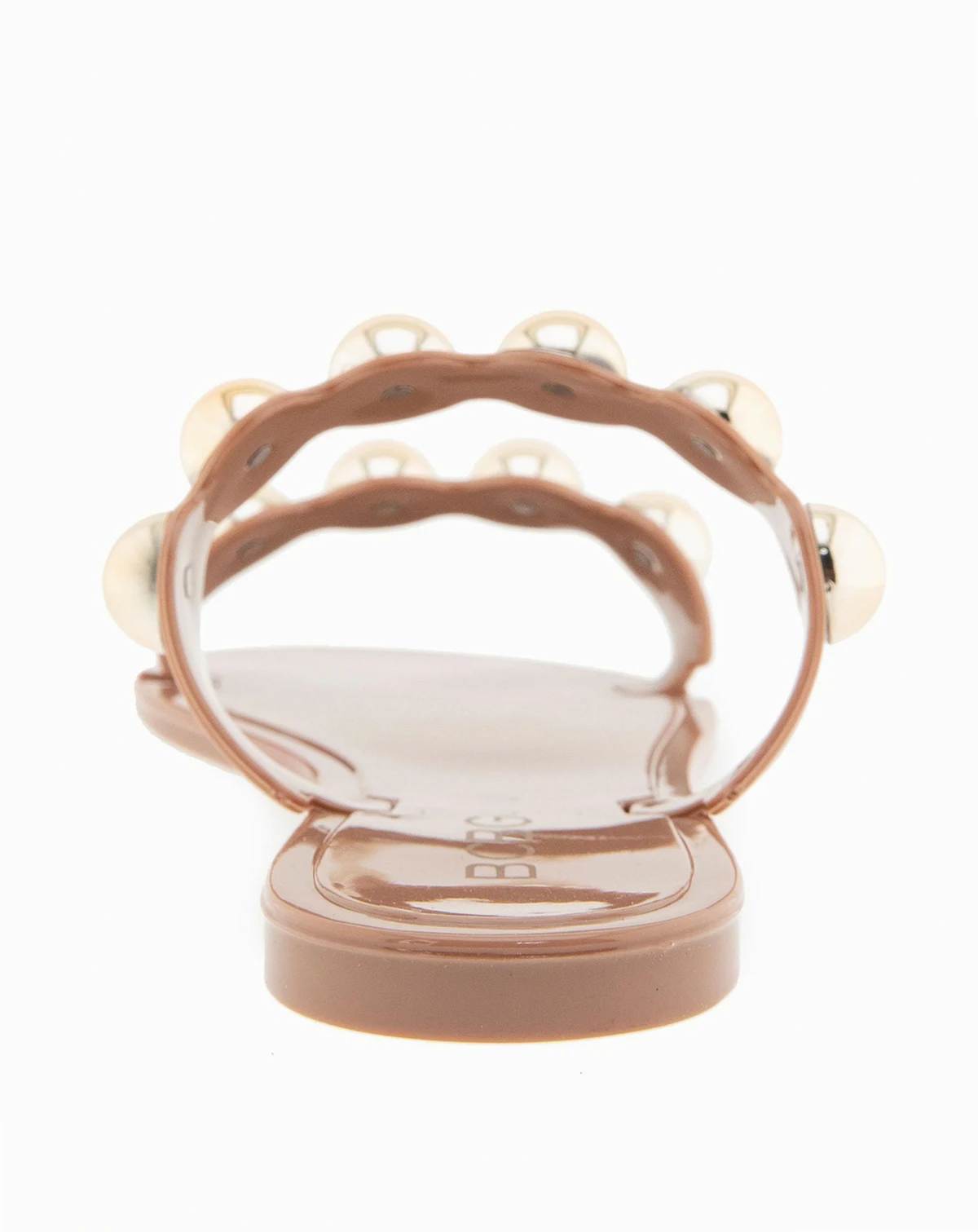 The BCBG Nicola is a playful flat jelly slide sandal, accented with bold oversized studs that add a confident, fashion forward edge to its effortless slip on silhouette.