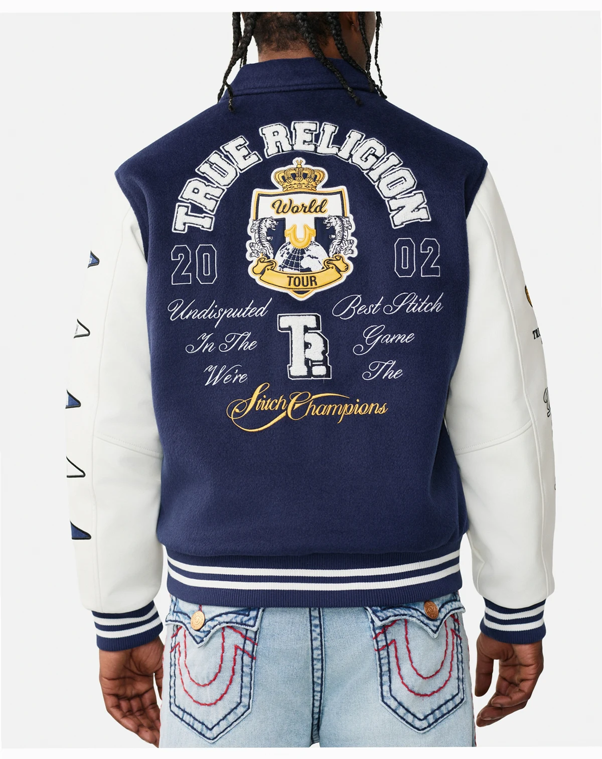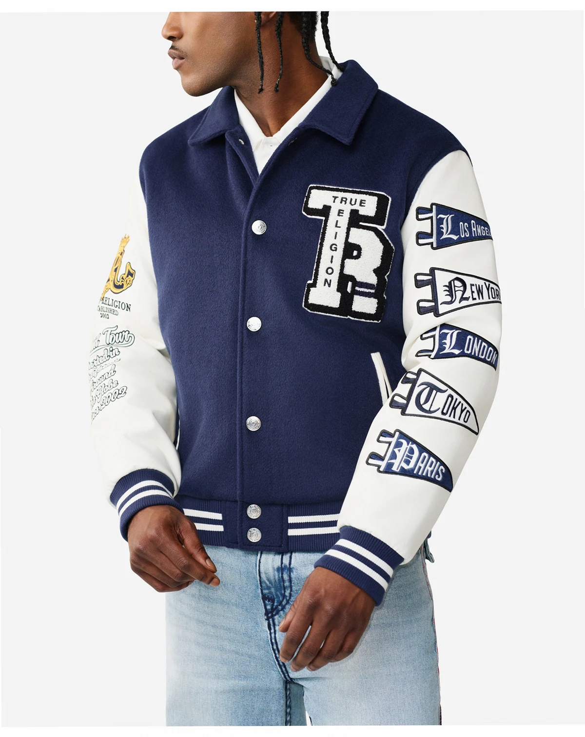 Infuse your wardrobe with varsity-inspired flair in this True Religion jacket, featuring a bold trim and a shiny snap button closure for a sporty yet refined look. Branded embroidery and patches throughout add distinctive character, while the regular fit ensures timeless style.