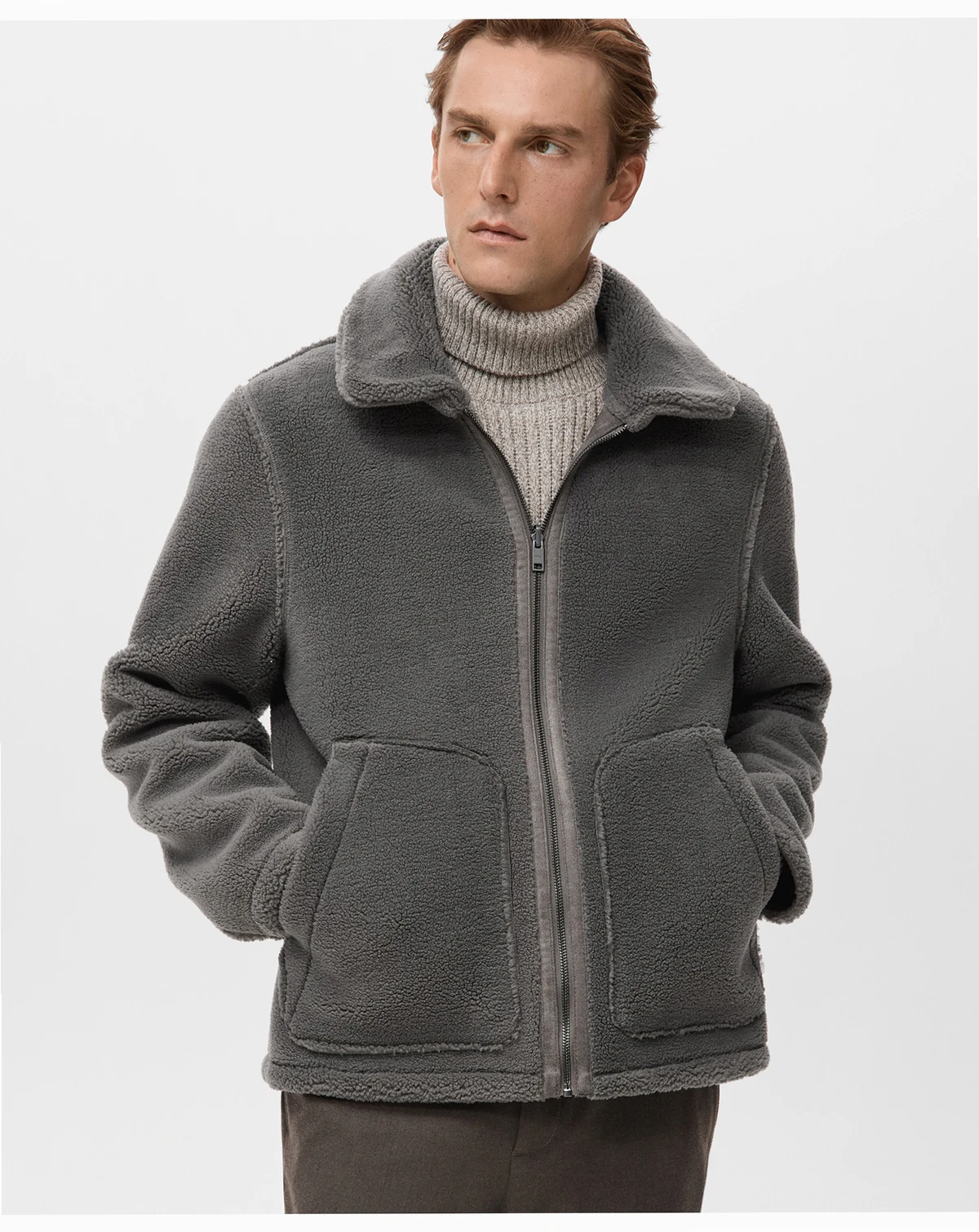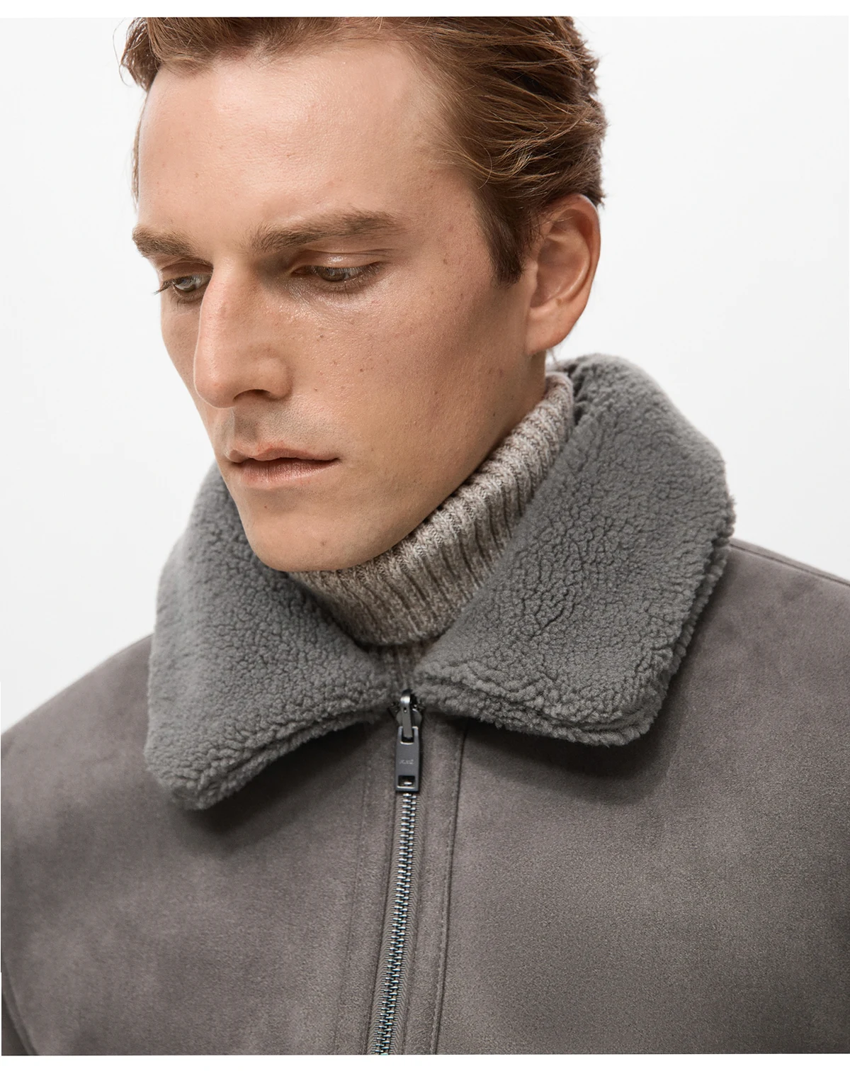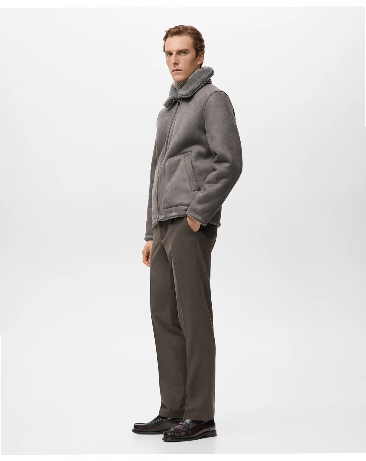 Build cold-weather looks with the Double Face Jacket with Fleece Lining from Mango. Made from polyester, this regular fit jacket features faux shearling interior, faux shearling collar, front zip closure, long sleeves, and two side pockets.