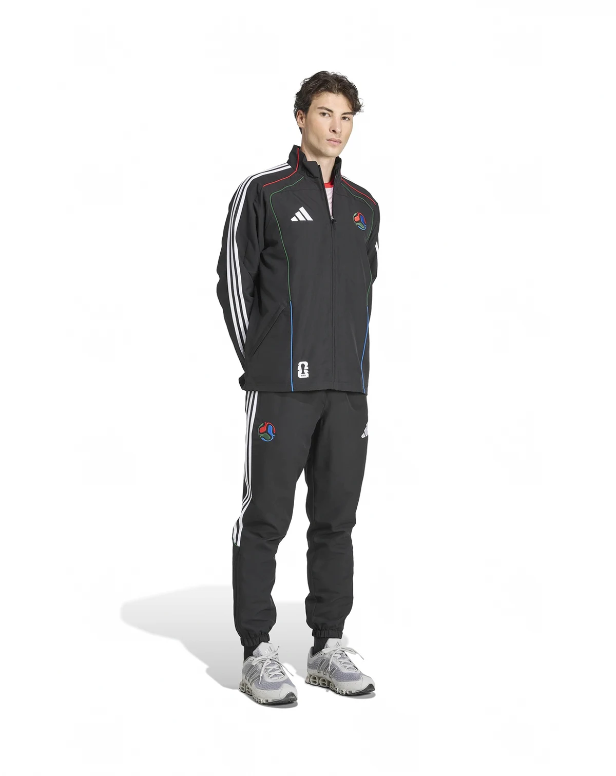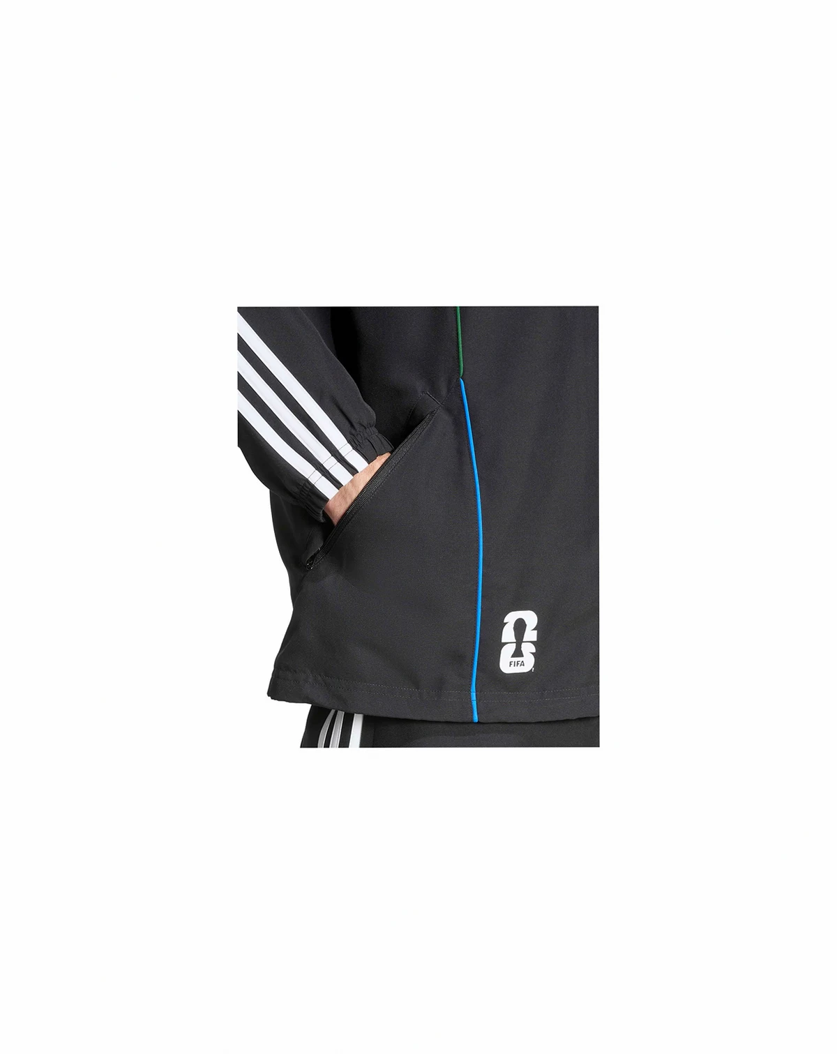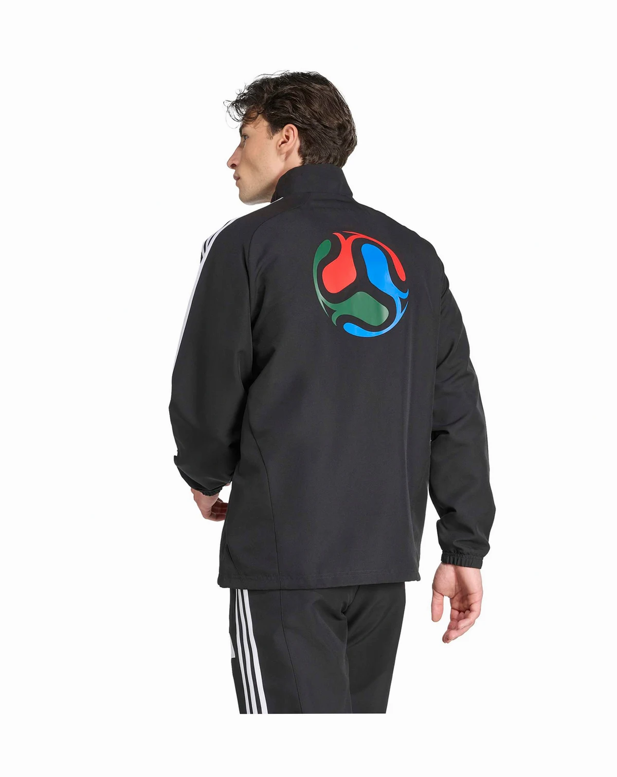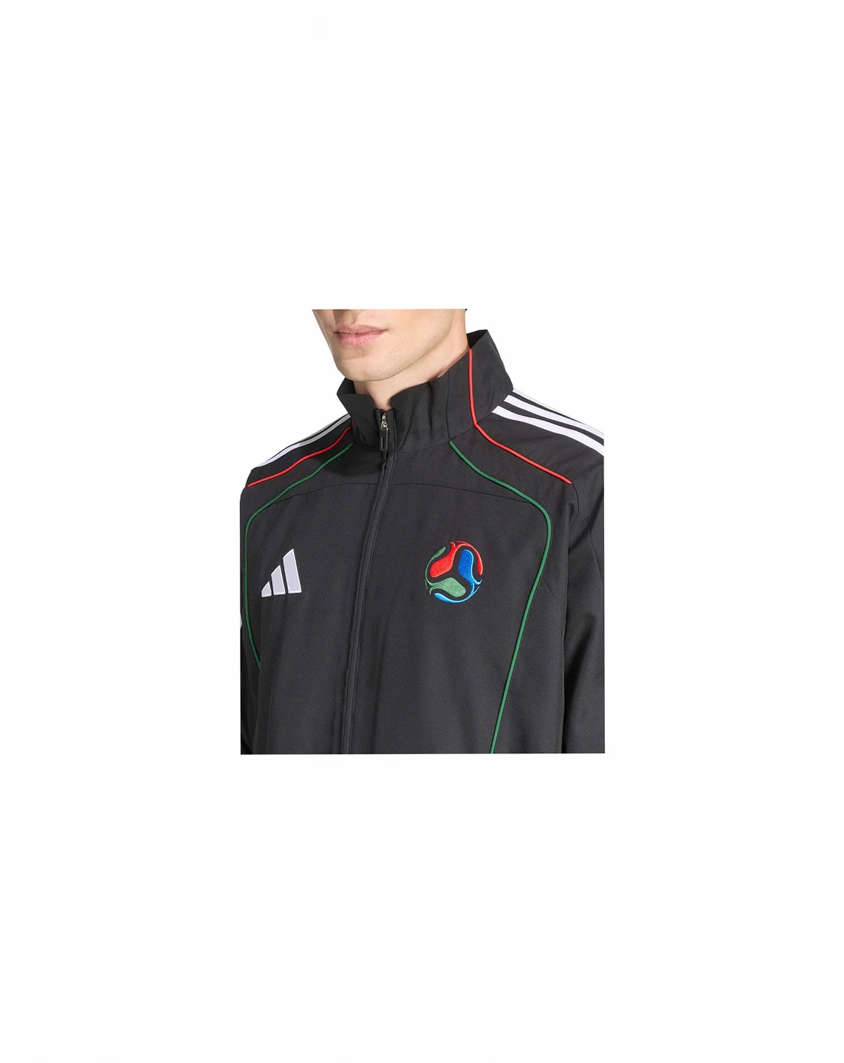 Celebrating football culture, this track top from adidas features a stand-up collar and full zip closure for a sleek look. The regular fit and smooth-finish fabric deliver both comfort and statement style.