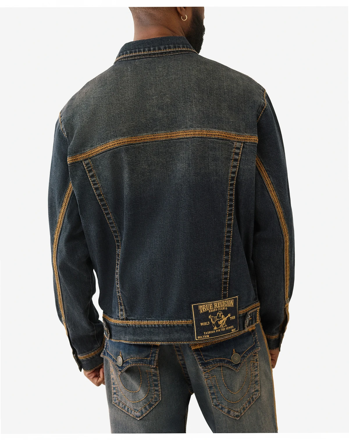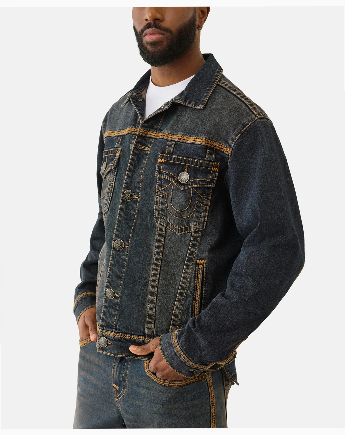 Designed in a dark denim wash, this True Religion trucker jacket features a classic collared, button-down style. It is accented with chest patch and side pockets to keep belongings secure, while antiqued hardware and striking contrast flatlock stitching provide a polished finish.