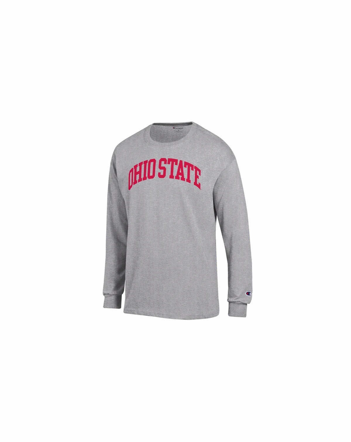 Rep your Ohio State Buckeyes pride in classic style with this Champion Basic Arch Long Sleeve T-shirt. Made from breathable cotton, this T-shirt keeps you cool and comfortable whether you're cheering from the stands or watching the game at home. The classic crew neck and simple arch design of the Ohio State Buckeyes wordmark make it a timeless addition to any fan's wardrobe.