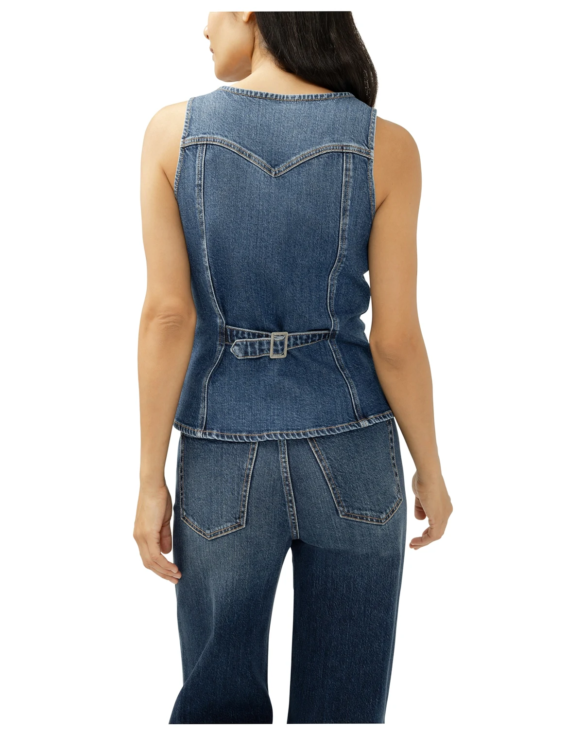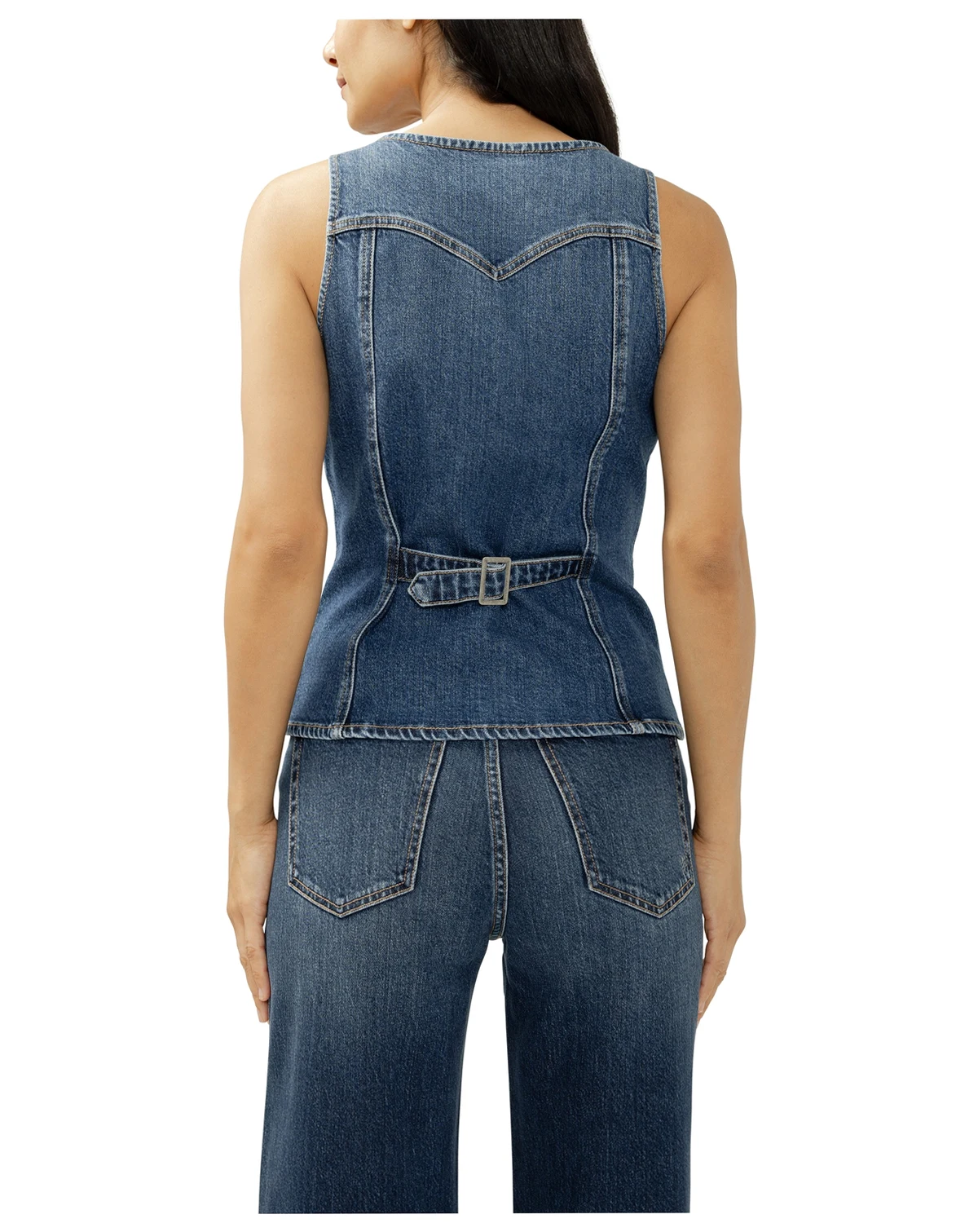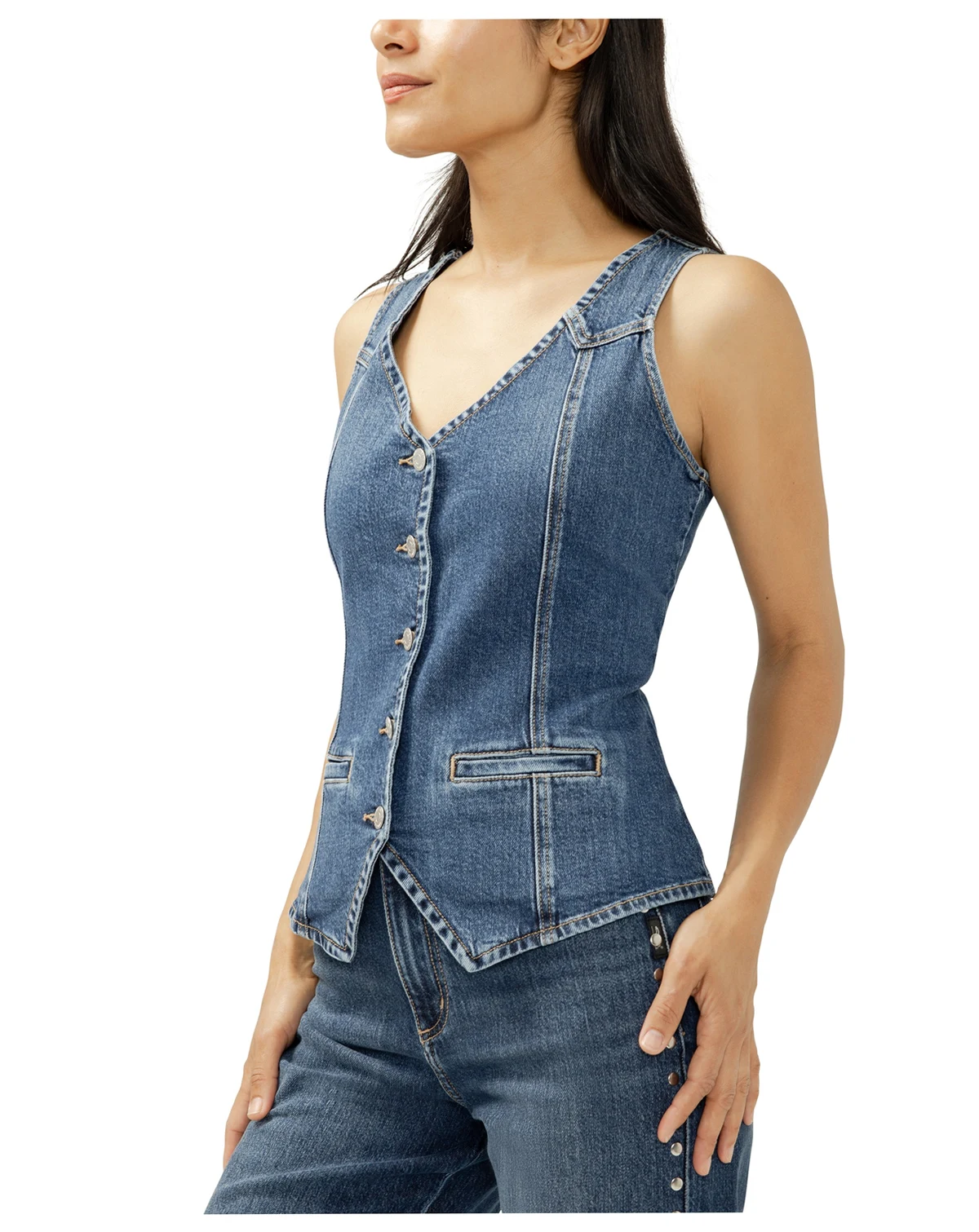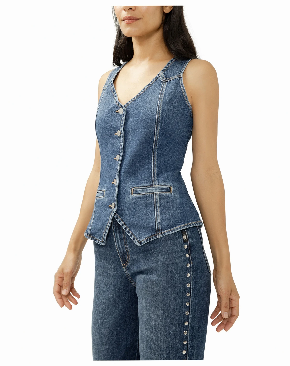 A fresh take on tailoring. This longline denim vest features a V-neck, button front, front welt pockets, and a dramatic pointed hem for a structured yet feminine feel. Plus, it has an adjustable built-in back belt for easy cinching. Designed in mid-stretch denim for comfort and shape that lasts.