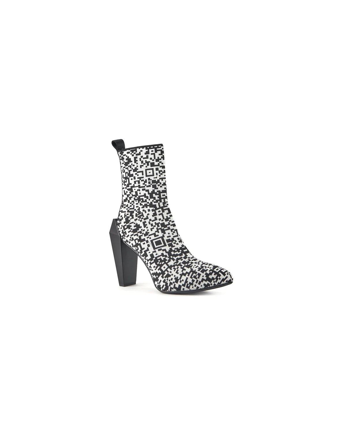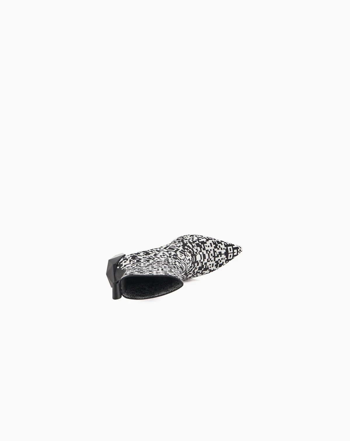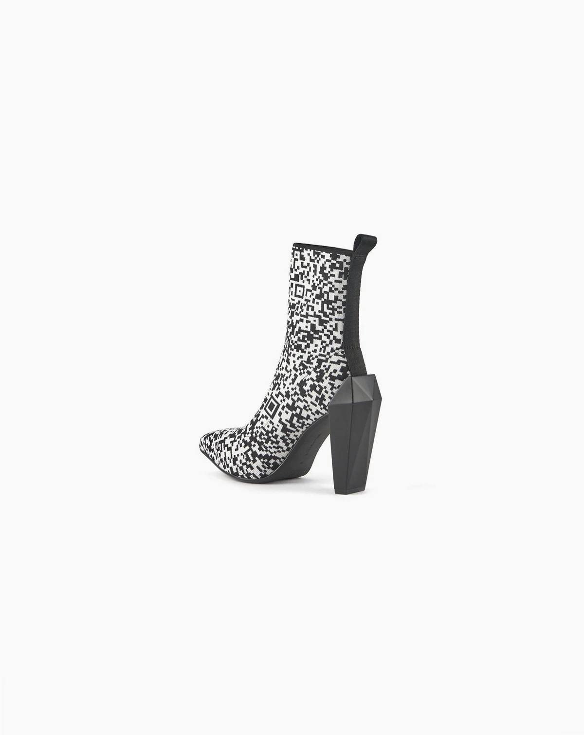 The Gem Bootie Hi is a high-heeled bootie with a leg-hugging sock knit upper. It features a tonal silhouette, a pointed-toe and a distinct gem-shaped block heel. Lightweight matte-finished ABS heel.