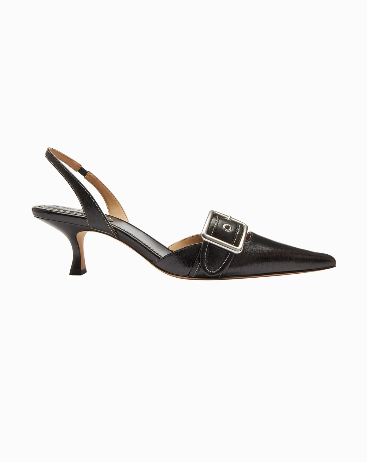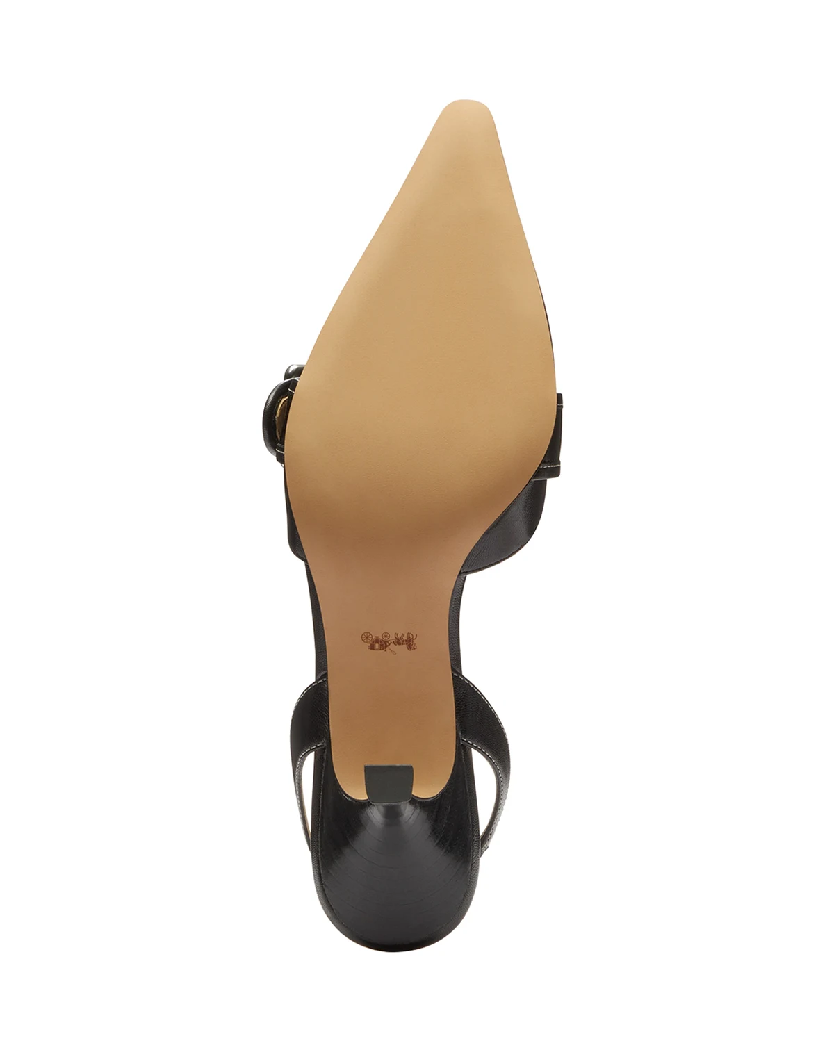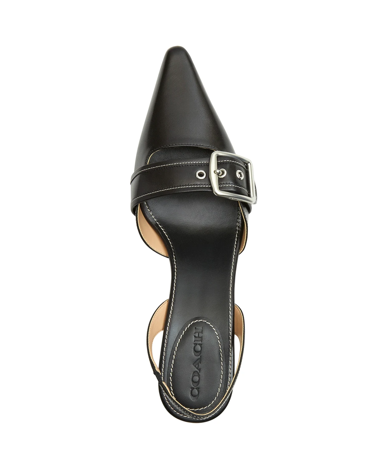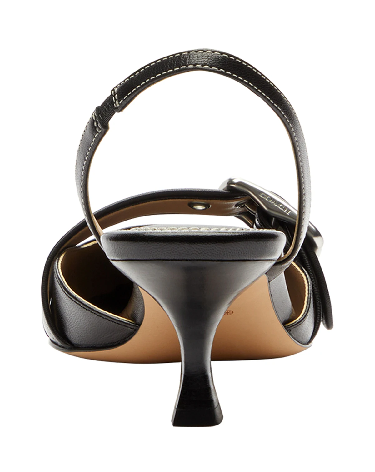 Featuring a sleek heel type, these COACH slingback pumps offer a sophisticated profile. The slip-on design and pointed toe create a timeless and elegant appeal.