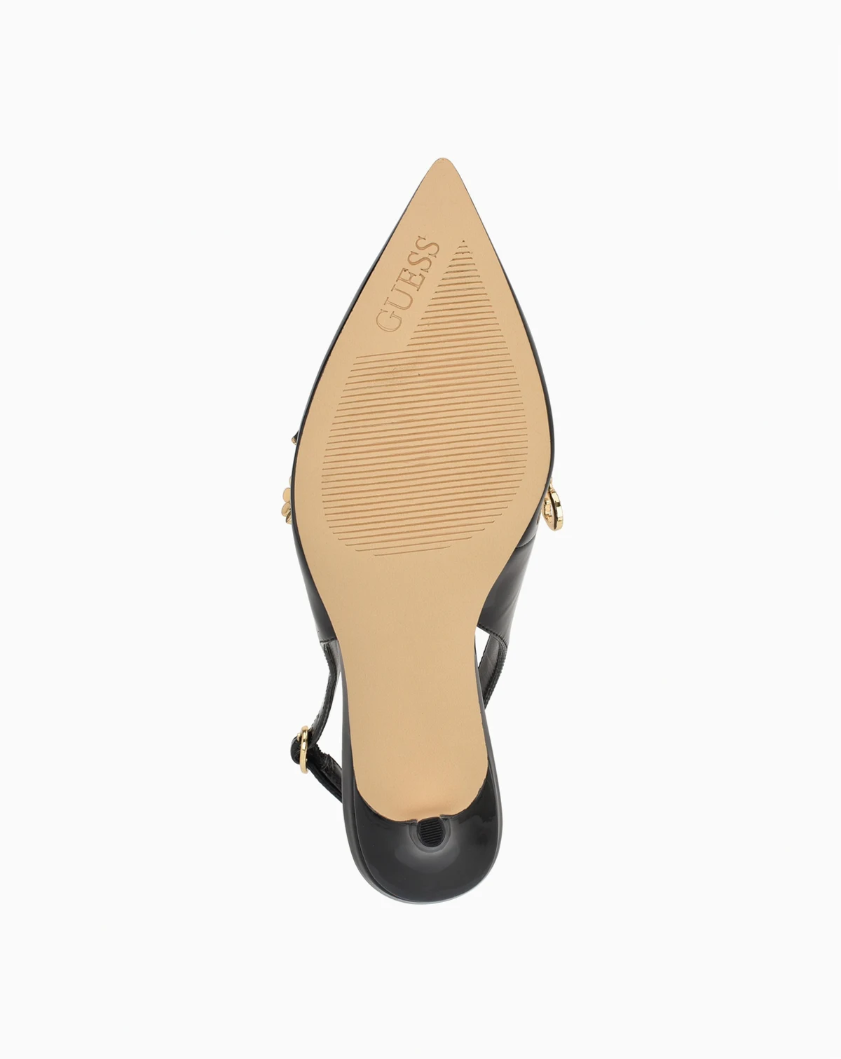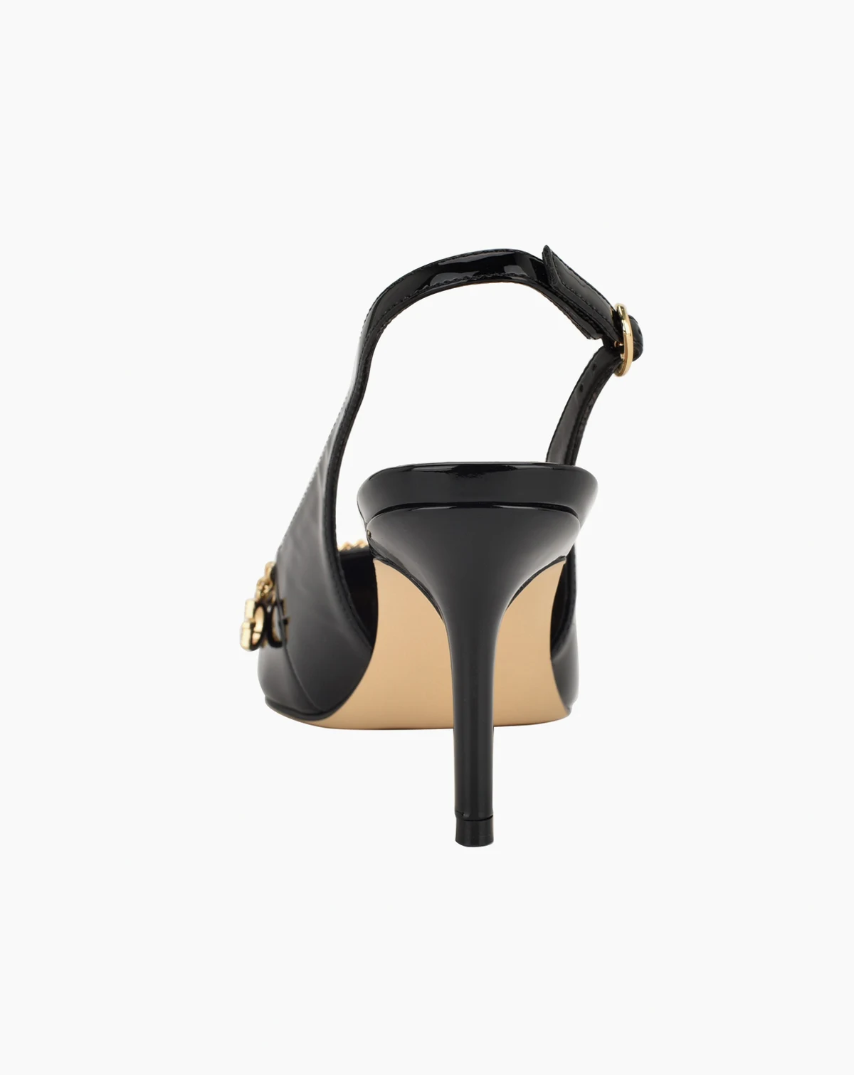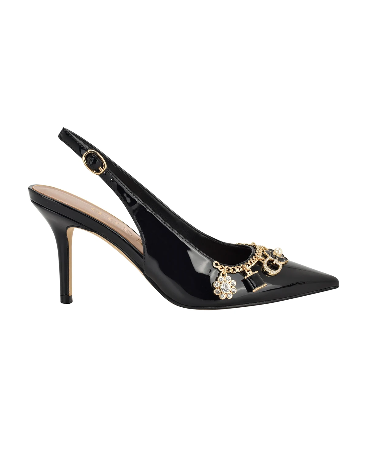 A classic pointed toe slingback pump gets a charming touch in Naska by Guess. Accented with a chain, the Guess charms hang to accessorize this look. Est. 1981, Guess is a global lifestyle brand and a symbol of a young, adventurous lifestyle.