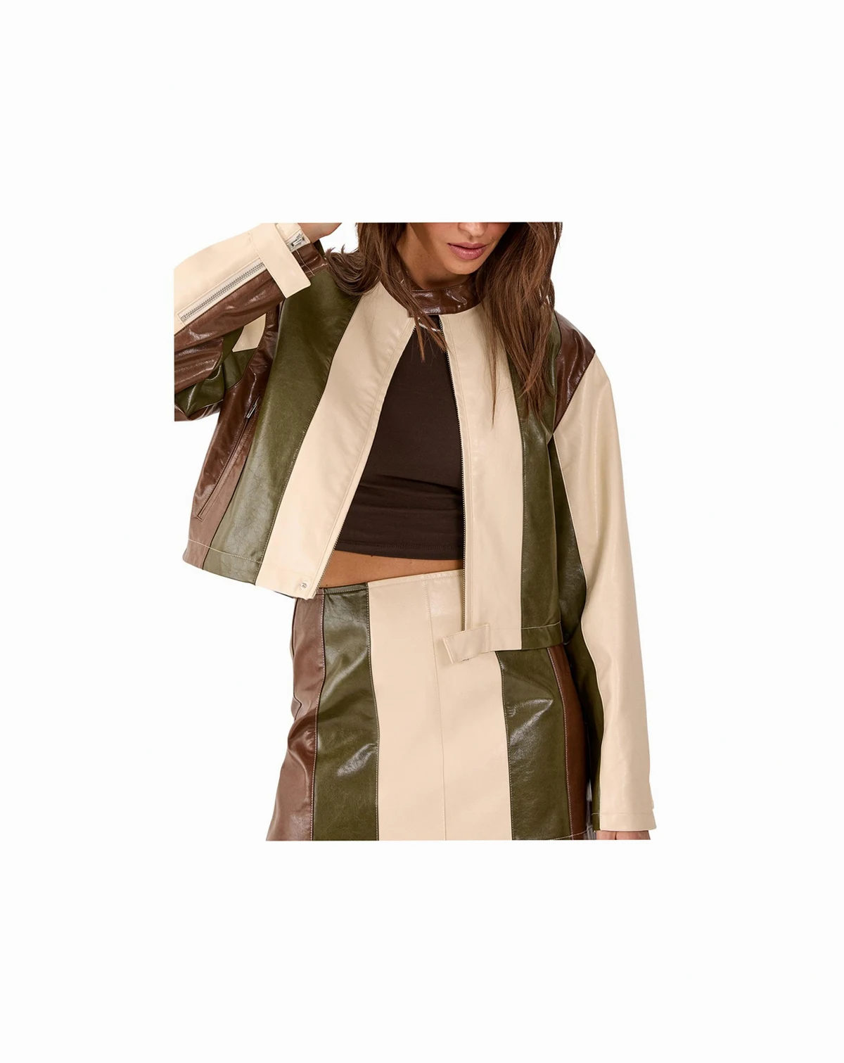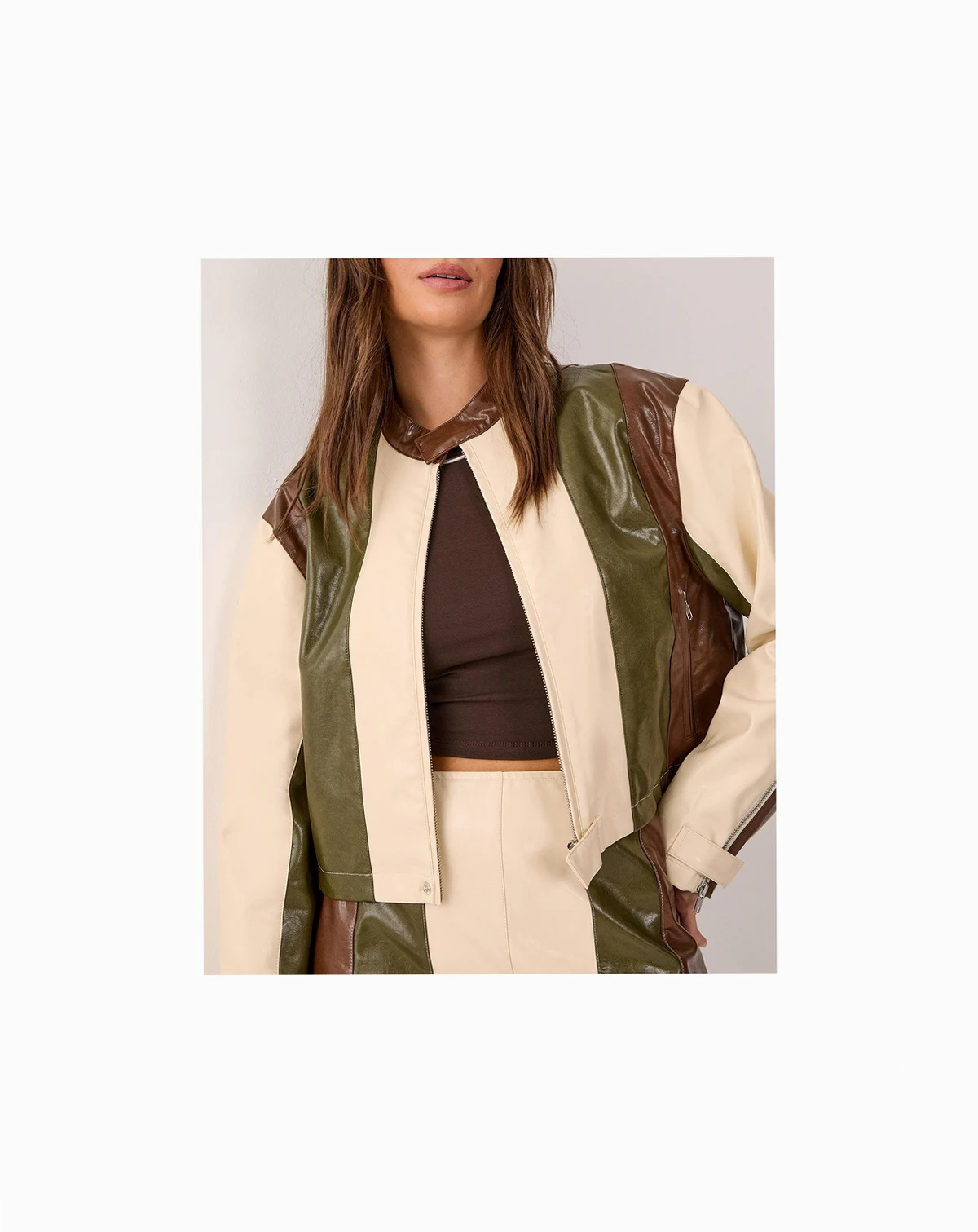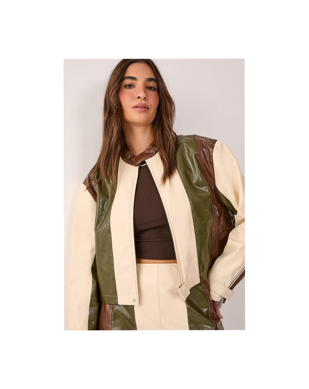 Striking panelled design with bold colour blocking for a contemporary edge. Classic biker silhouette with modern proportions and clean lines. Faux leather construction with contrasting textures for added visual interest. Versatile cropped length perfect for layering over various outfits. Coordinating mini skirt available for a complete statement ensemble. Make a bold fashion statement with this eye-catching panelled colour block faux leather biker jacket from nastygal.