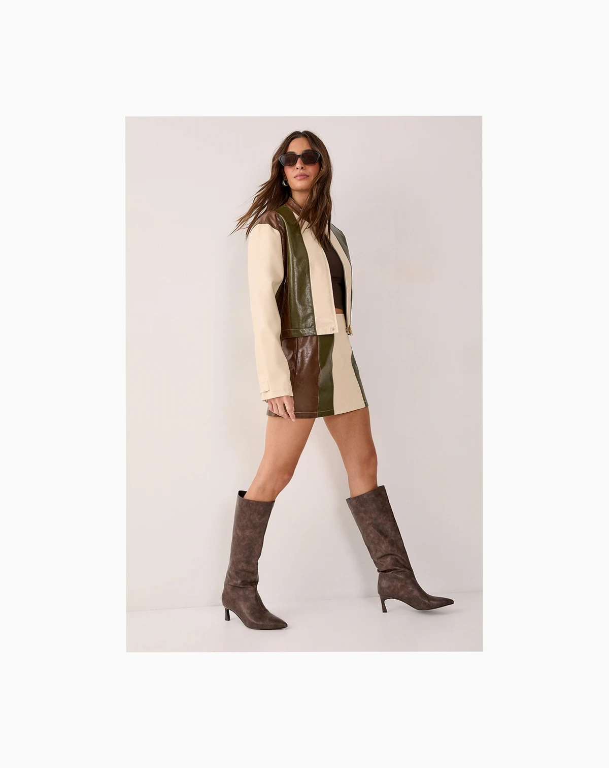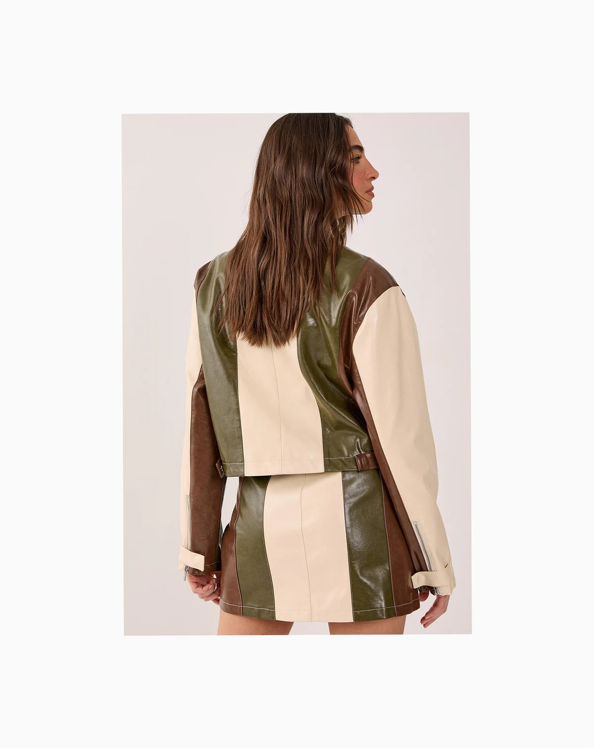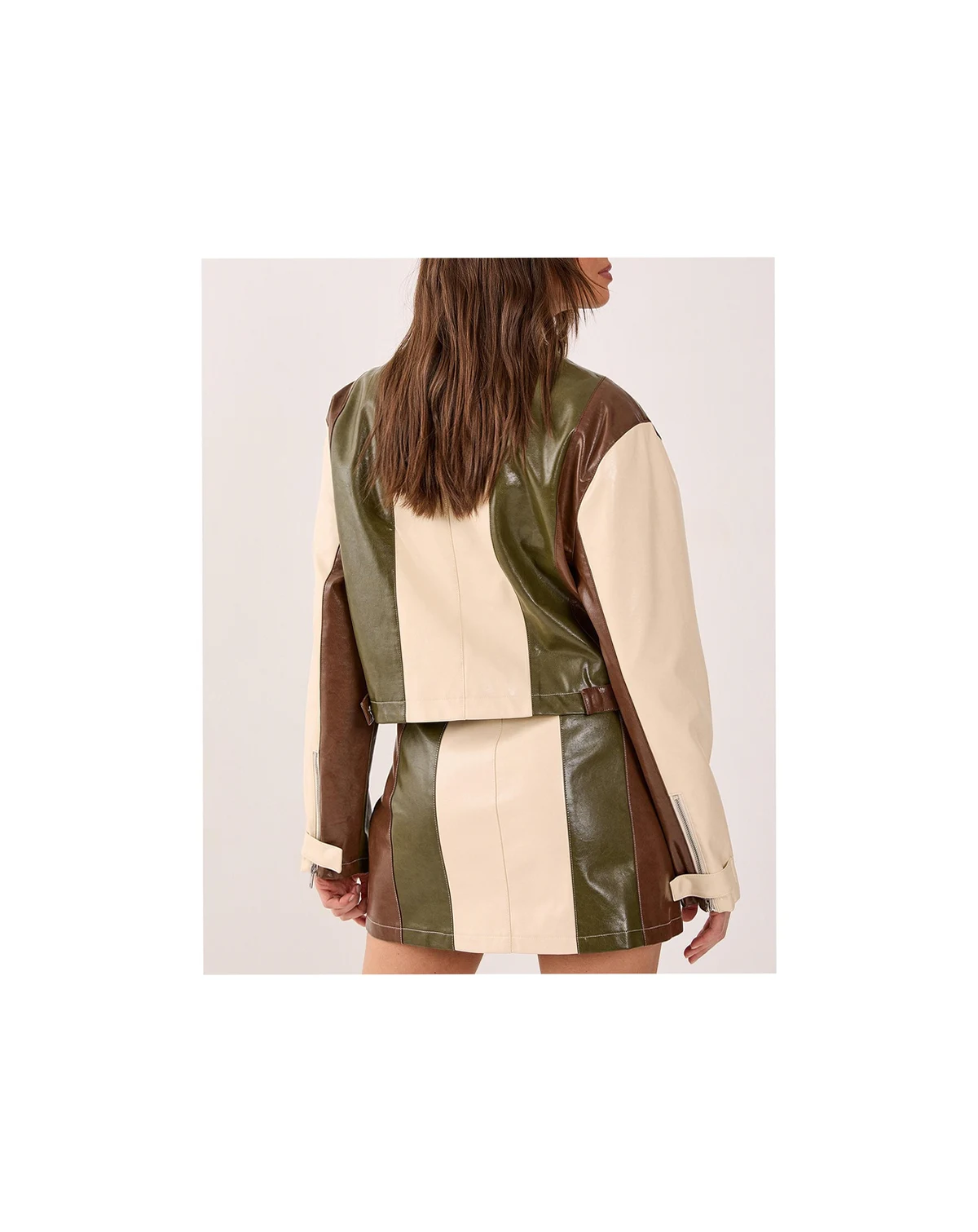 Striking panelled design with bold colour blocking for a contemporary edge. Classic biker silhouette with modern proportions and clean lines. Faux leather construction with contrasting textures for added visual interest. Versatile cropped length perfect for layering over various outfits. Coordinating mini skirt available for a complete statement ensemble. Make a bold fashion statement with this eye-catching panelled colour block faux leather biker jacket from nastygal.
