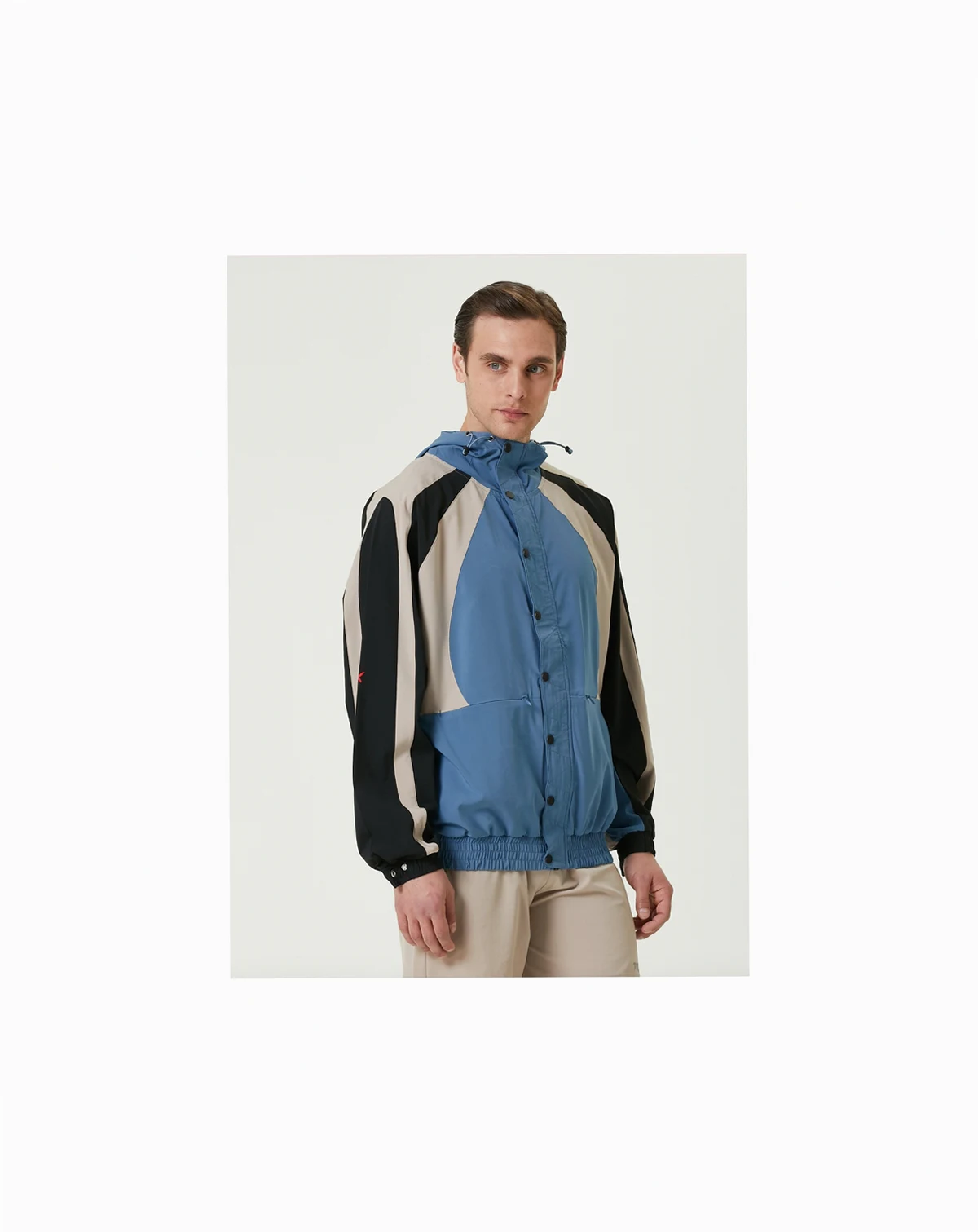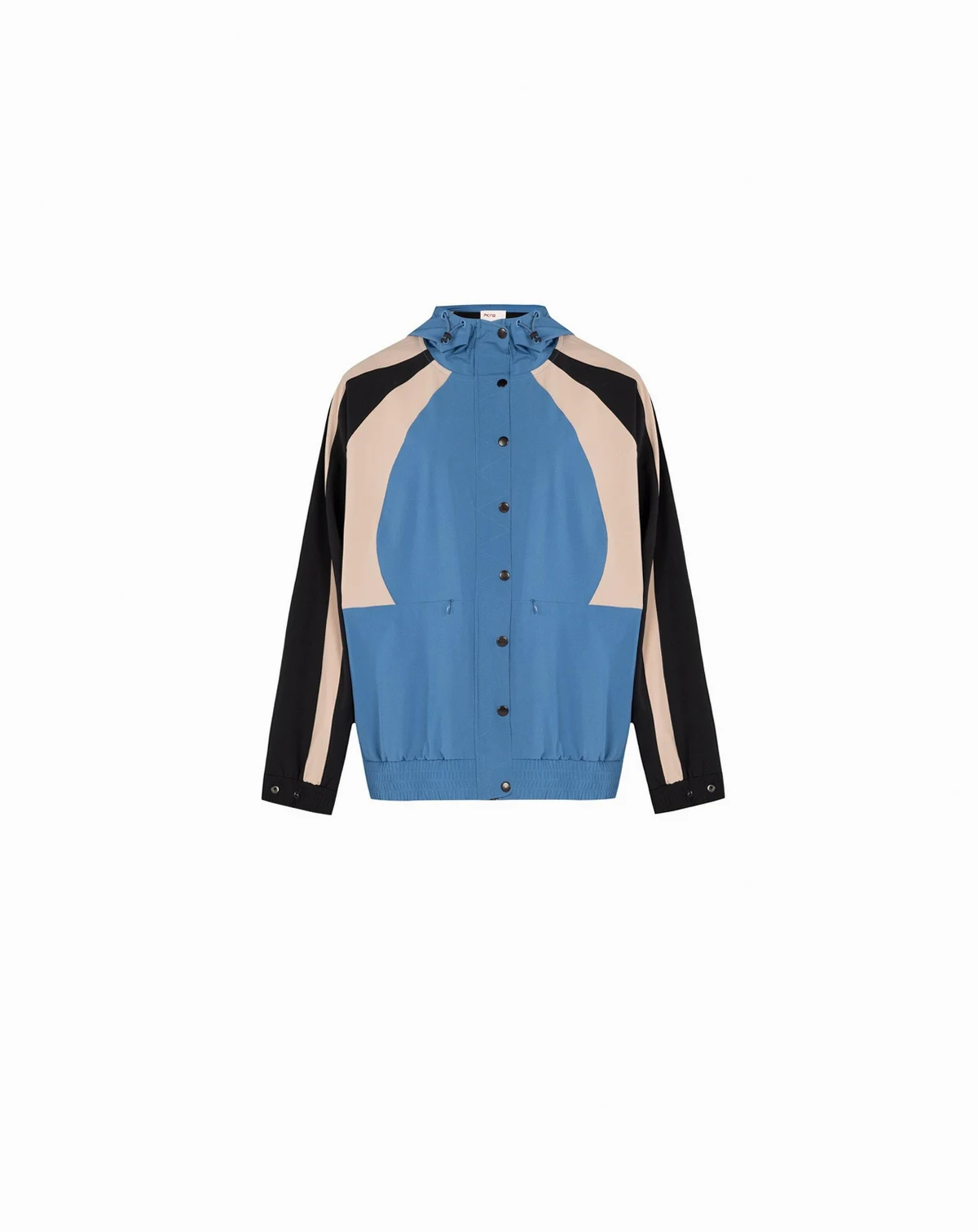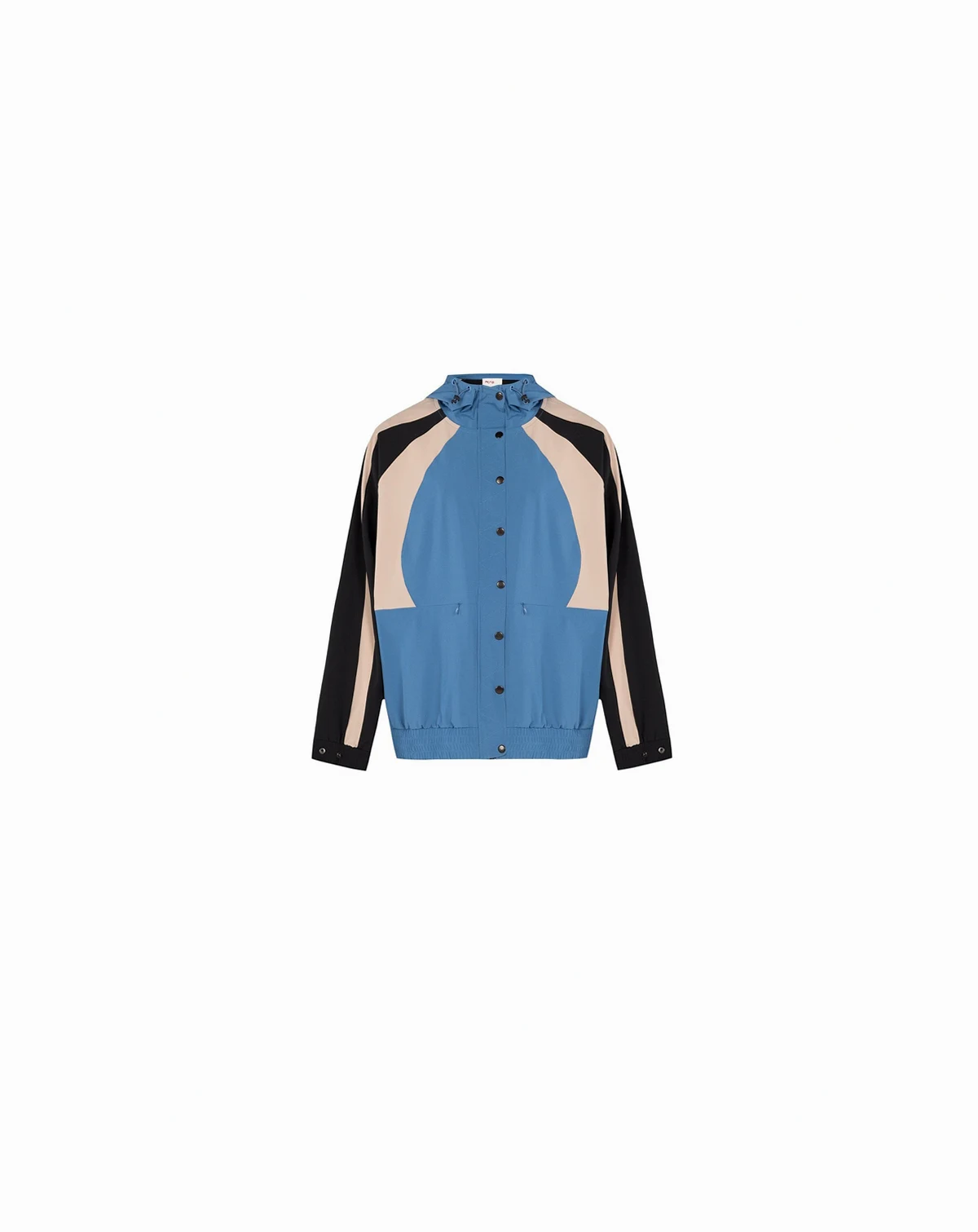 The blue sporty jacket features a front snap closure and elastic waist for a comfortable fit. Its hood and tri-color geometric patterns create a modern, athletic style.