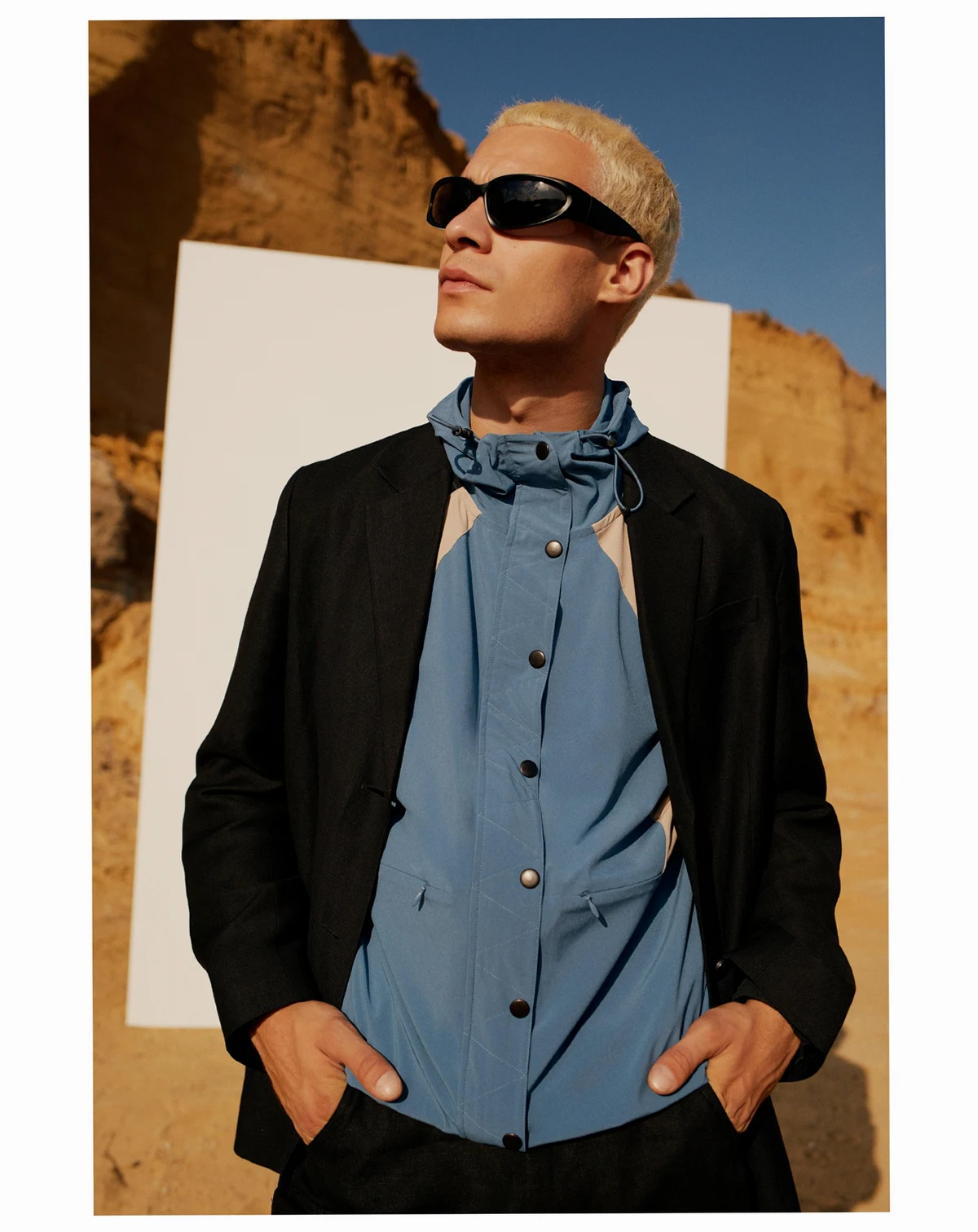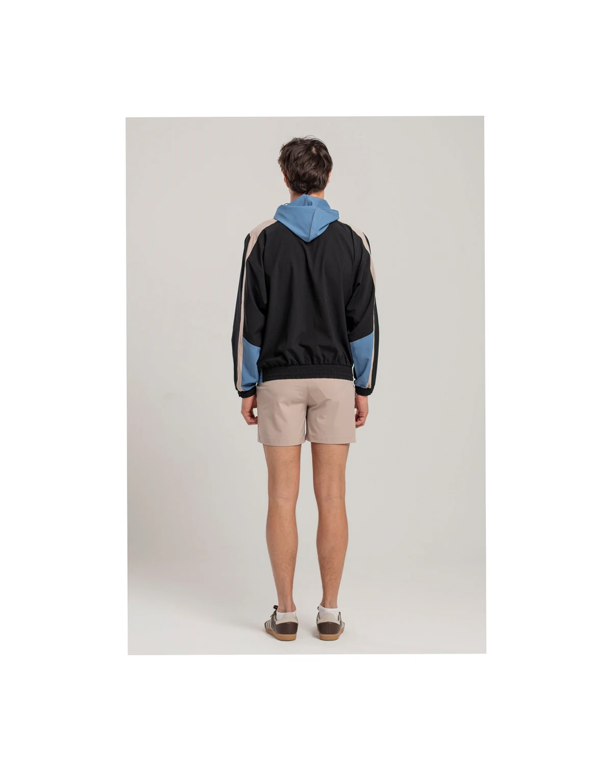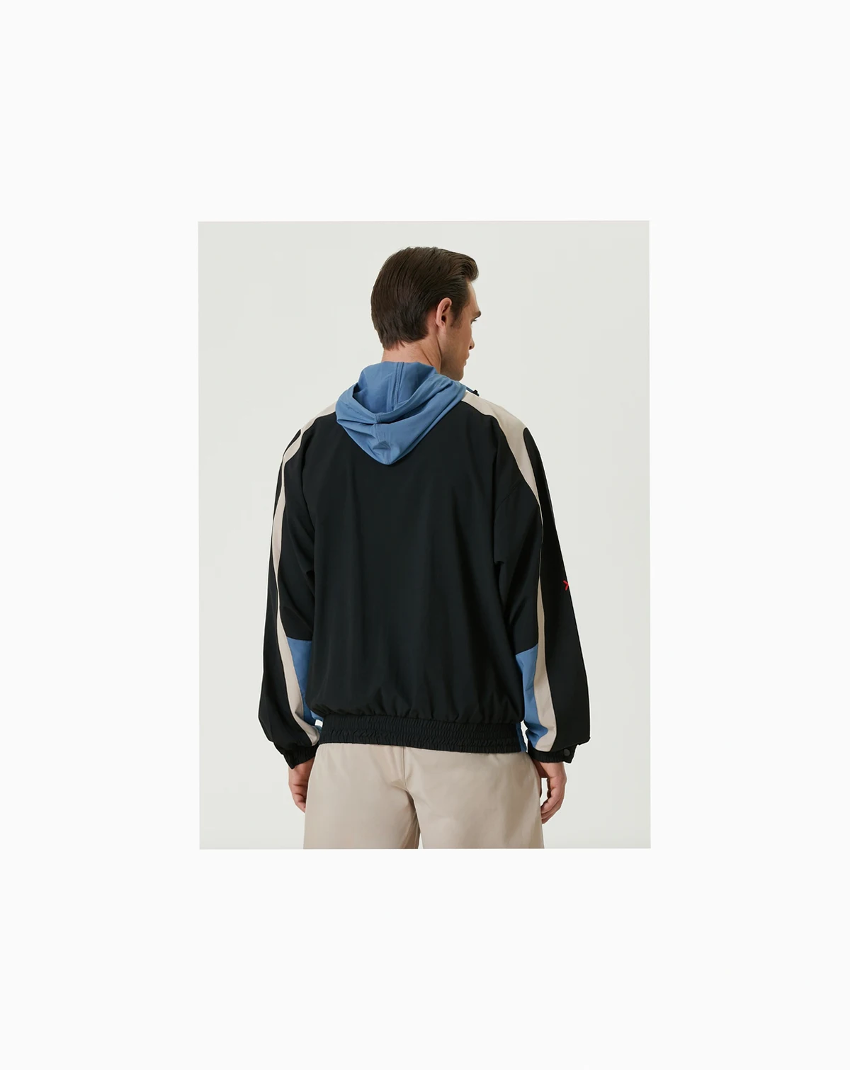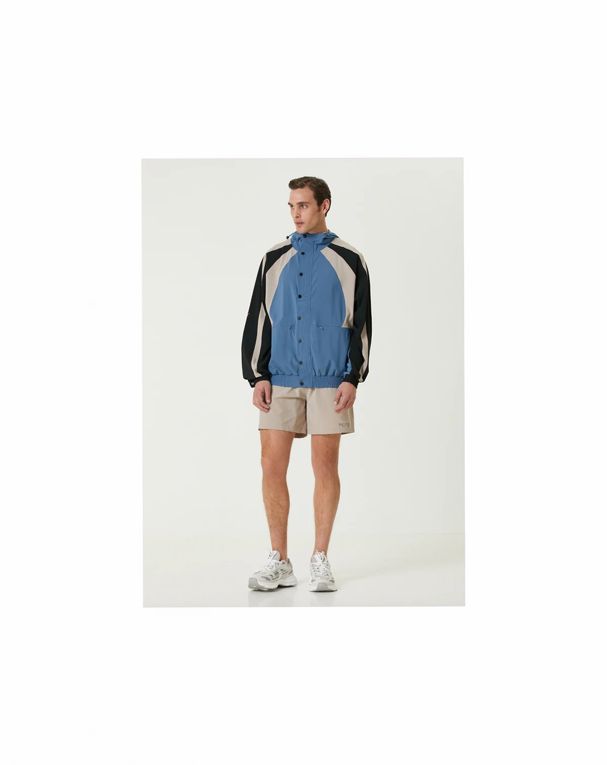 The blue sporty jacket features a front snap closure and elastic waist for a comfortable fit. Its hood and tri-color geometric patterns create a modern, athletic style.
